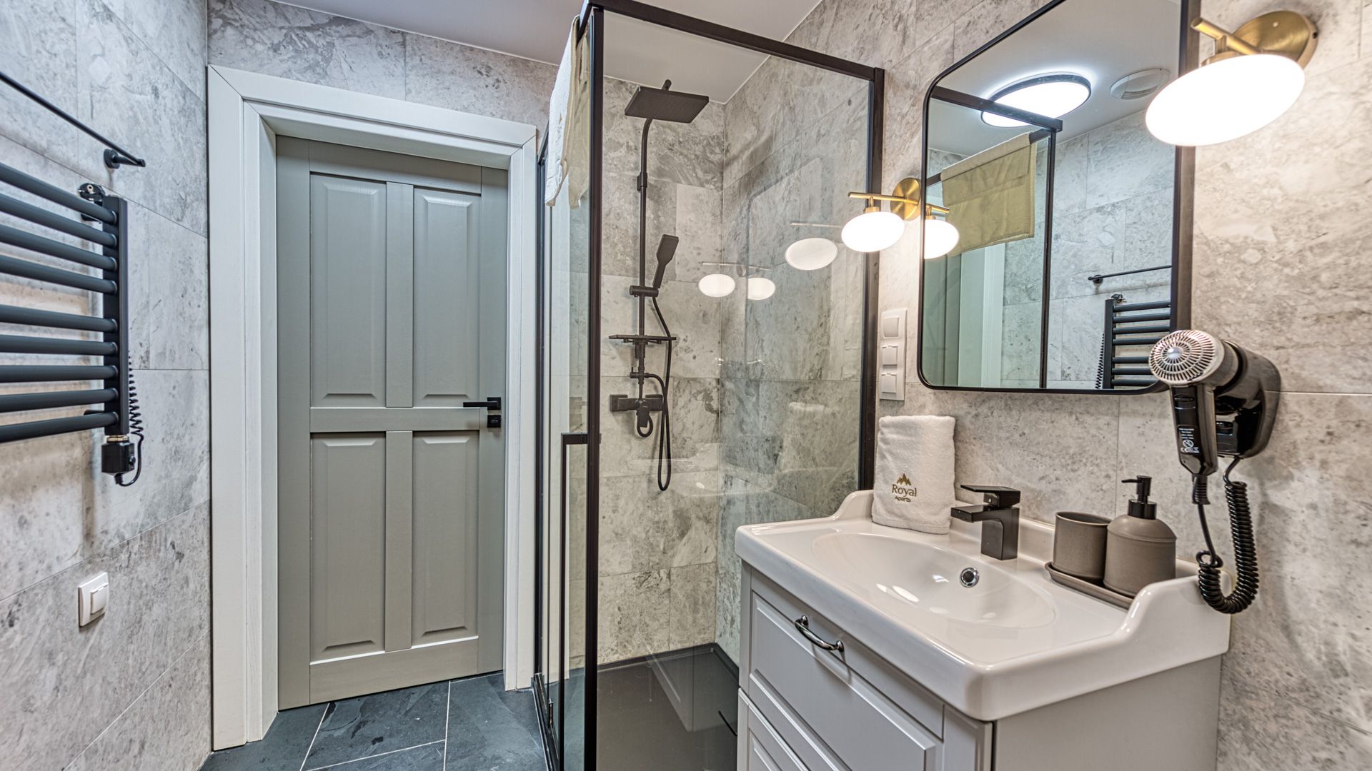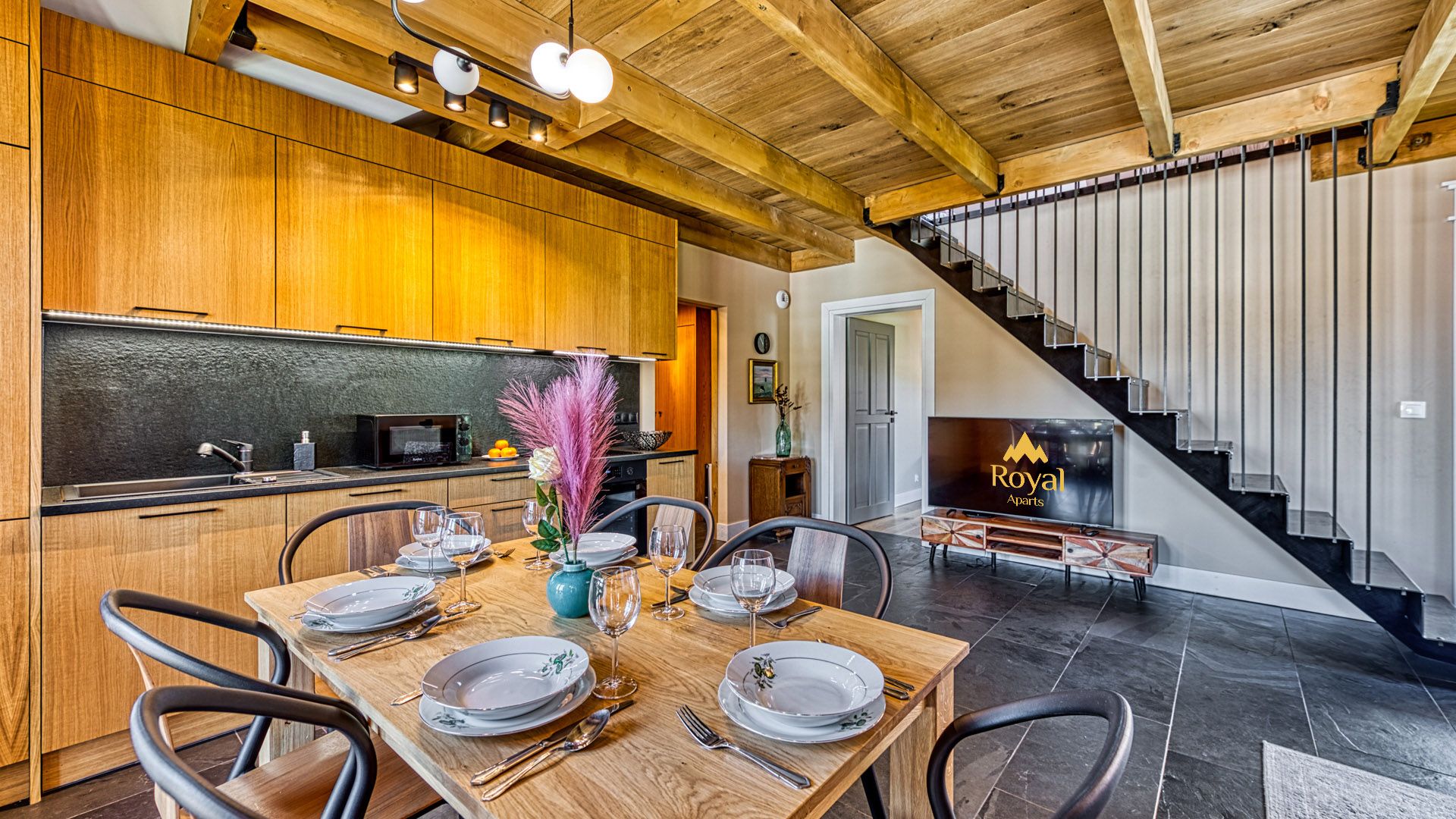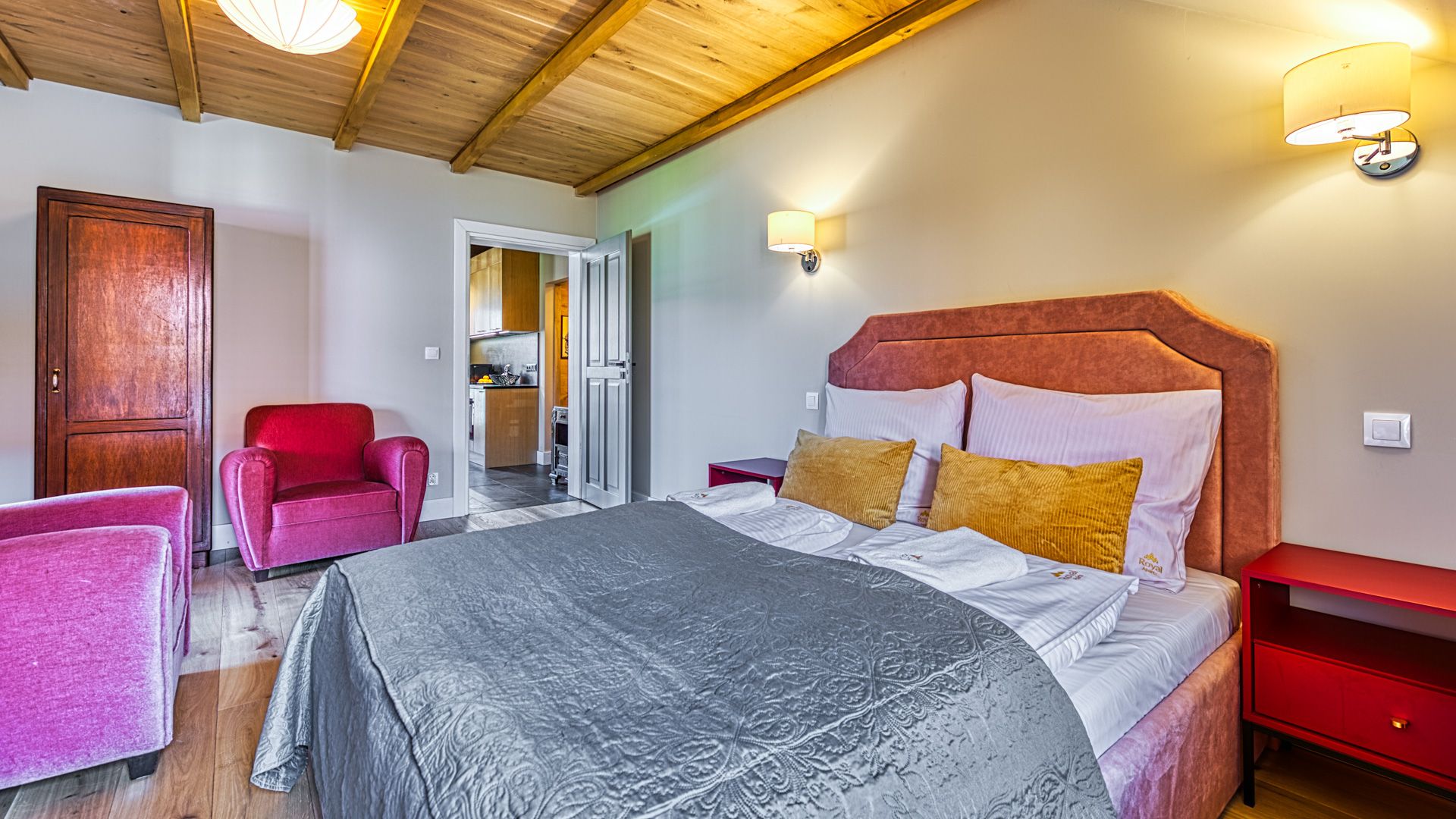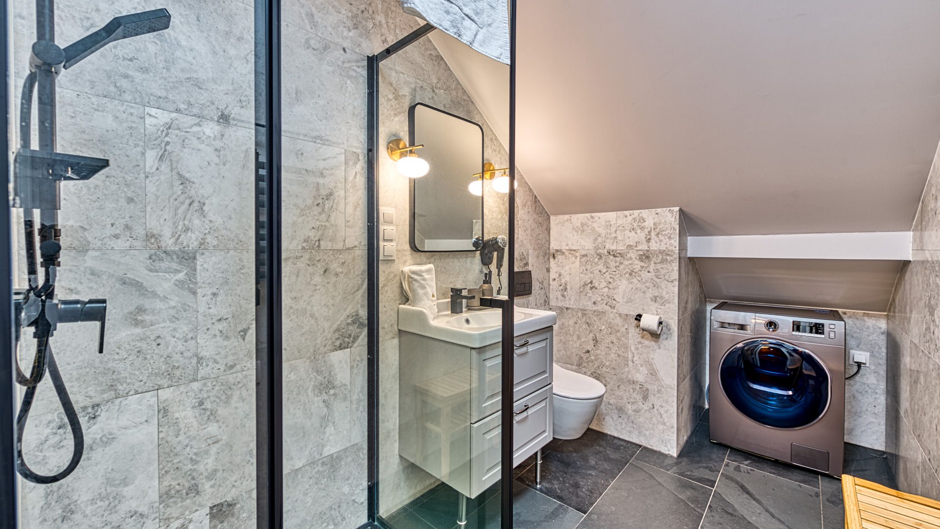 Sam aneks kuchenny posiada bogate wyposażenie, które pozwoli na przygotowanie pysznych posiłków. W jego skład wchodzą m.in. czajnik, talerze i sztućce, płyta kuchenna, lodówka, ekspres do kawy, opiekacz, mikrofalówka, zmywarka, piekarnik. W ładnie urządzonej łazience mieści się prysznic, toaleta, pralka, zlew i lustro. Obszerny balkon pozwoli zachwycić się pięknymi widokami, np. podczas picia porannej kawy. W lokalu znajduje się także duży, płaski telewizor oraz bezpłatny internet WiFi. W budynku wygospodarowany jest schowek na sprzęt sportowy itp.