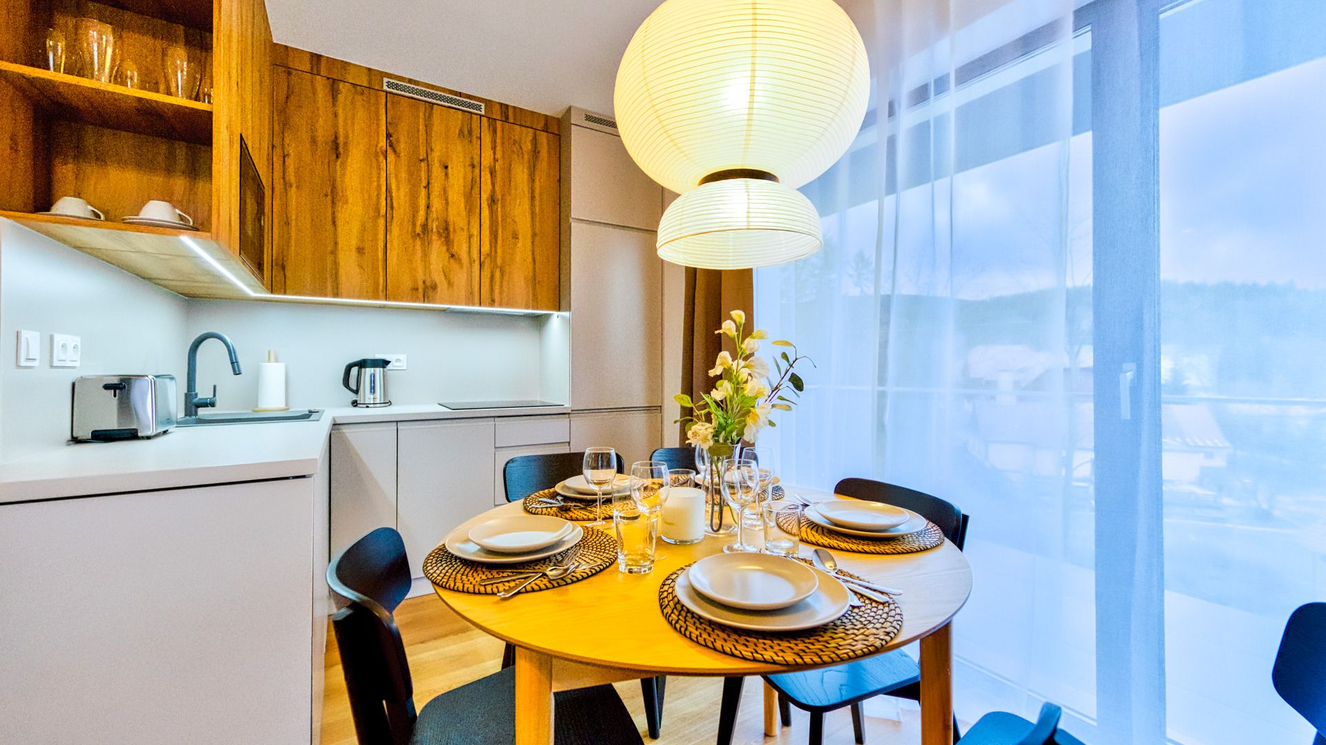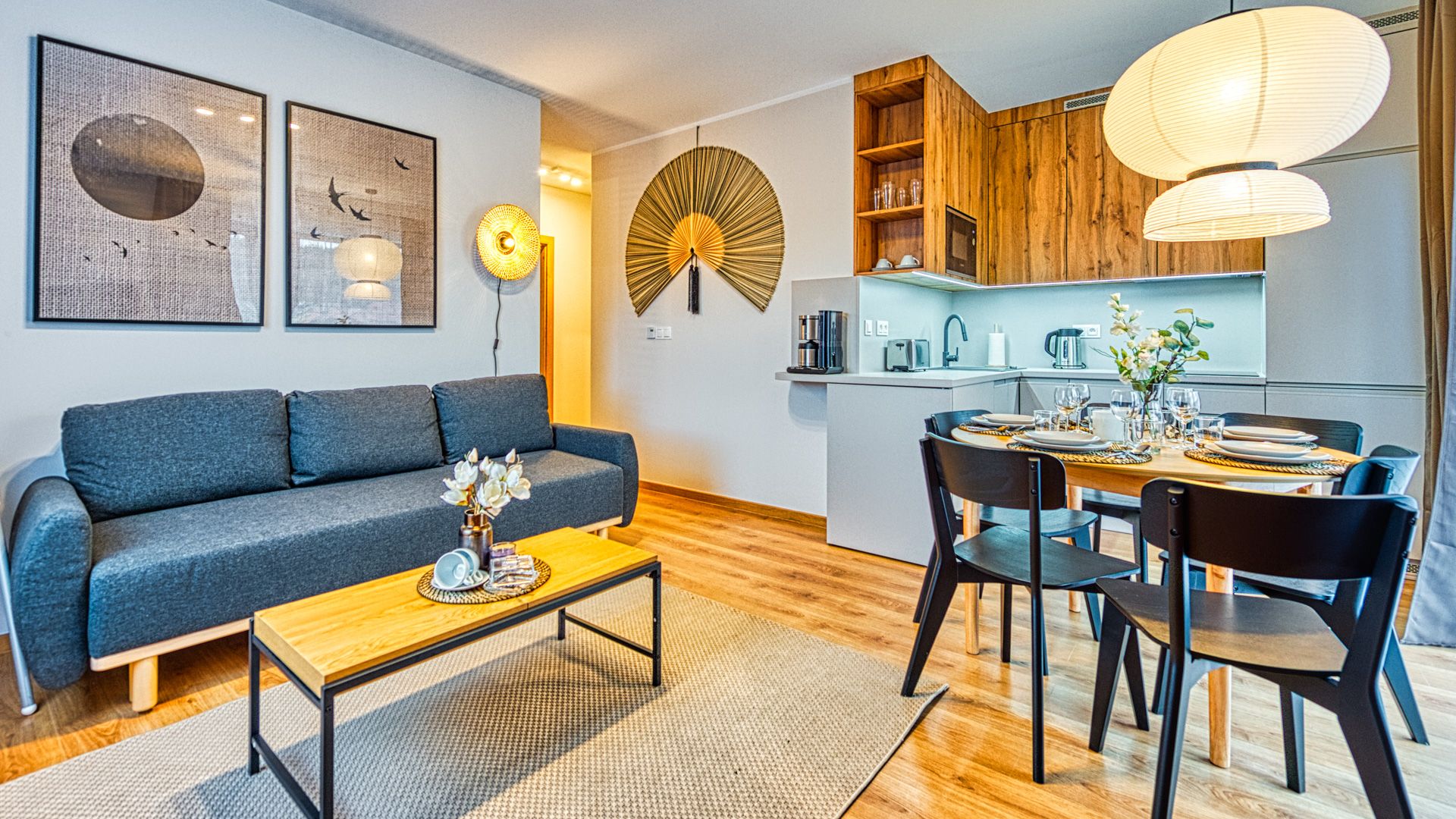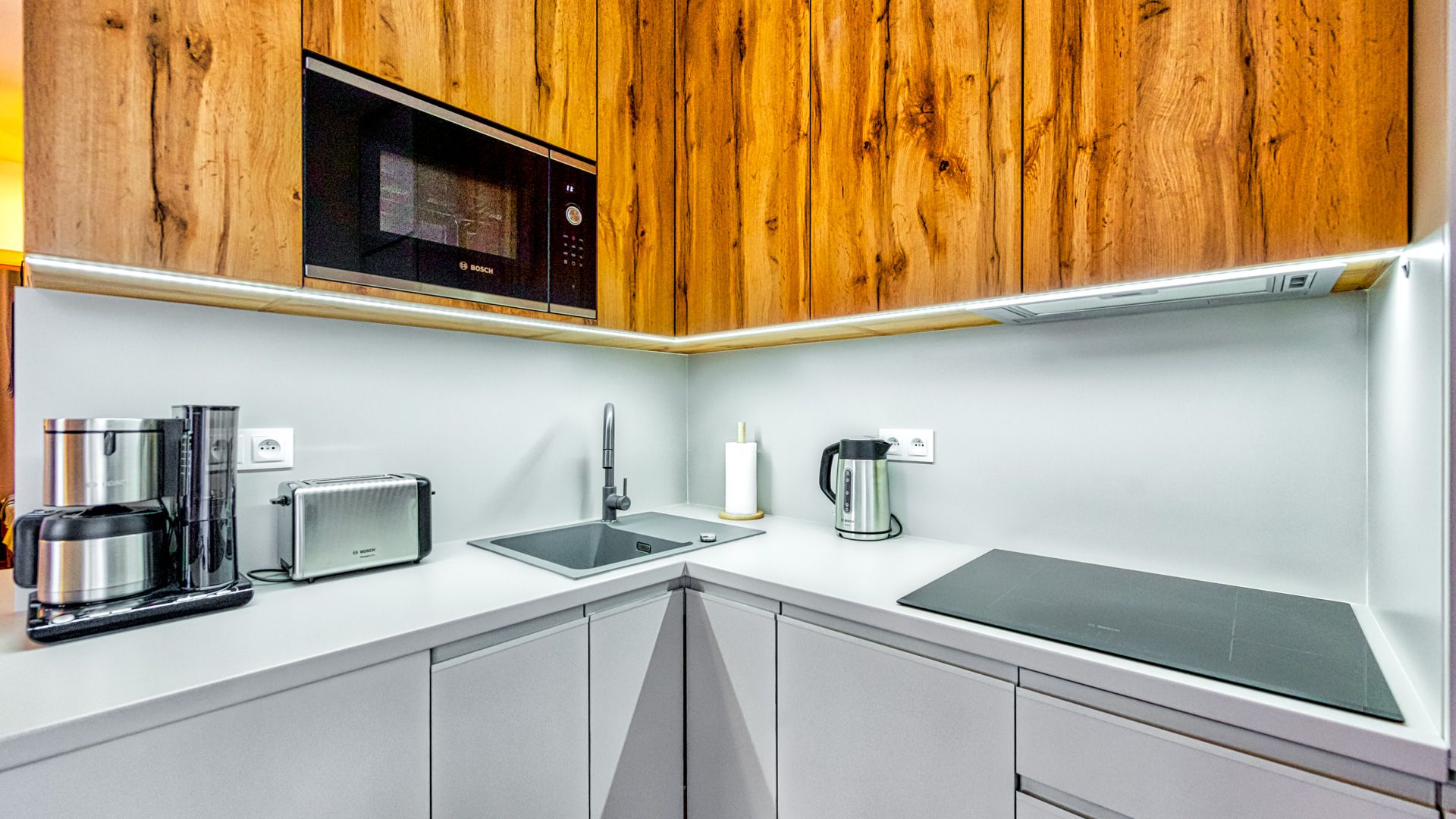 Obszerny balkon będzie ulubionym miejscem Gości na poranną kawę, a w pełni wyposażona kuchnia umożliwi przygotowanie nawet uroczystej kolacji. W skład wyposażenia wchodzą m.in.: talerze i sztućce, płyta kuchenna wraz z garnkami i patelnią, mikrofalówka, zmywarka oraz ekspres do kawy. Atutem apartamentu jest również nowoczesna pralka.
