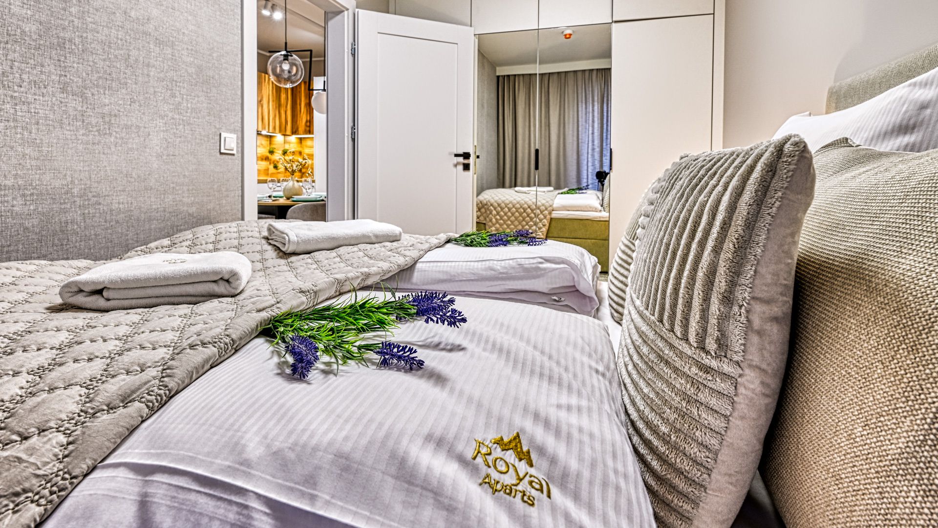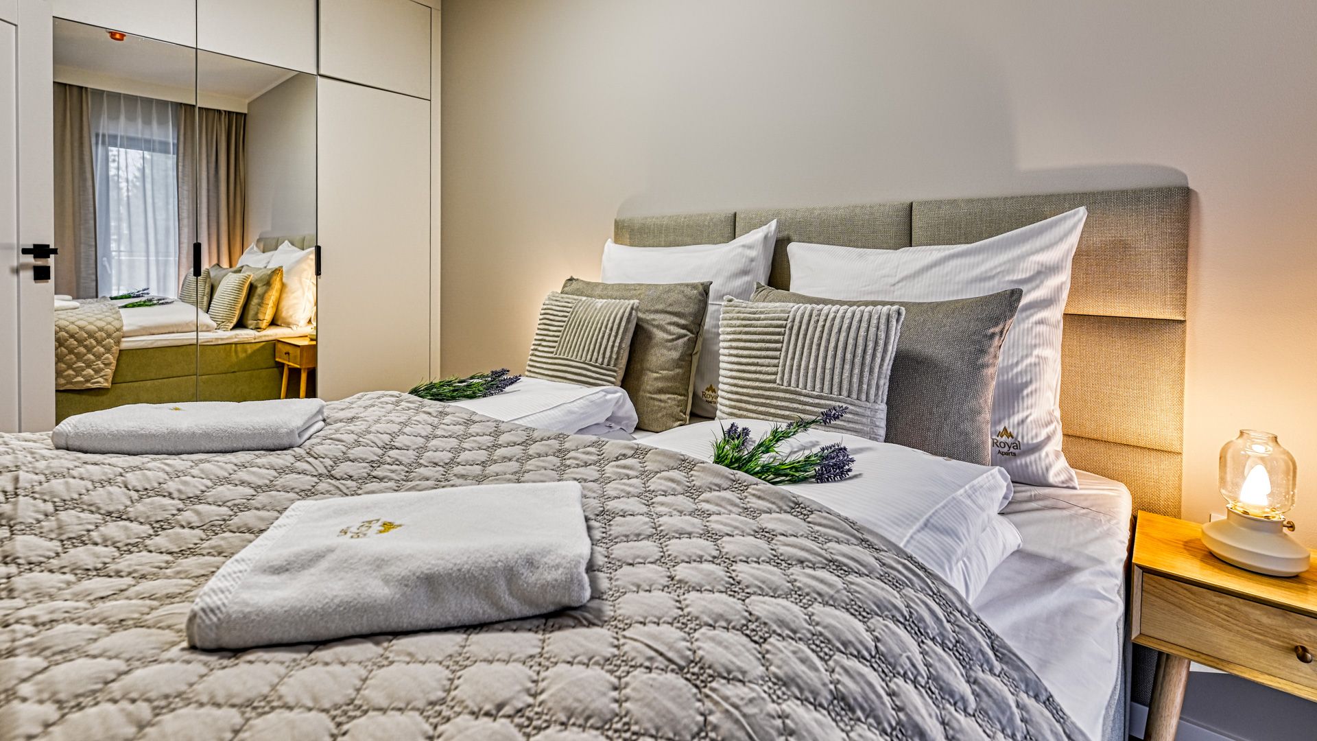 Sypialnia z dużym, dwuosobowym łóżkiem oraz pojemną szafą zapewnia prywatność i wygodę, tworząc idealne warunki do regeneracji sił.