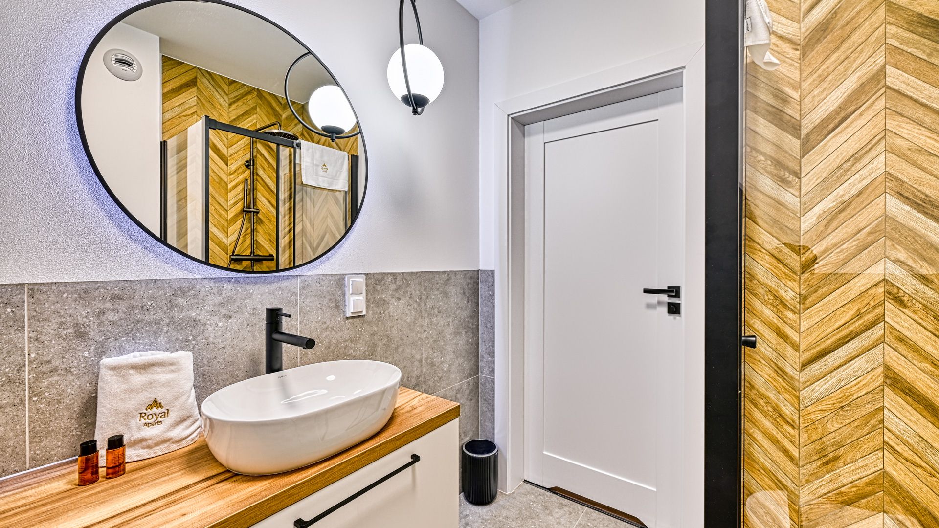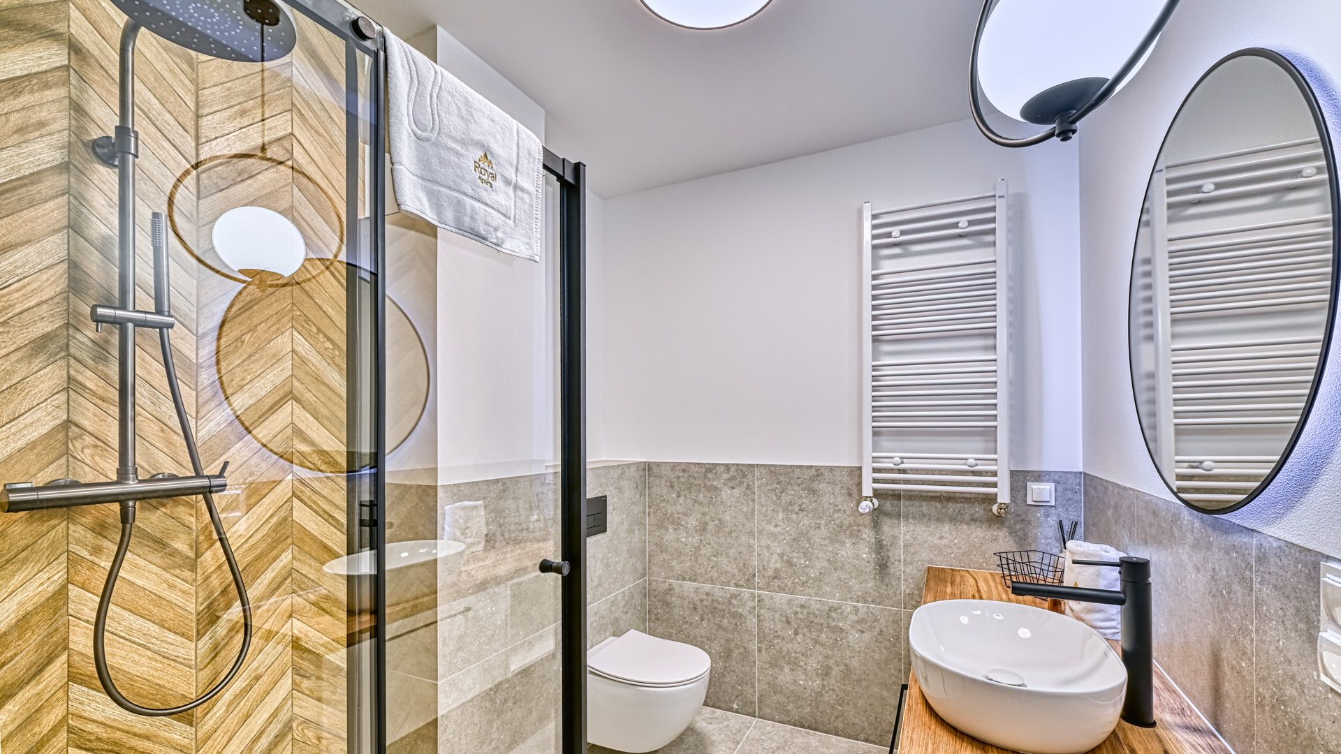 Elegancka, nowoczesna łazienka została wyposażona w wysokiej jakości armaturę i przestronny prysznic, co gwarantuje komfort użytkowania.