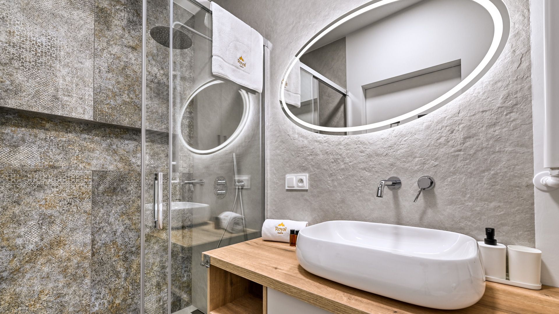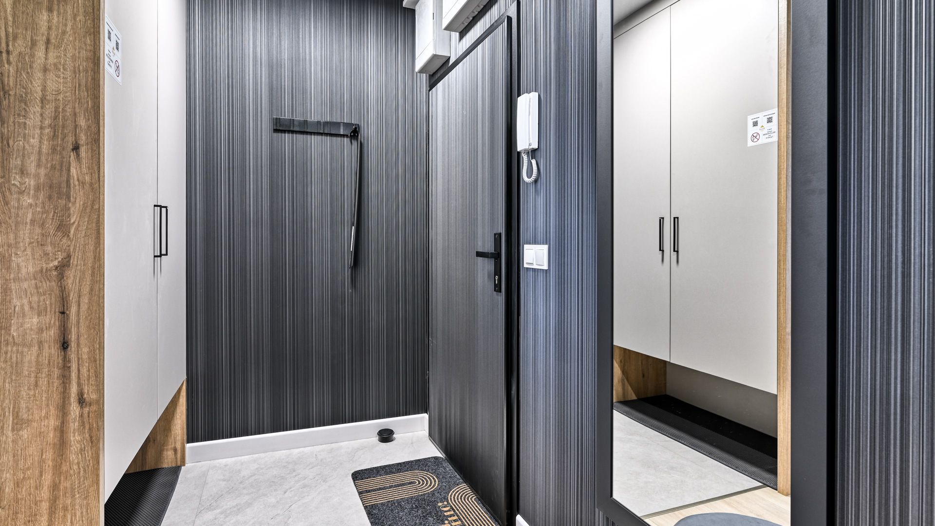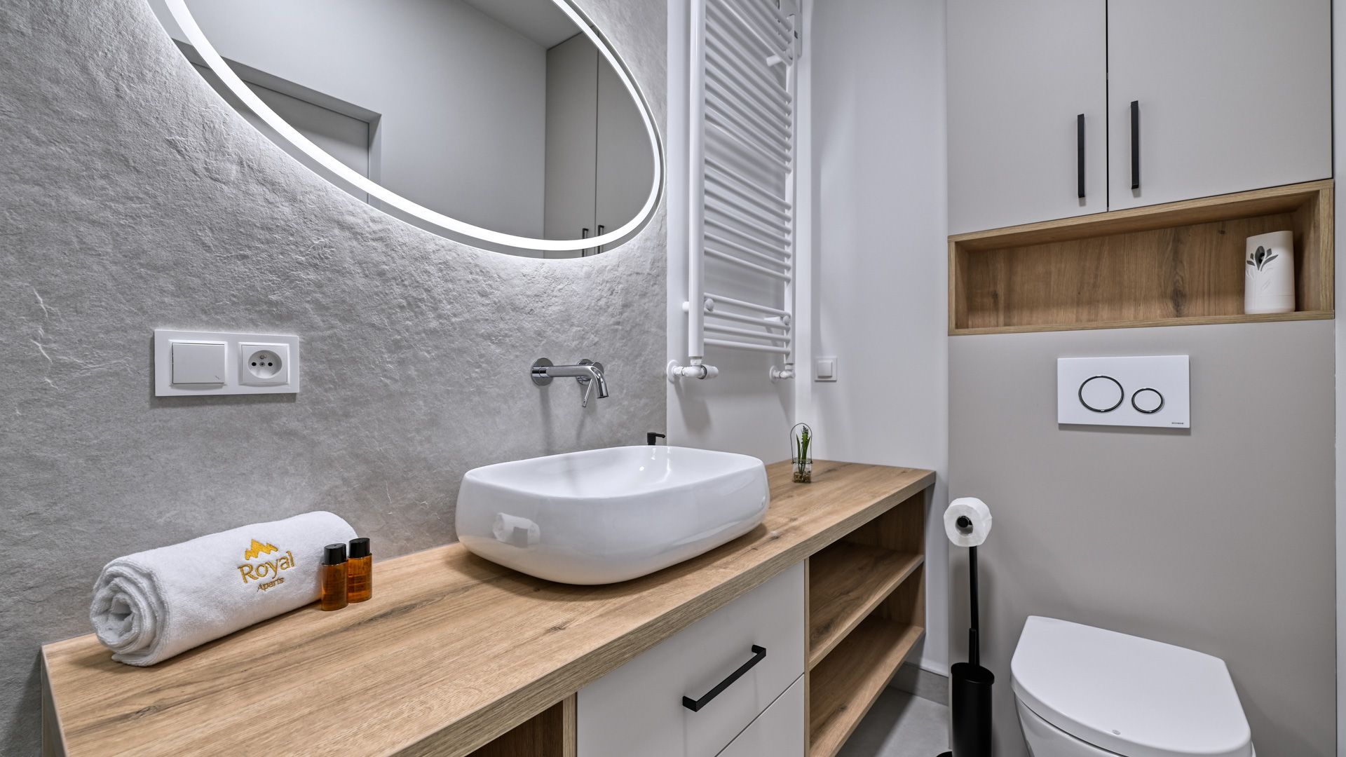 Elegancka, nowoczesna łazienka została wyposażona w wysokiej jakości armaturę, przestronny prysznic oraz pralkę, co gwarantuje dodatkowy komfort użytkowania podczas dłuższego pobytu.