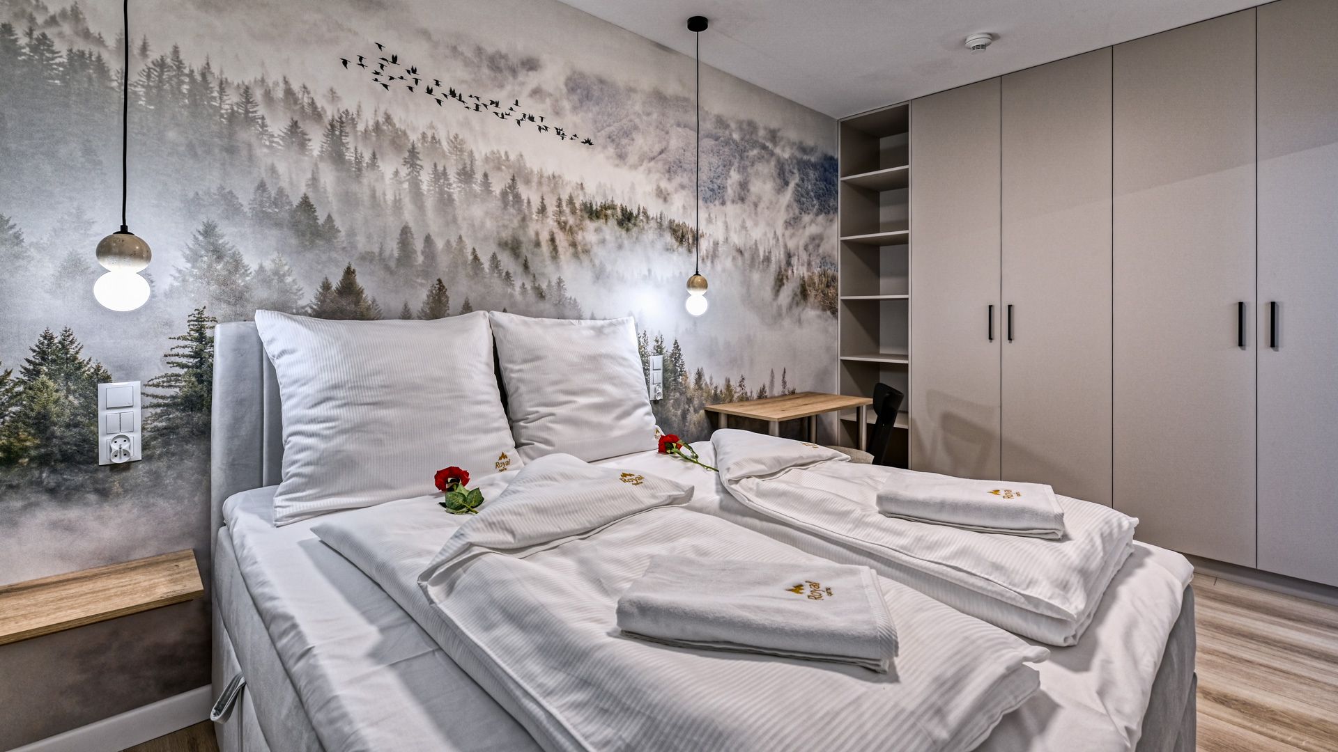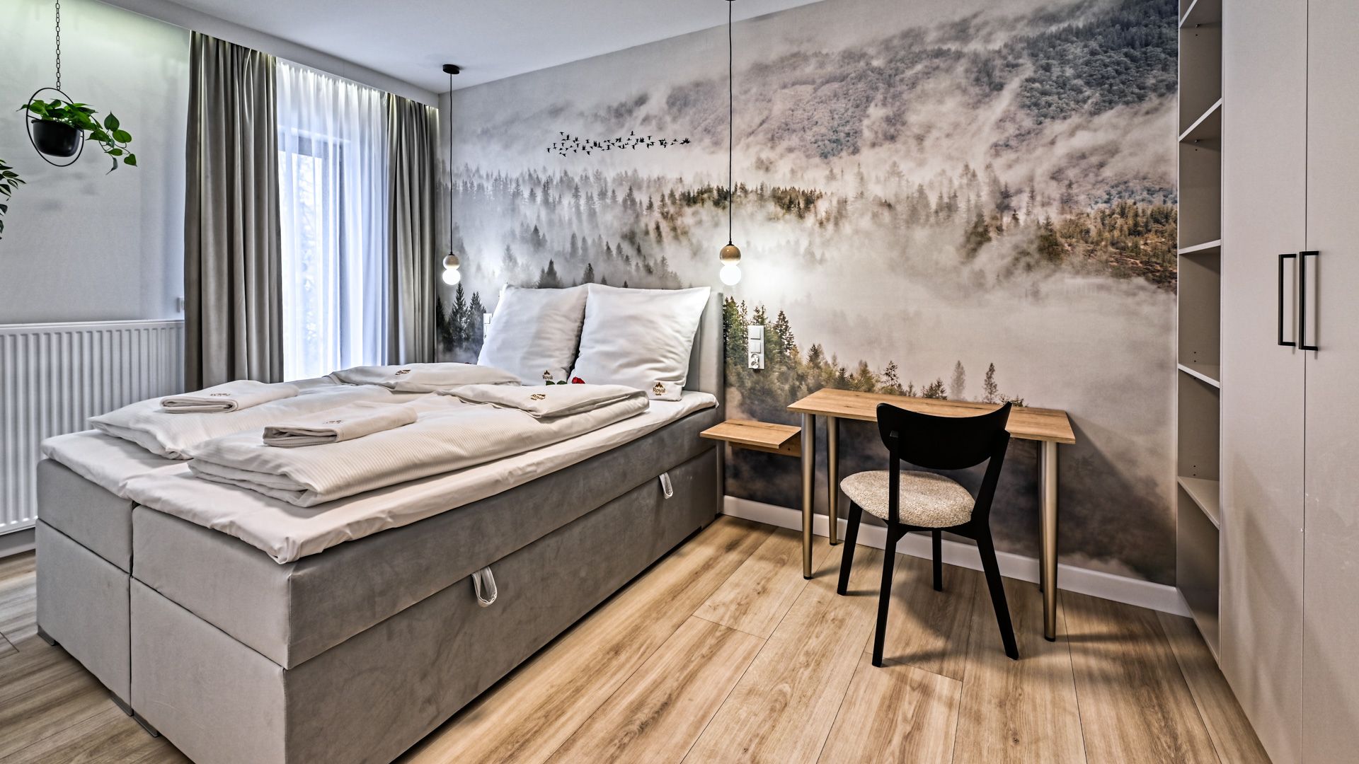 Sypialnia z dużym, dwuosobowym łóżkiem, pojemną szafą oraz praktycznym biurkiem zapewnia prywatność i wygodę, tworząc idealne warunki zarówno do odpoczynku, jak i do pracy zdalnej.