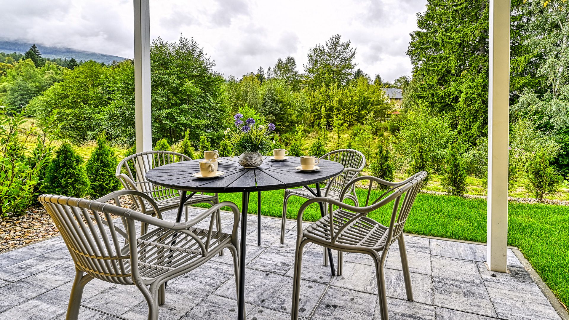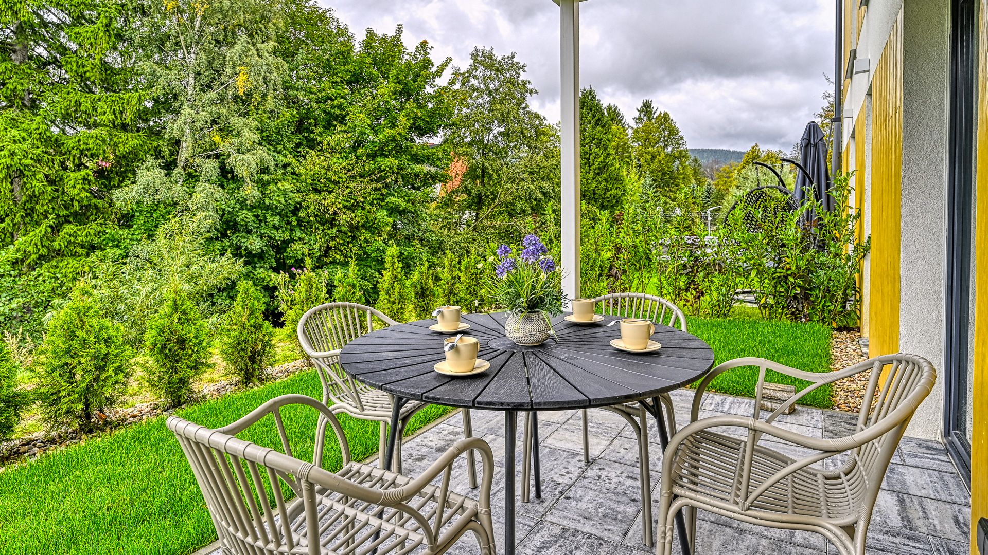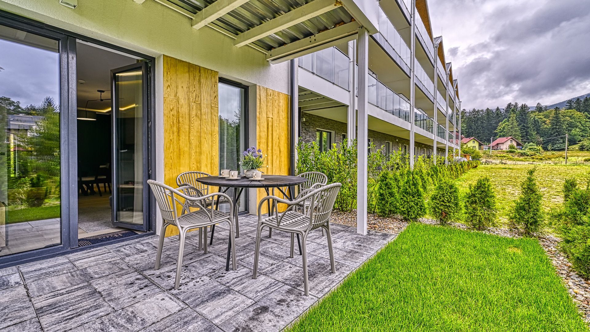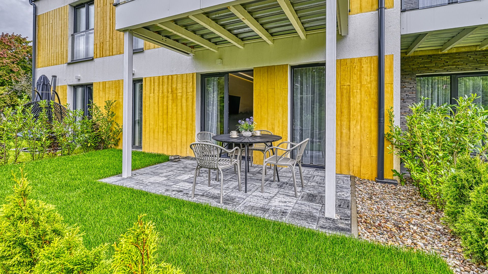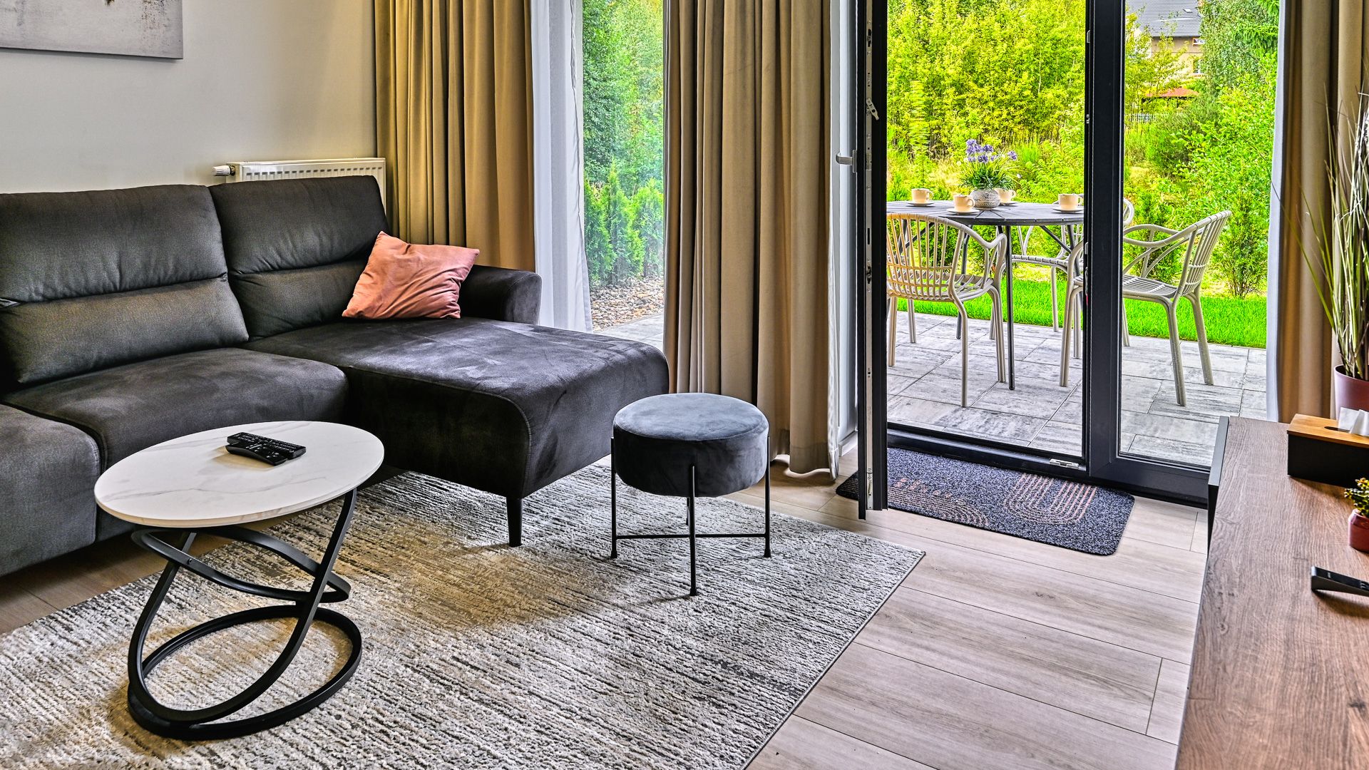 Dodatkowym atutem apartamentu jest taras z widokiem na ogród, gdzie można rozpocząć dzień przy filiżance kawy lub zakończyć go, delektując się spokojem i pięknem otoczenia.