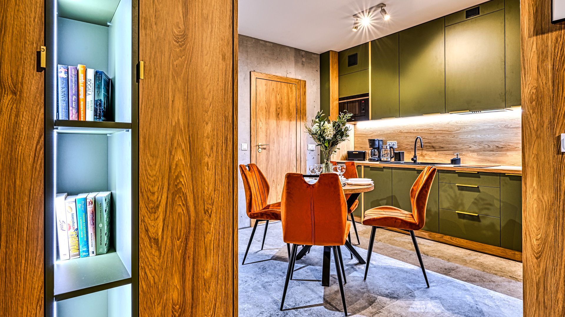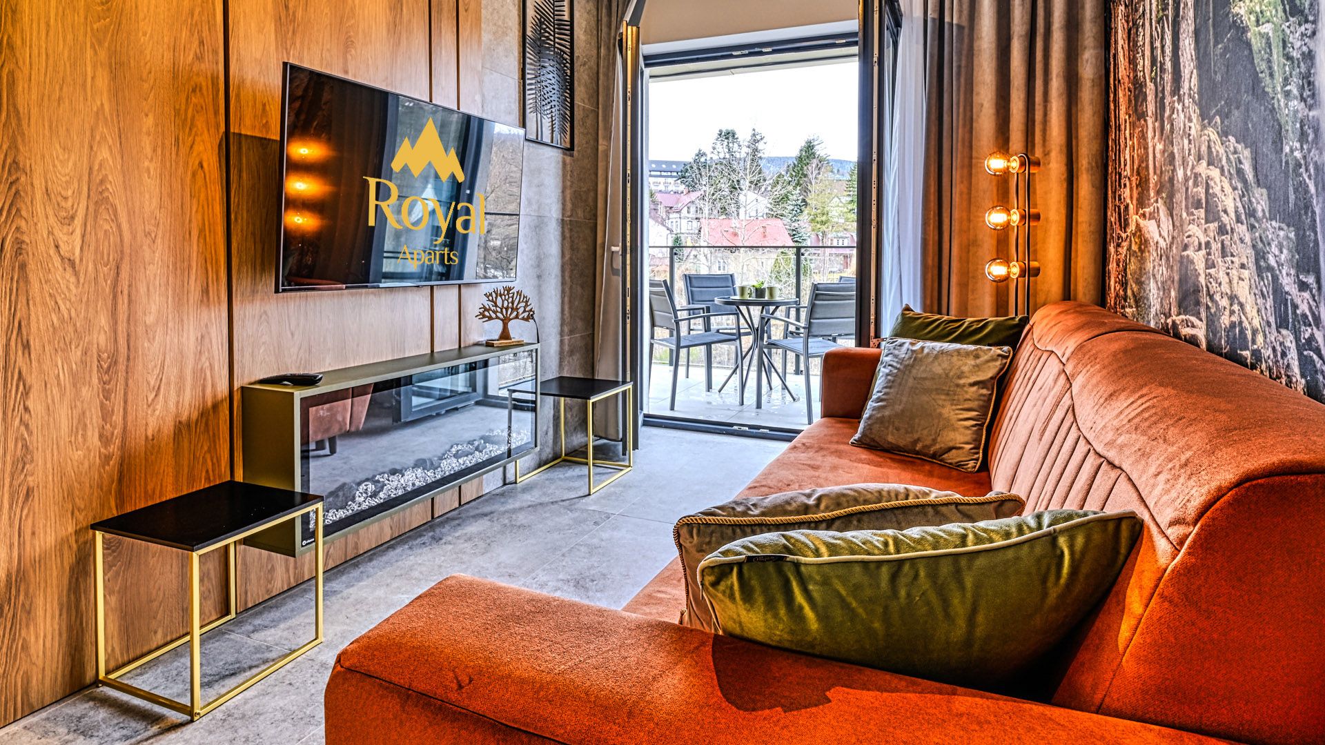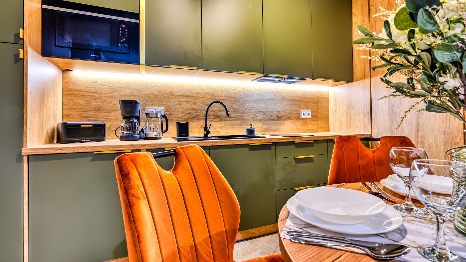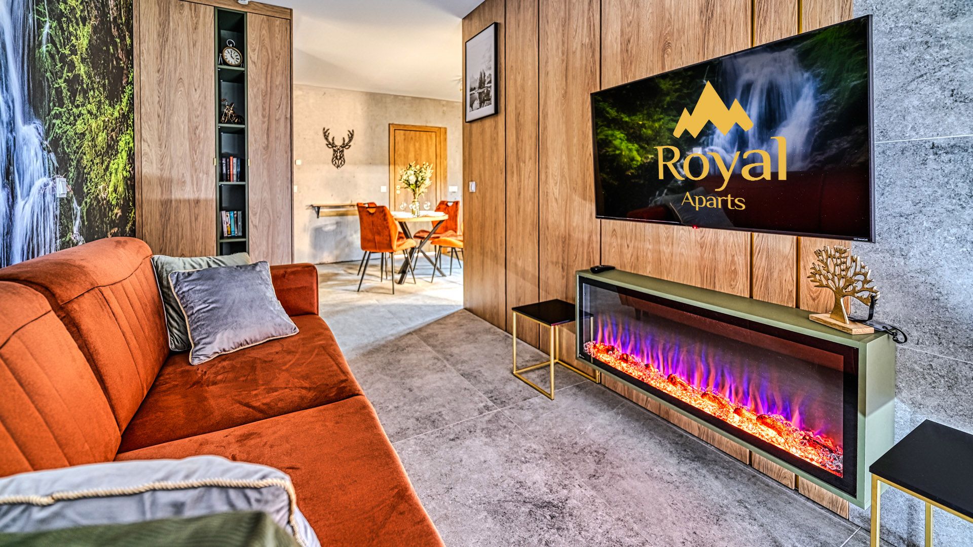 Apartament został zaprojektowany z myślą o komforcie i wygodzie. Przestronny salon wyposażony jest w wygodną sofę, telewizor oraz przytulny kominek, który tworzy niepowtarzalną atmosferę i sprzyja relaksowi po dniu pełnym wrażeń. W pełni wyposażony aneks kuchenny pozwala na przygotowanie ulubionych posiłków.