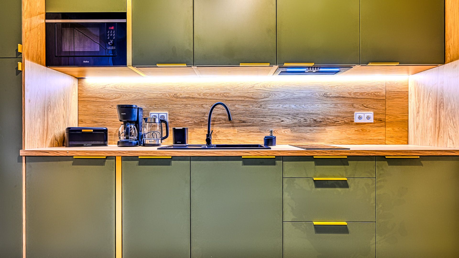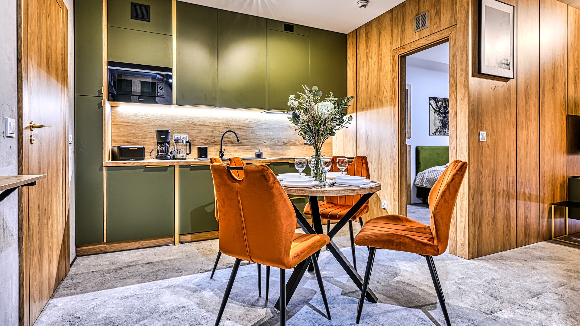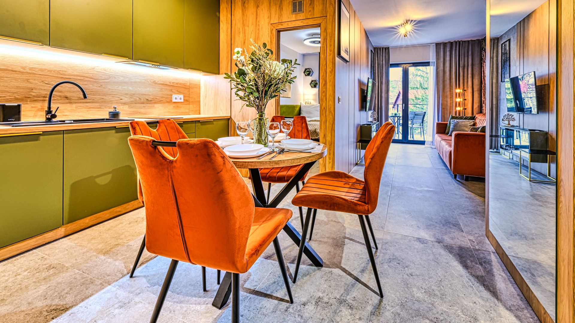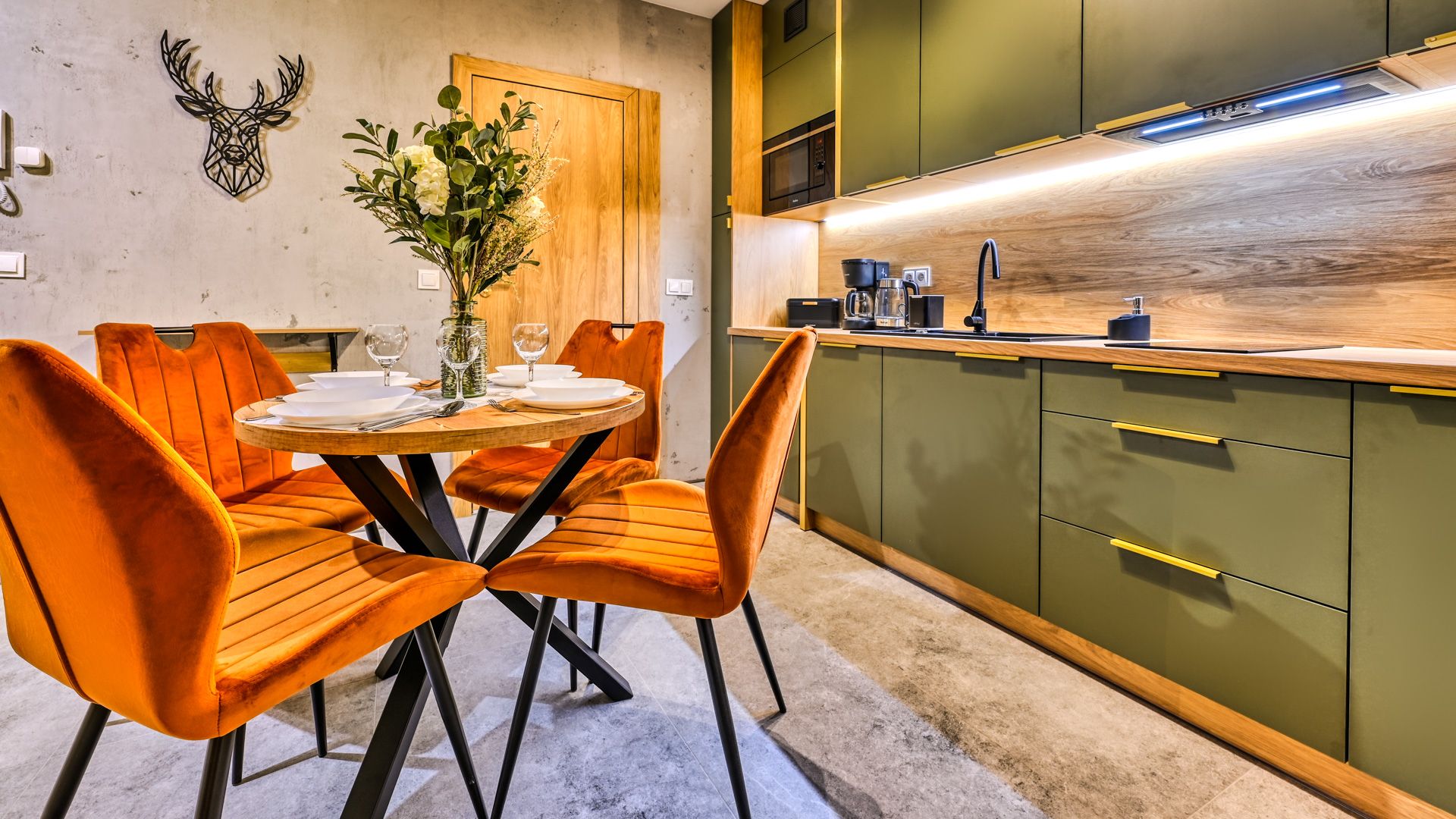 Apartament został zaprojektowany z myślą o komforcie i wygodzie. Przestronny salon wyposażony jest w wygodną sofę, telewizor oraz przytulny kominek, który tworzy niepowtarzalną atmosferę i sprzyja relaksowi po dniu pełnym wrażeń. W pełni wyposażony aneks kuchenny pozwala na przygotowanie ulubionych posiłków.