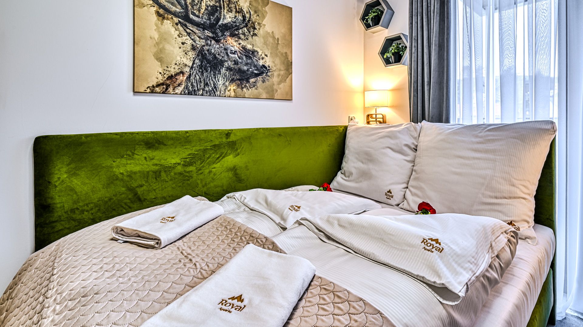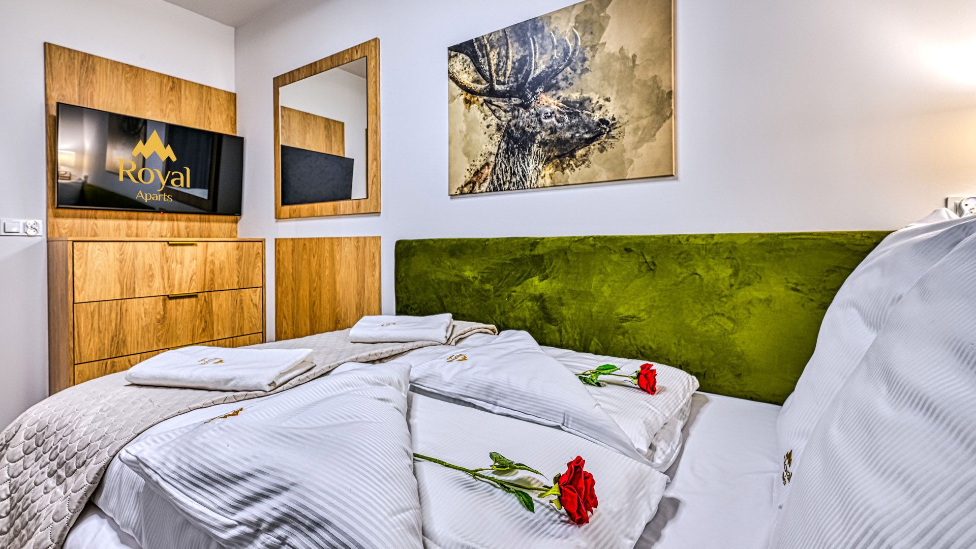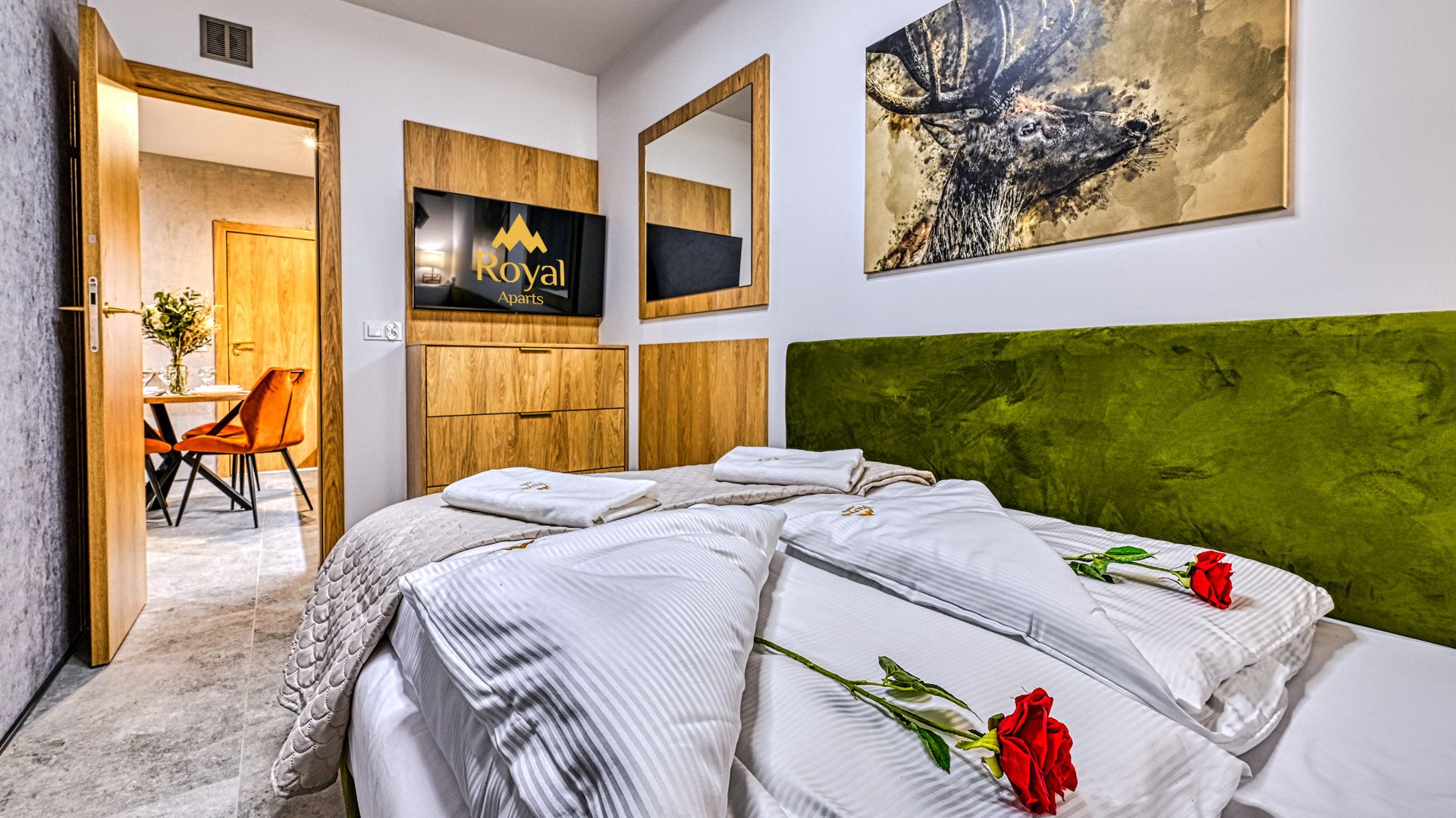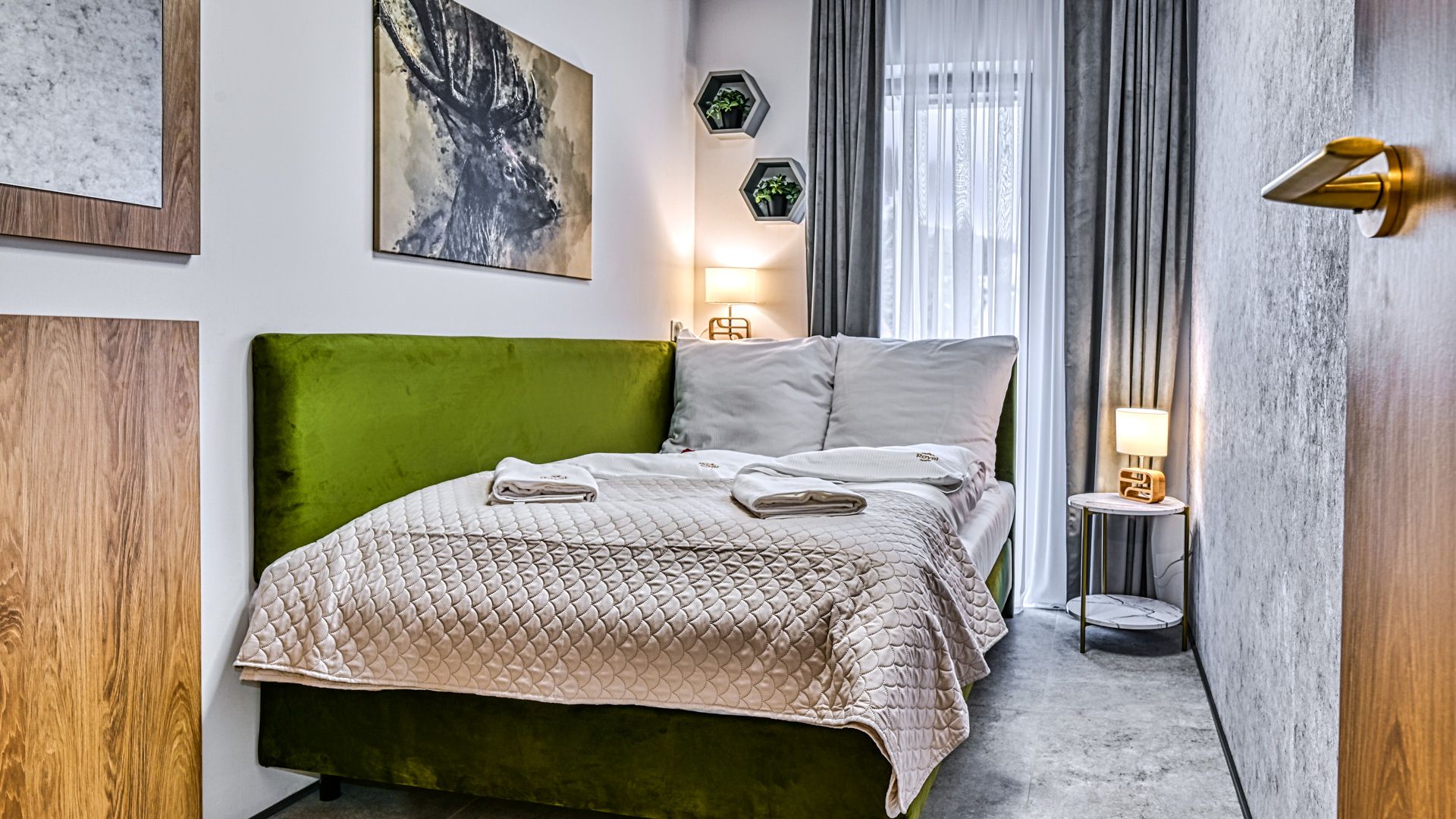 Sypialnia z dużym, dwuosobowym łóżkiem zapewnia prywatność i wygodę, tworząc idealne warunki do regeneracji sił. Dodatkowym udogodnieniem jest telewizor, który umili wieczorny odpoczynek.