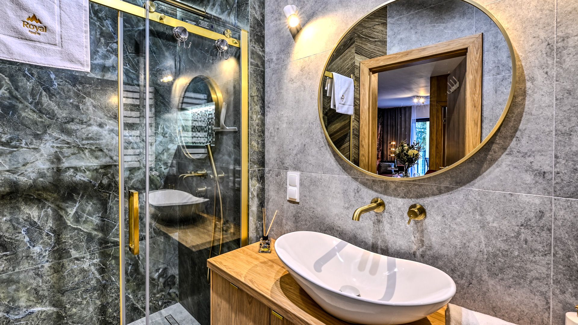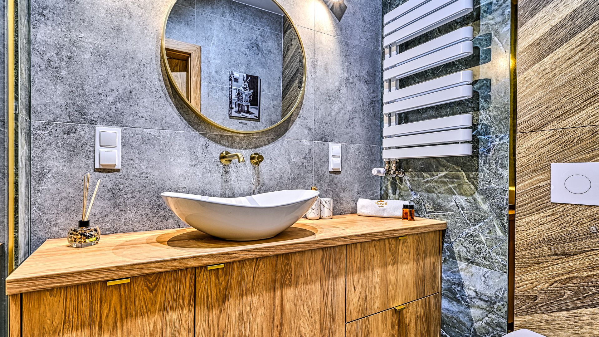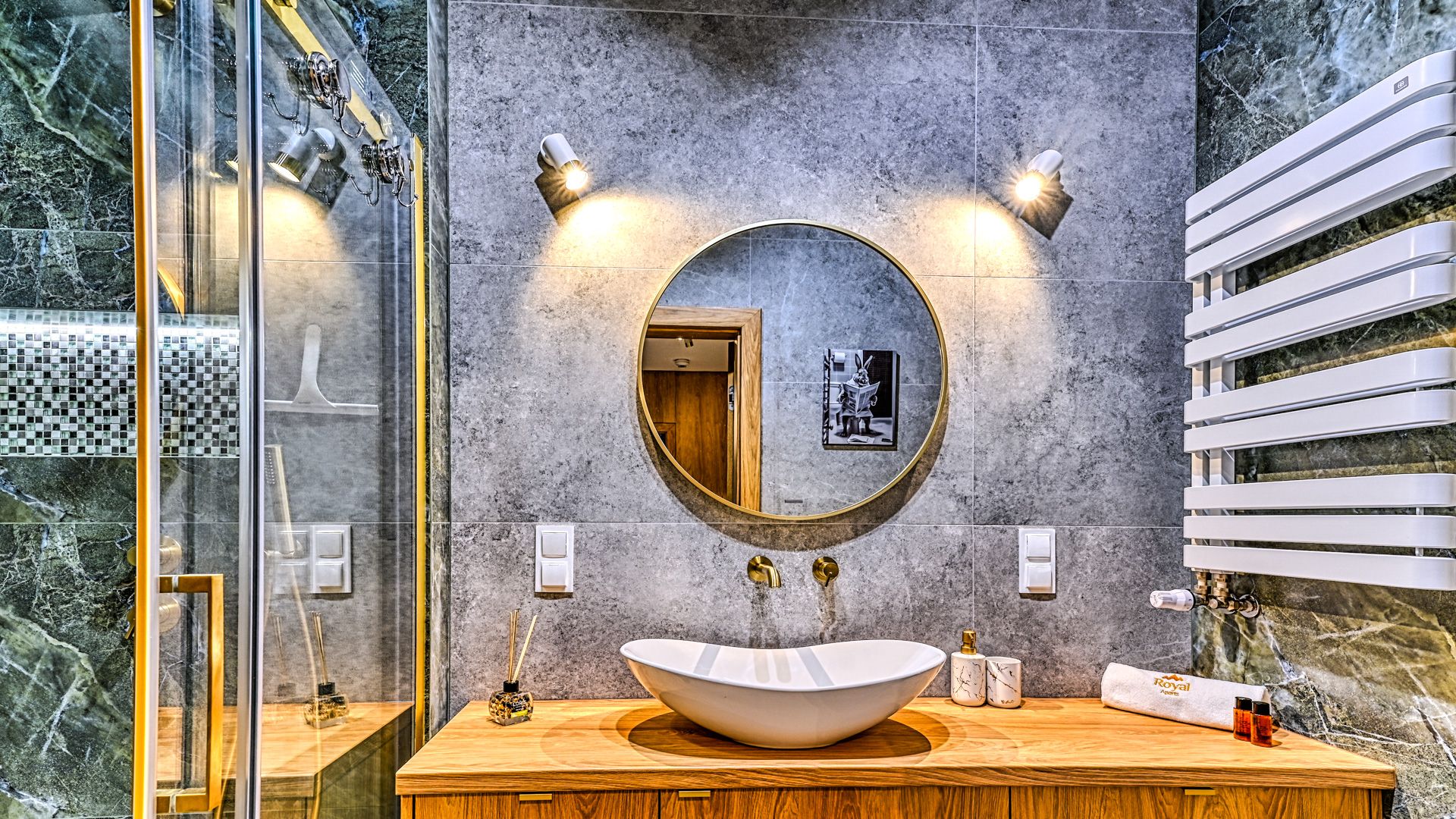 Elegancka, nowoczesna łazienka została wyposażona w wysokiej jakości armaturę, przestronny prysznic oraz pralkę, co zwiększa wygodę podczas dłuższego pobytu.