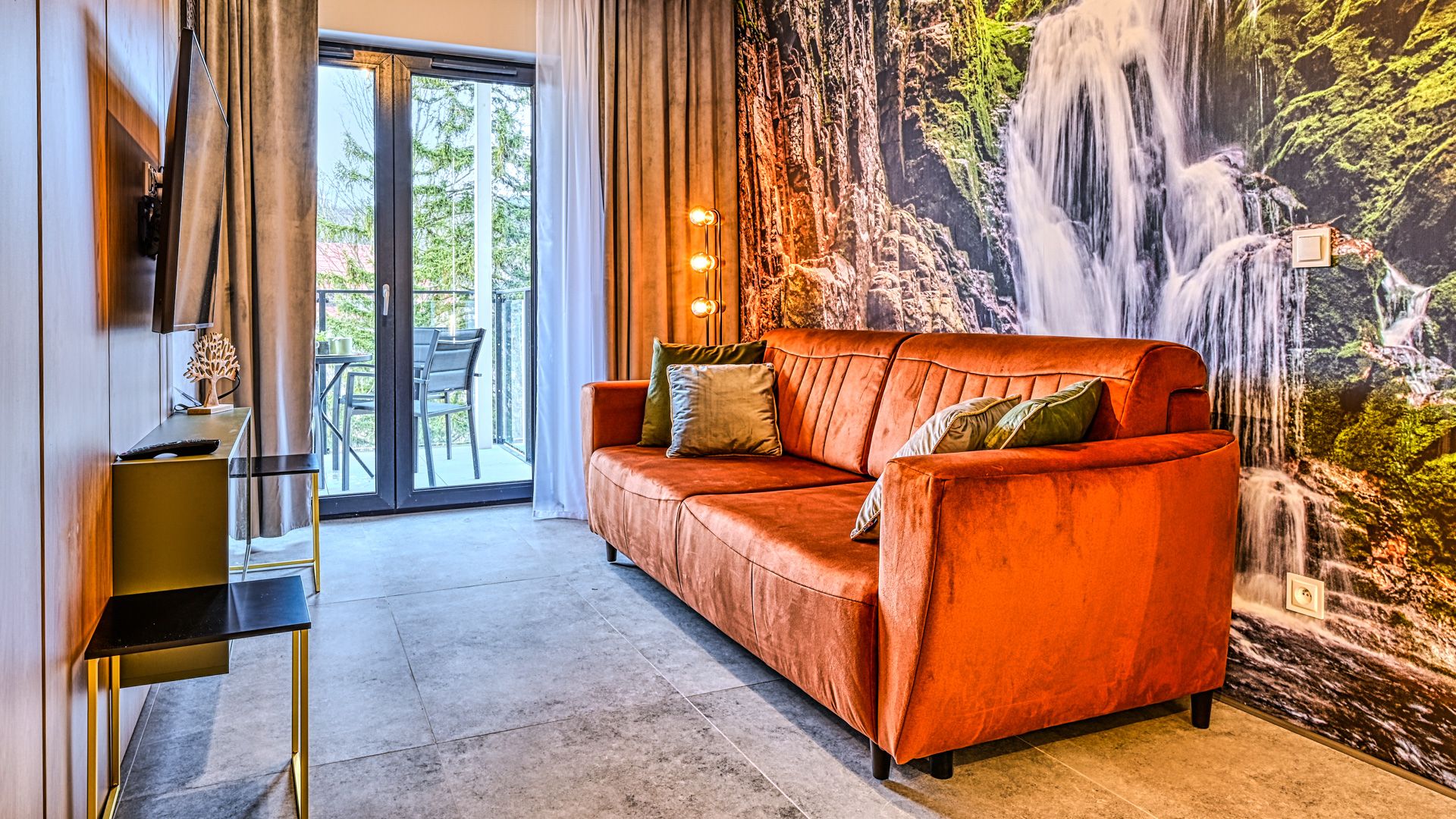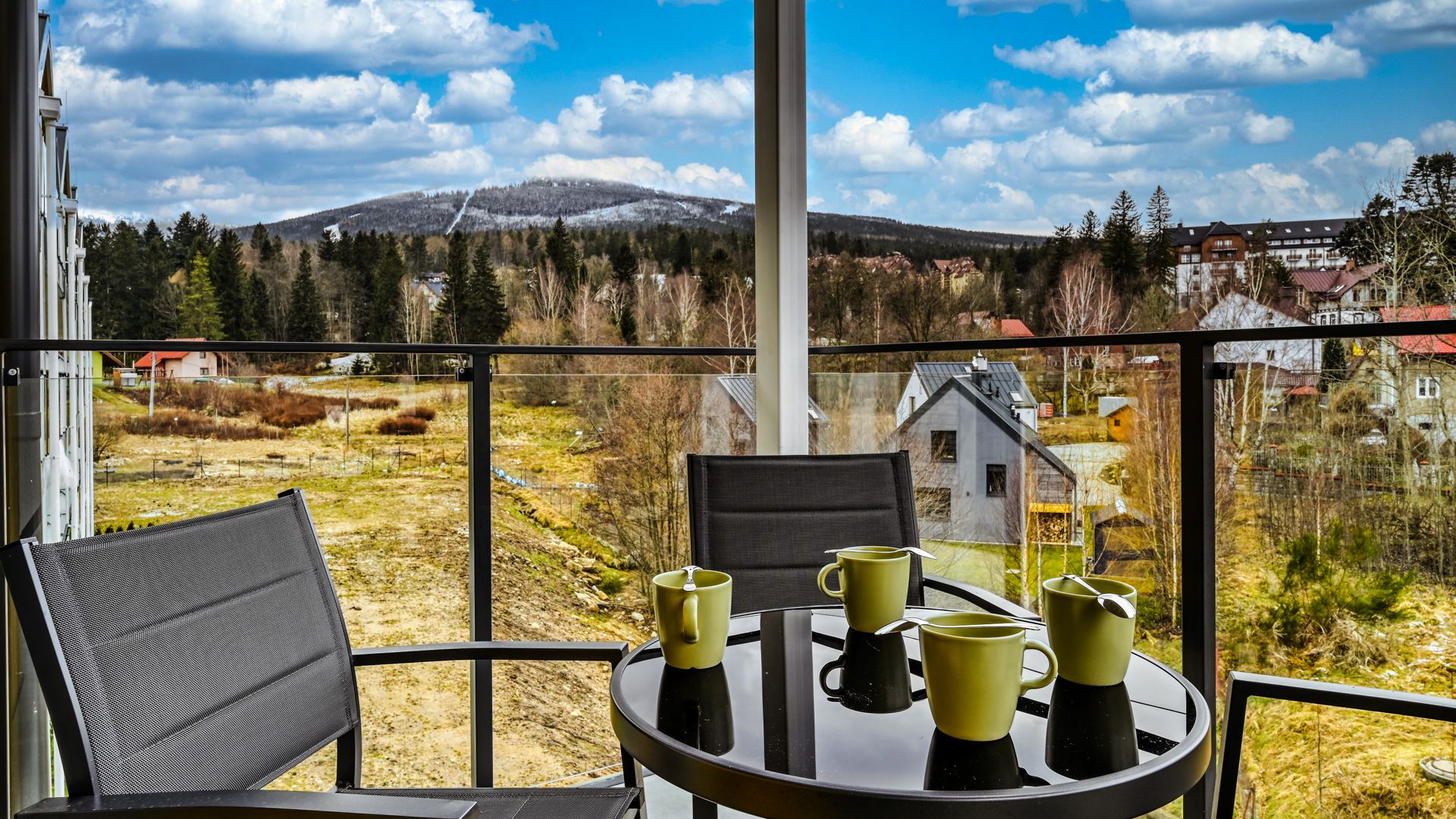 Dodatkowym atutem apartamentu jest balkon z widokiem na ogród, a także na majestatyczne góry – Szrenicę i Wysoki Kamień. To idealne miejsce, by rozpocząć dzień przy filiżance kawy lub zakończyć go, delektując się spokojem i pięknem otoczenia.