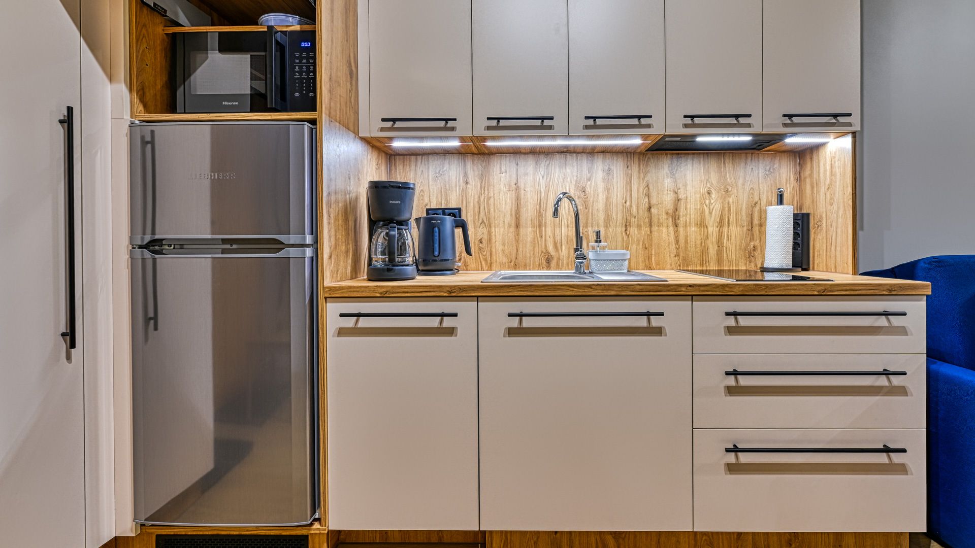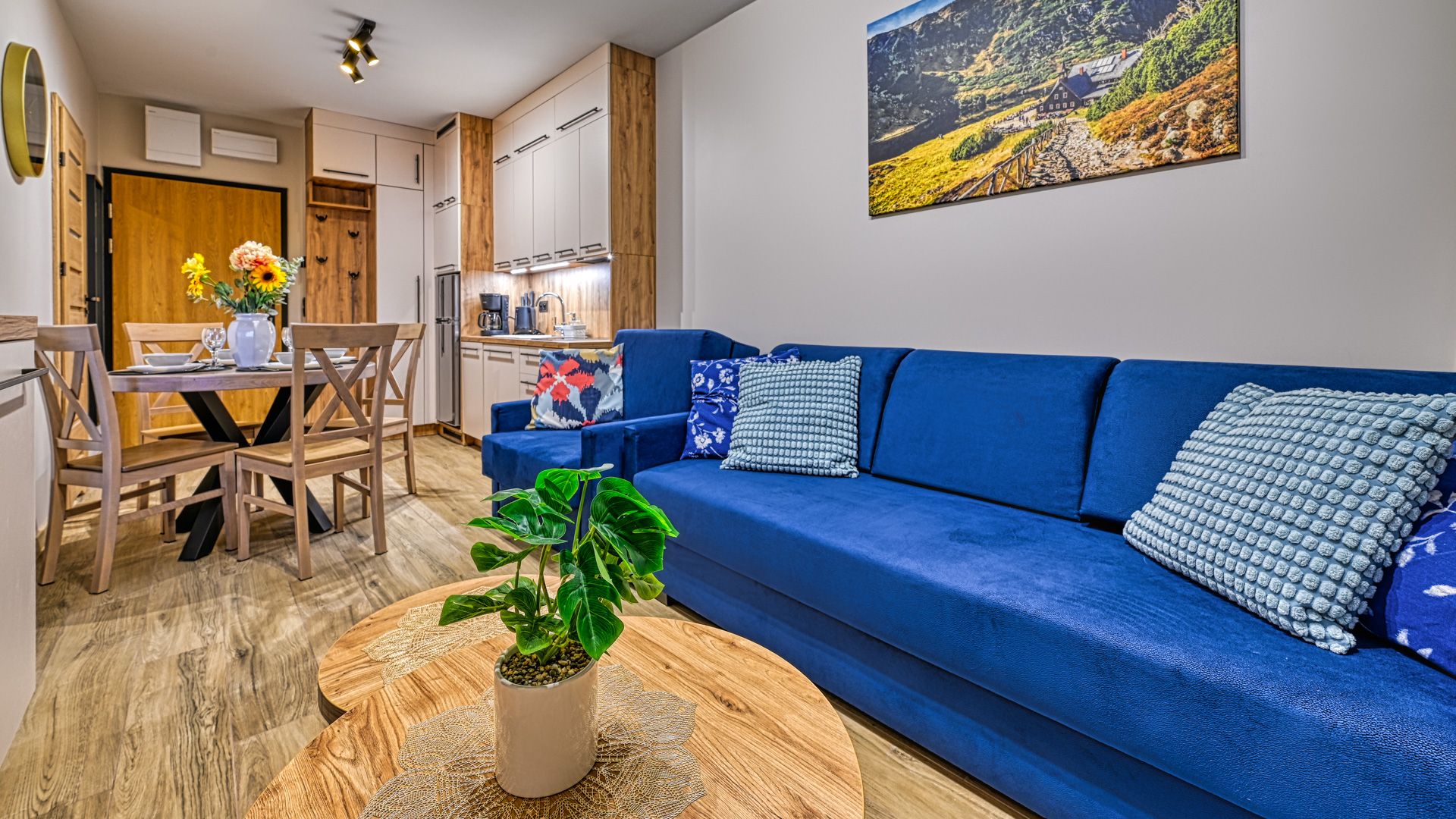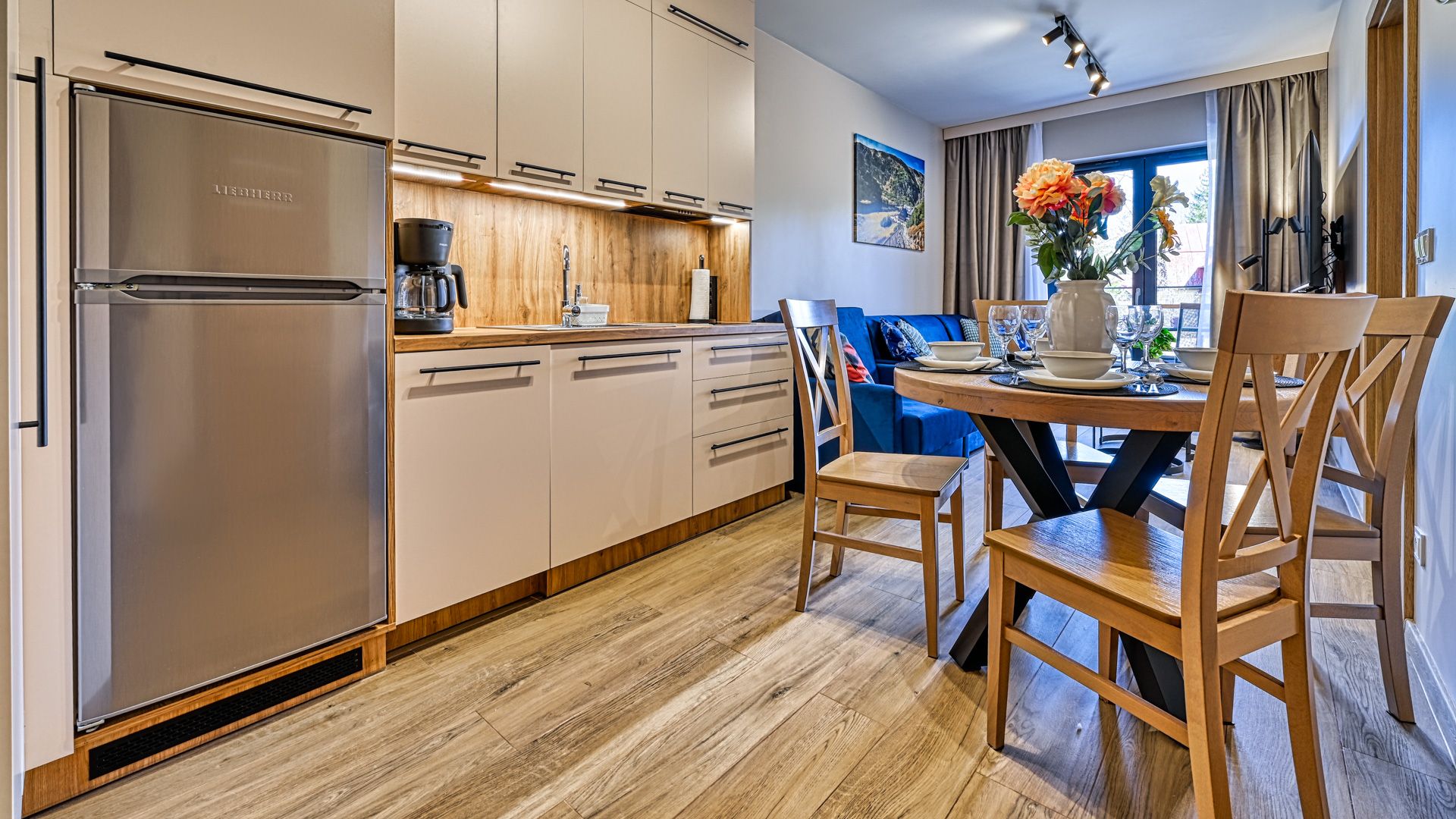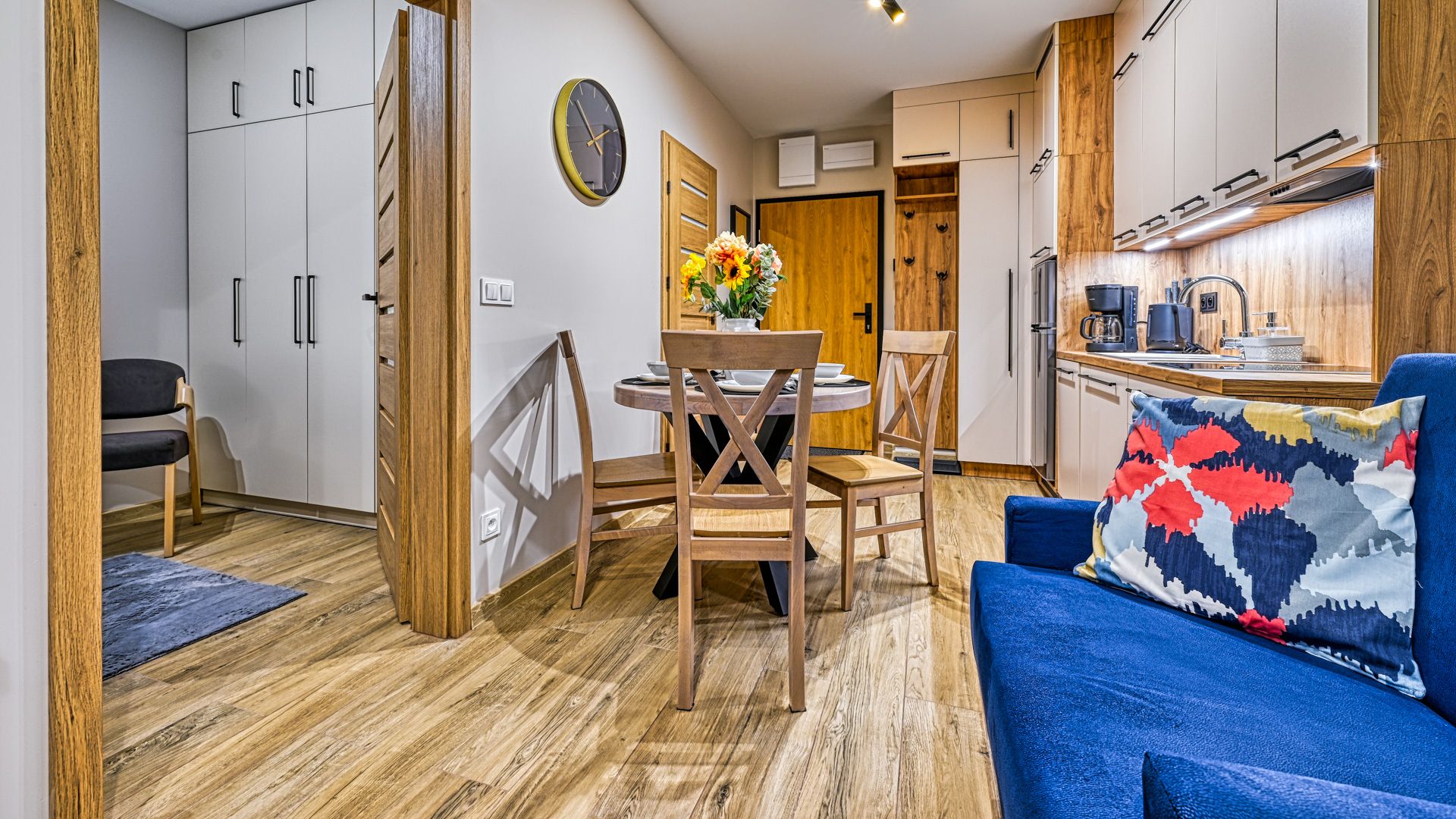 Apartament został zaprojektowany z myślą o komforcie i wygodzie. Przestronny salon oferuje wygodną sofę, fotel oraz telewizor, które zachęcają do relaksu po dniu pełnym wrażeń. W pełni wyposażony aneks kuchenny pozwala na przygotowanie ulubionych posiłków.