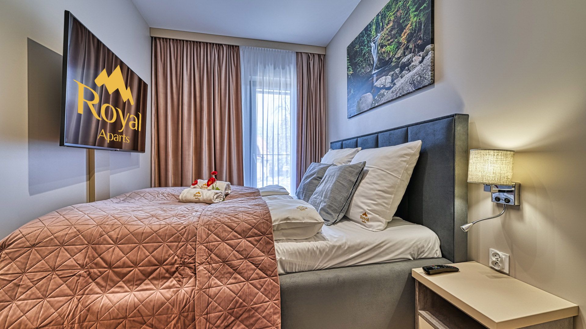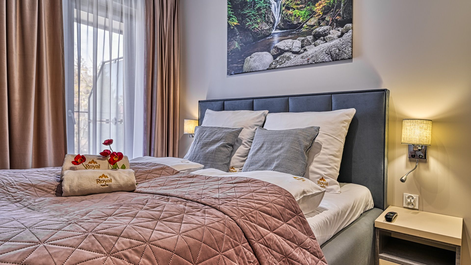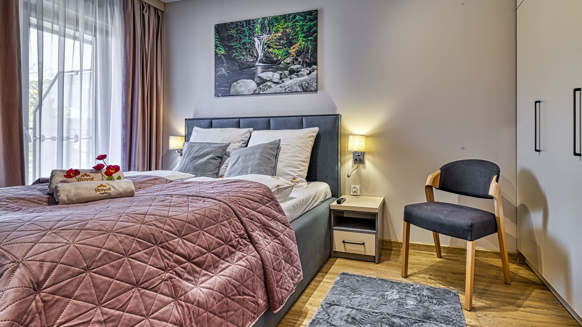 Sypialnia z dużym, dwuosobowym łóżkiem zapewnia prywatność i wygodę, tworząc idealne warunki do regeneracji sił.