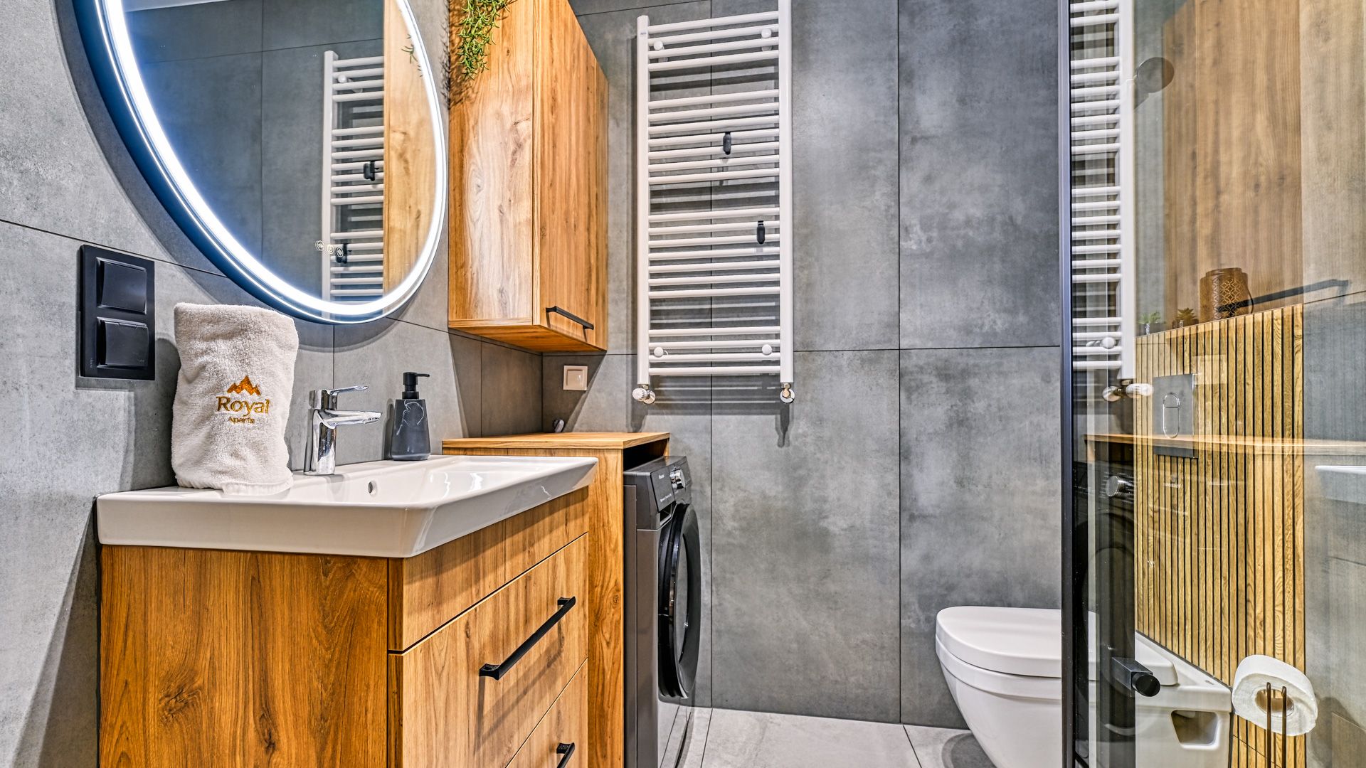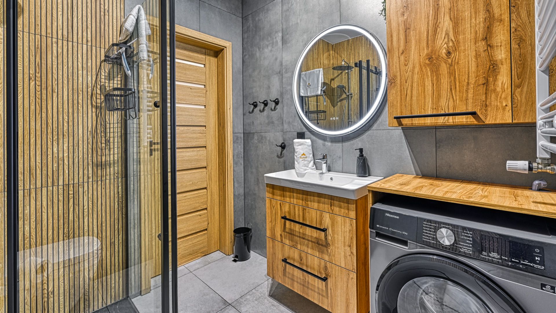 Elegancka, nowoczesna łazienka została wyposażona w wysokiej jakości armaturę i przestronny prysznic, co gwarantuje komfort użytkowania.