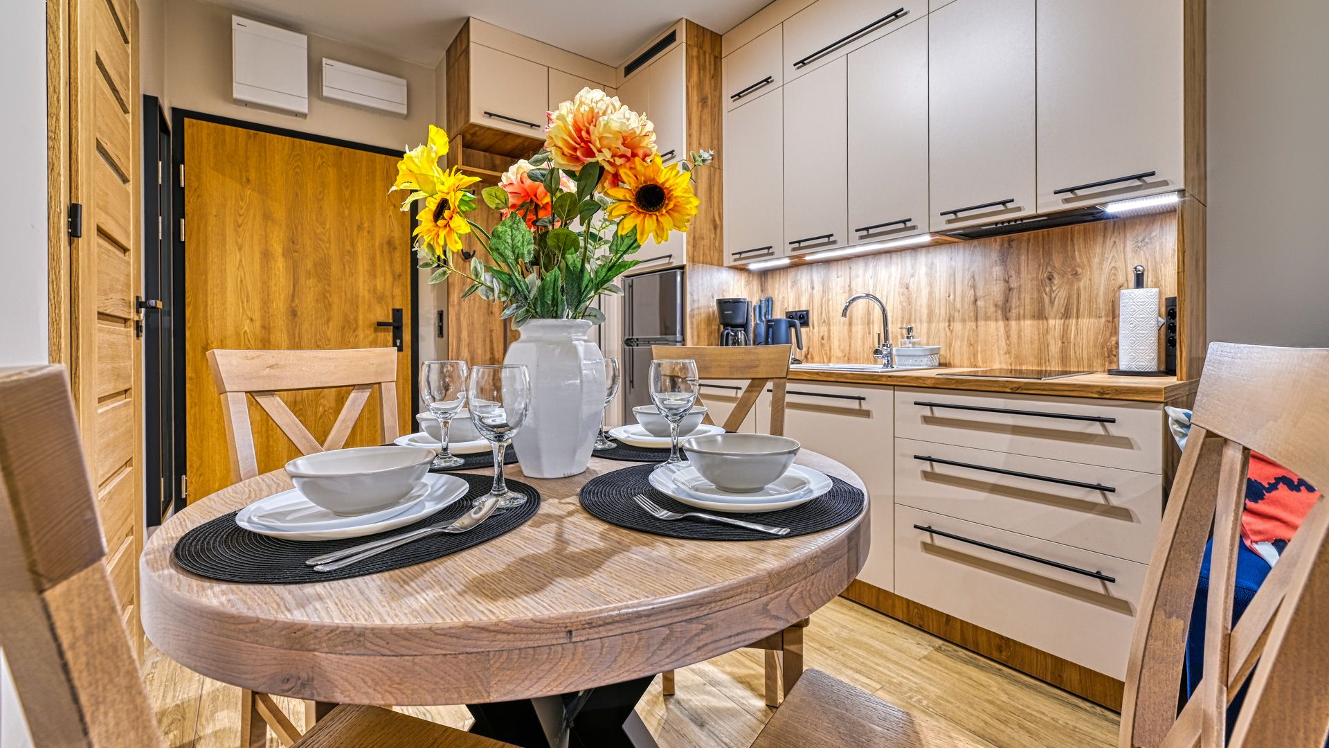 Zapraszamy do tego przytulnego apartamentu, który w harmonii łączy nowoczesność, wygodę i bliskość natury.