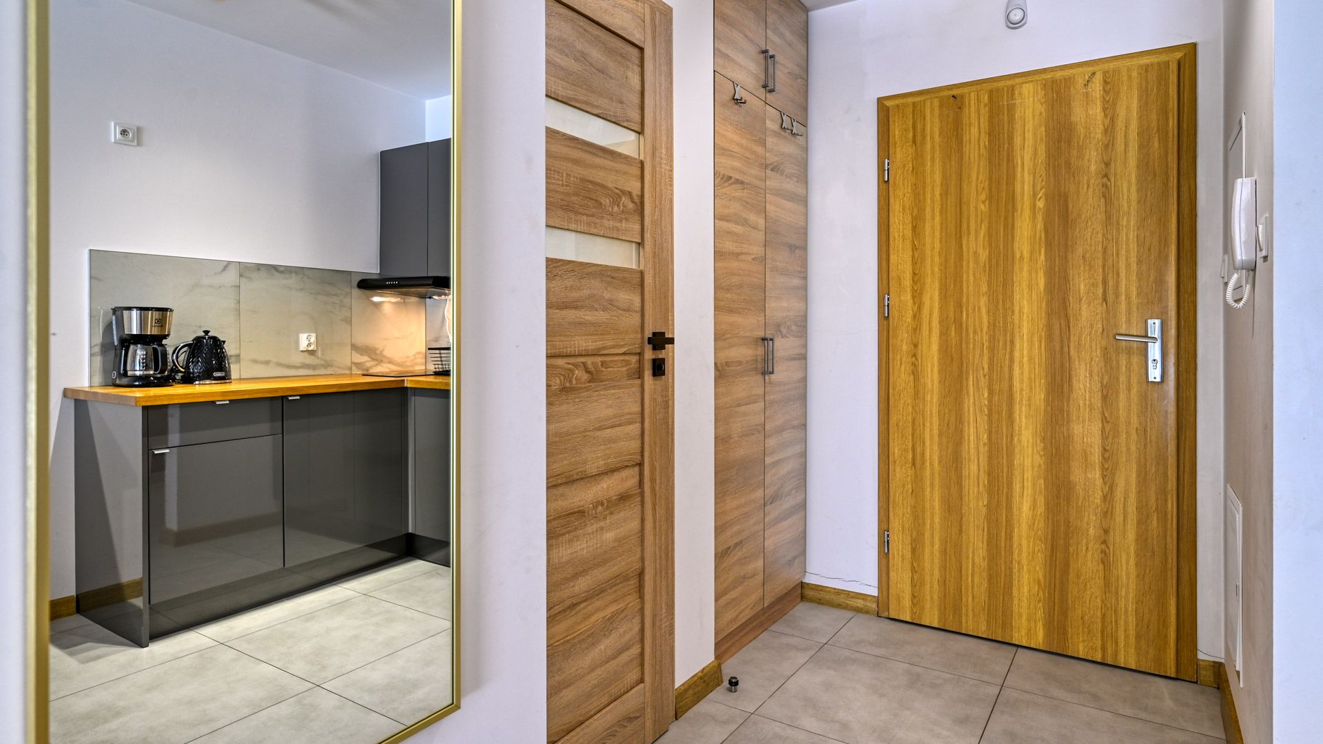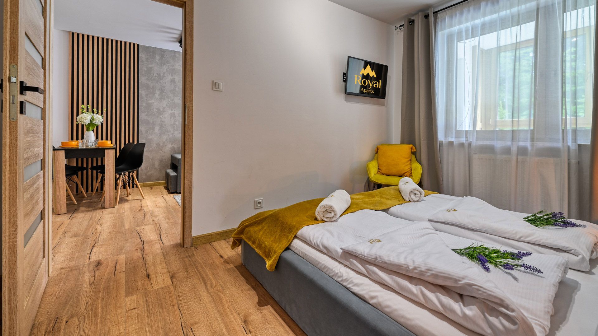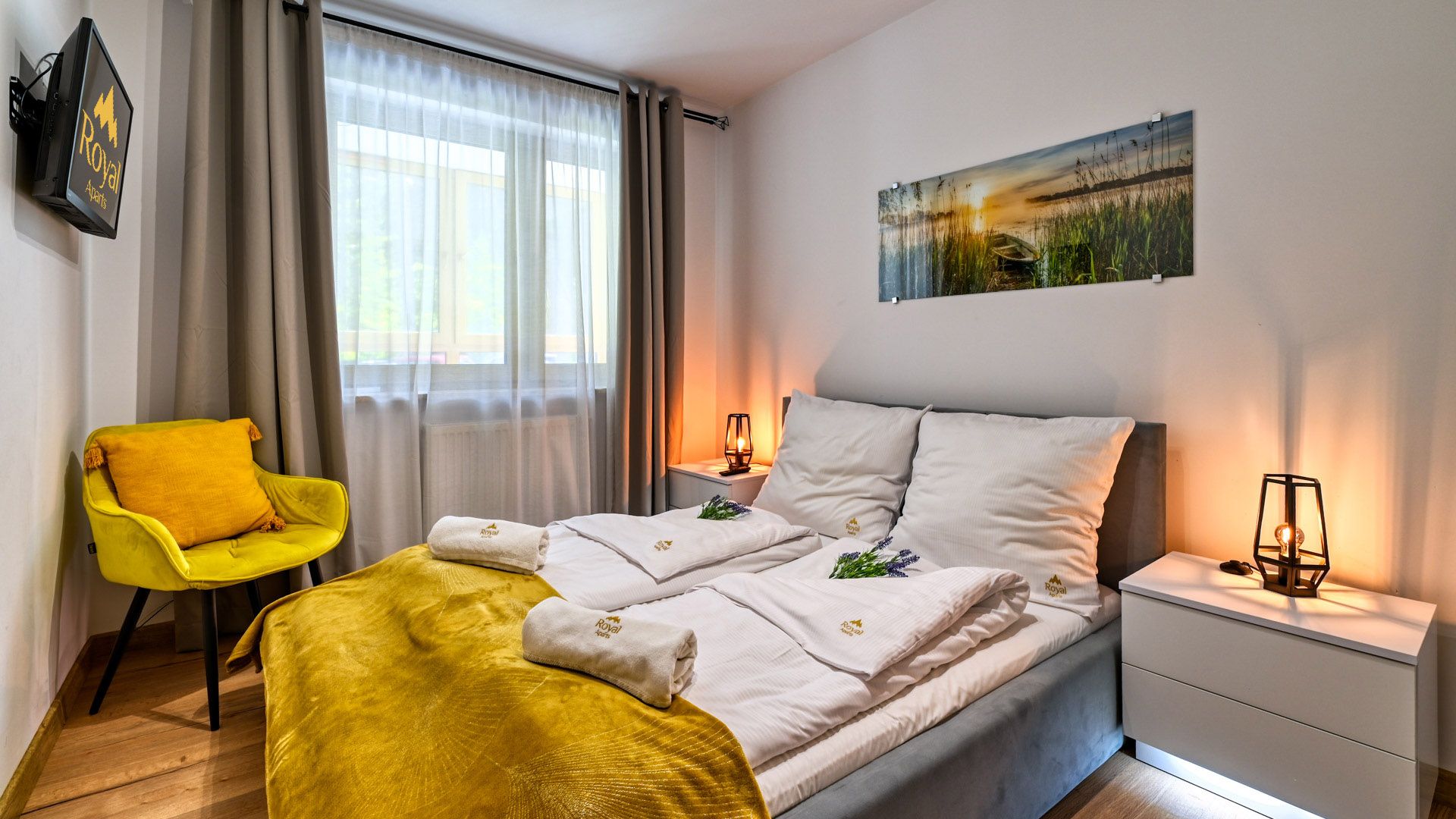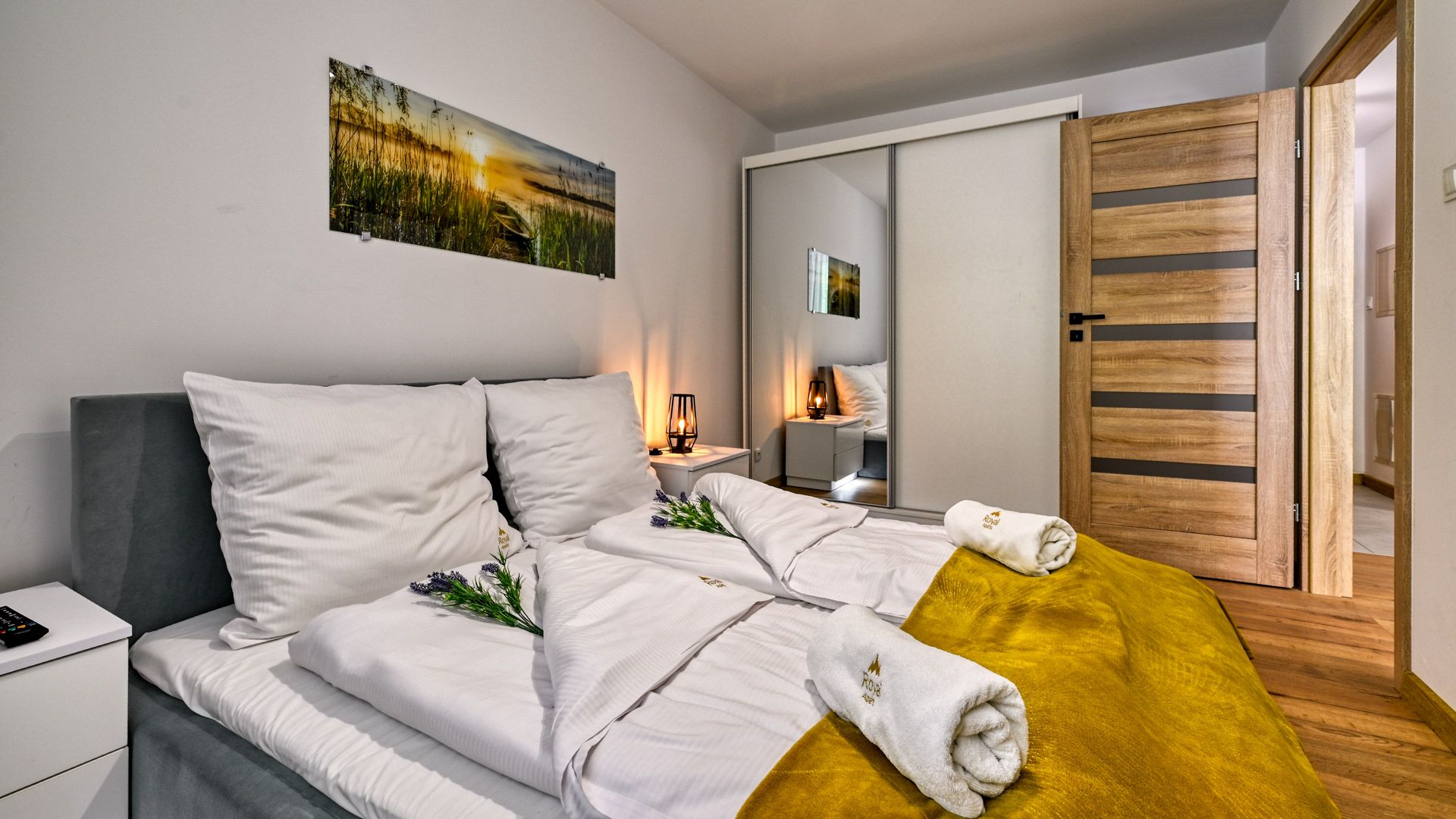 Apartament posiada również przytulną sypialnię, która zapewni komfortowy sen po dniu pełnym zwiedzania. Sypialnia jest wyposażona w wygodne dwuosobowe łóżko oraz obszerną szafę