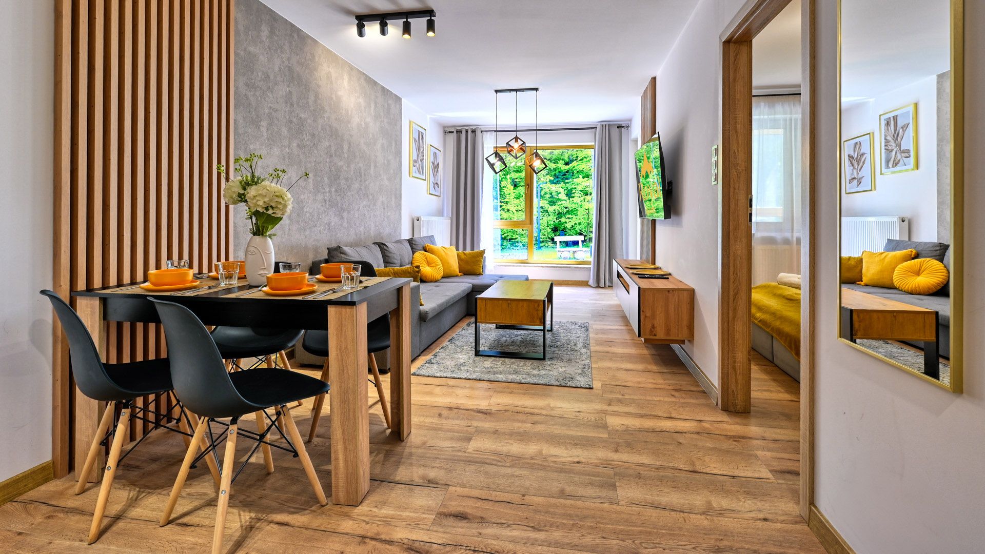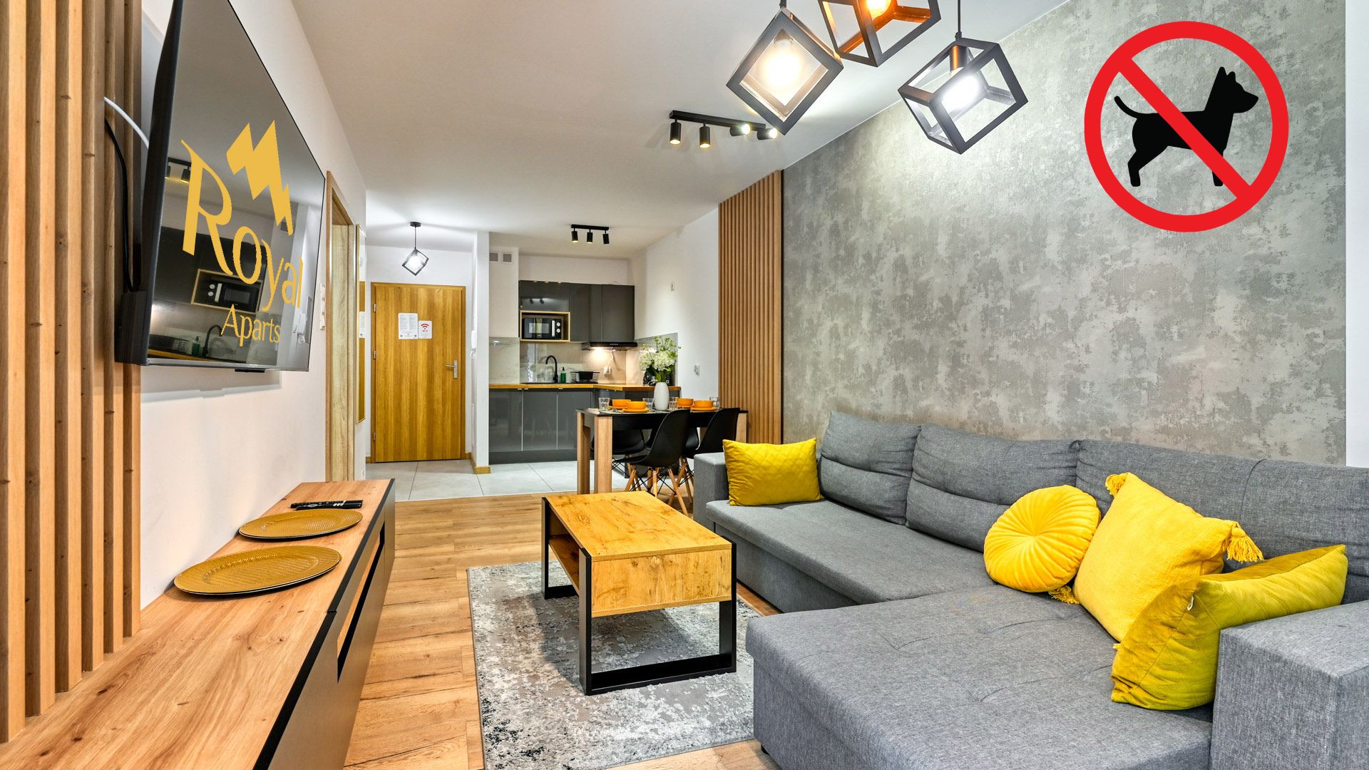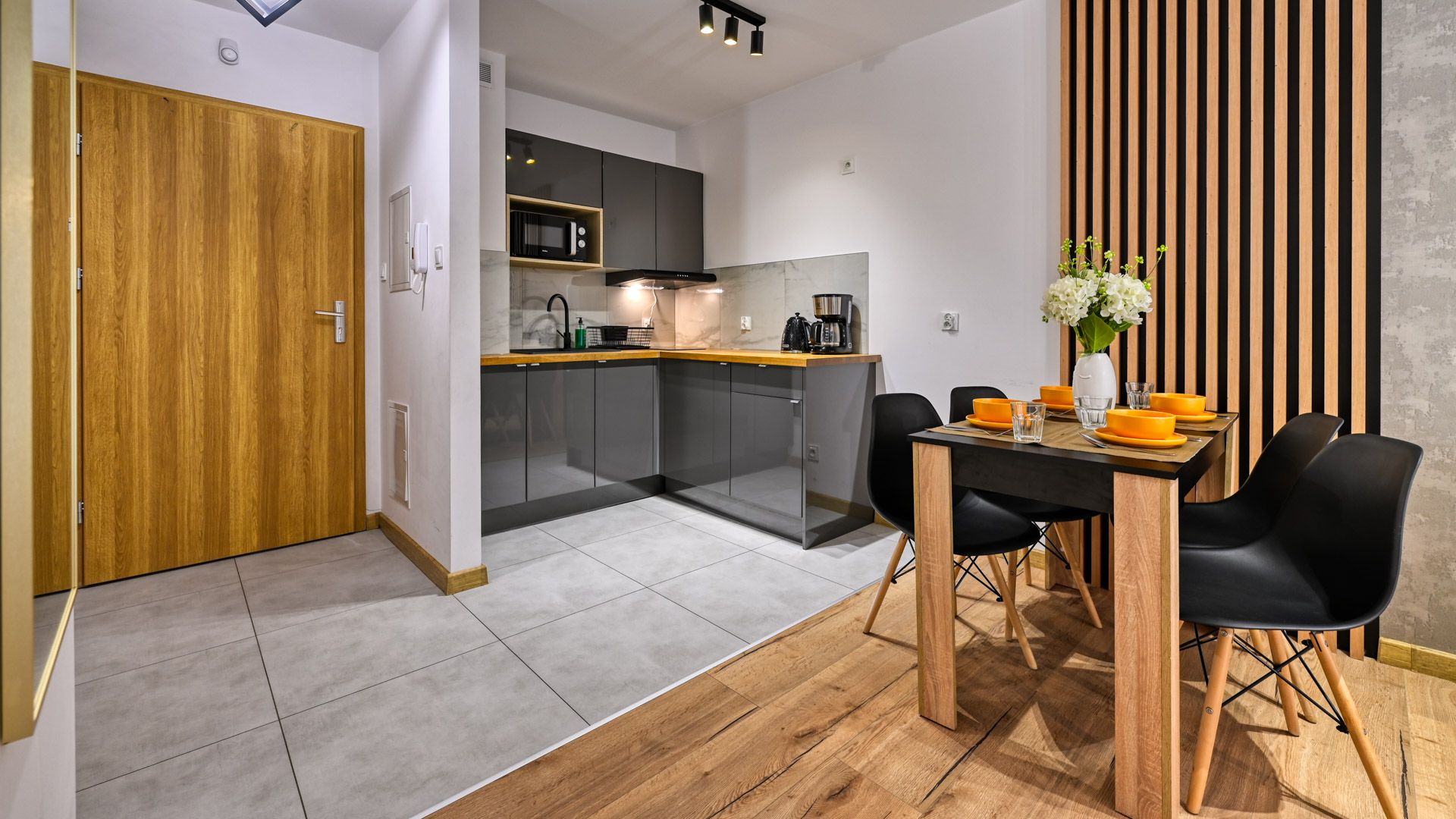 Po wejściu do apartamentu zostaniesz powitany przez przestronny salon z aneksem kuchennym. Salon został urządzony w nowoczesnym stylu z wygodną sofą. To idealne miejsce do relaksu i spędzania czasu w towarzystwie. Telewizor z płaskim ekranem oraz dostęp do Wi-Fi zapewnią rozrywkę i łączność podczas pobytu.
