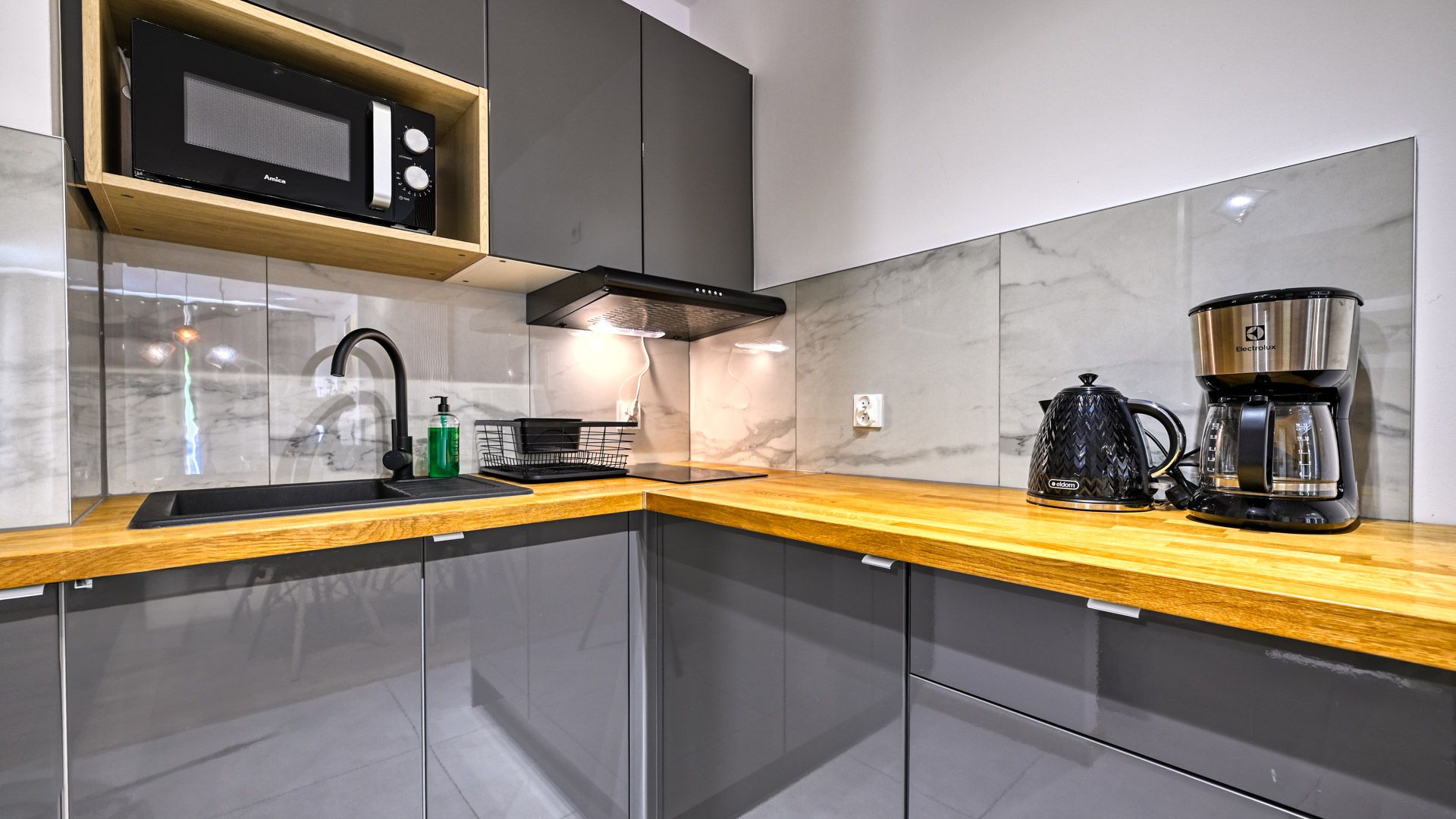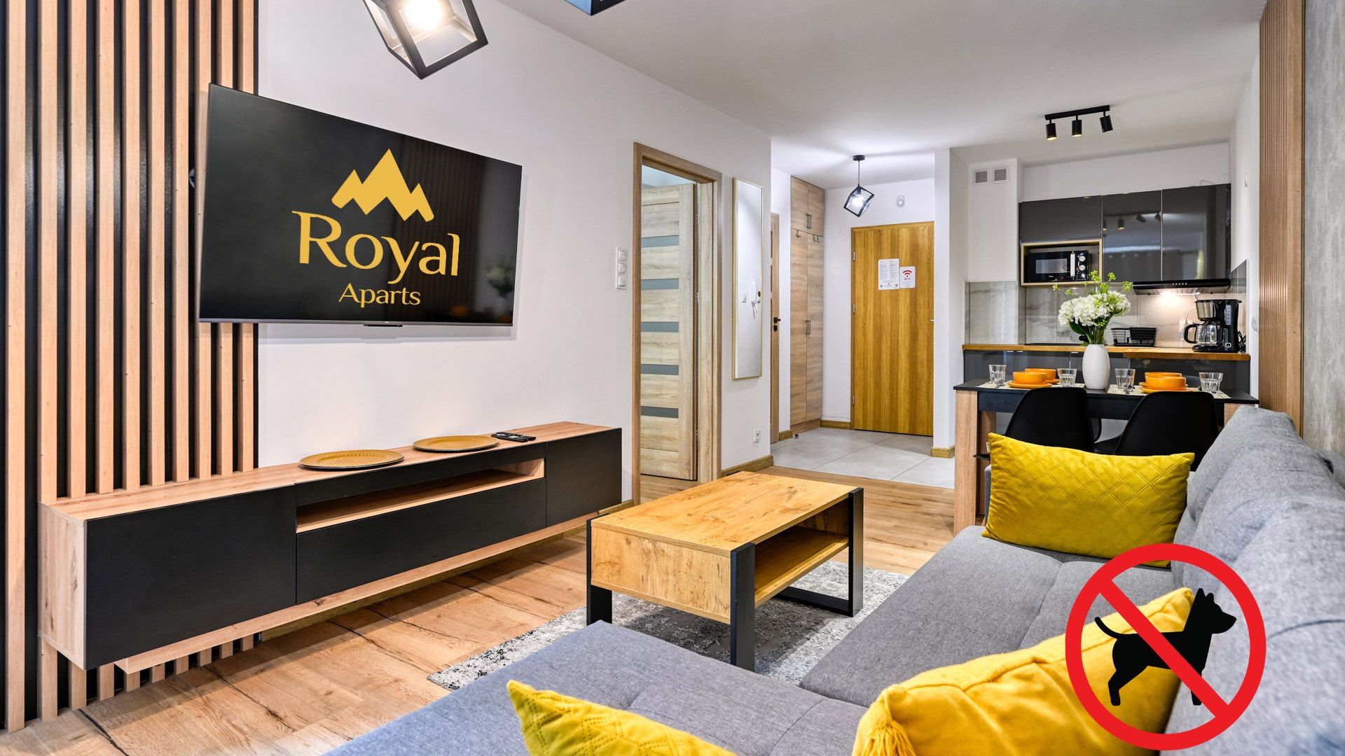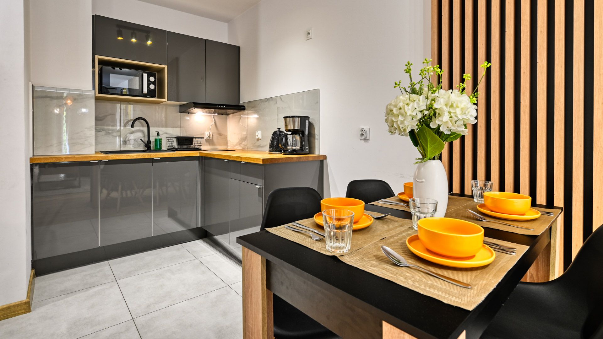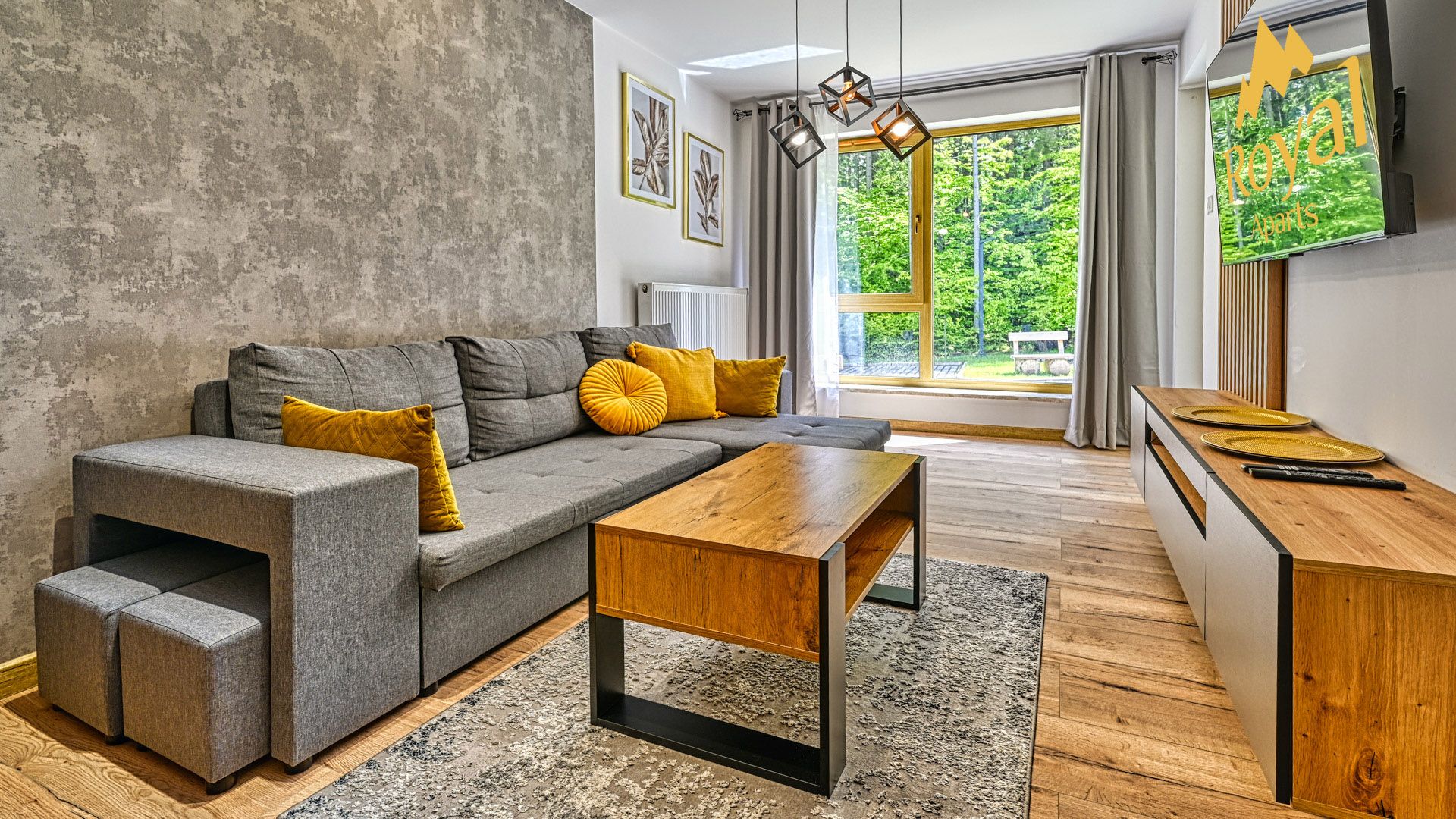 Po wejściu do apartamentu zostaniesz powitany przez przestronny salon z aneksem kuchennym. Salon został urządzony w nowoczesnym stylu z wygodną sofą. To idealne miejsce do relaksu i spędzania czasu w towarzystwie. Telewizor z płaskim ekranem oraz dostęp do Wi-Fi zapewnią rozrywkę i łączność podczas pobytu.
