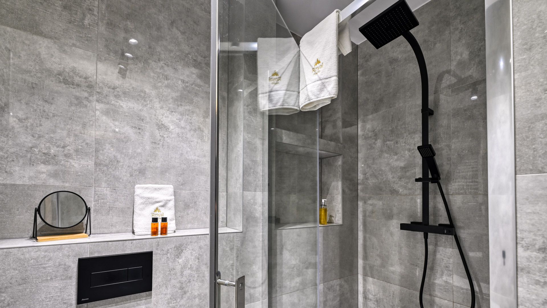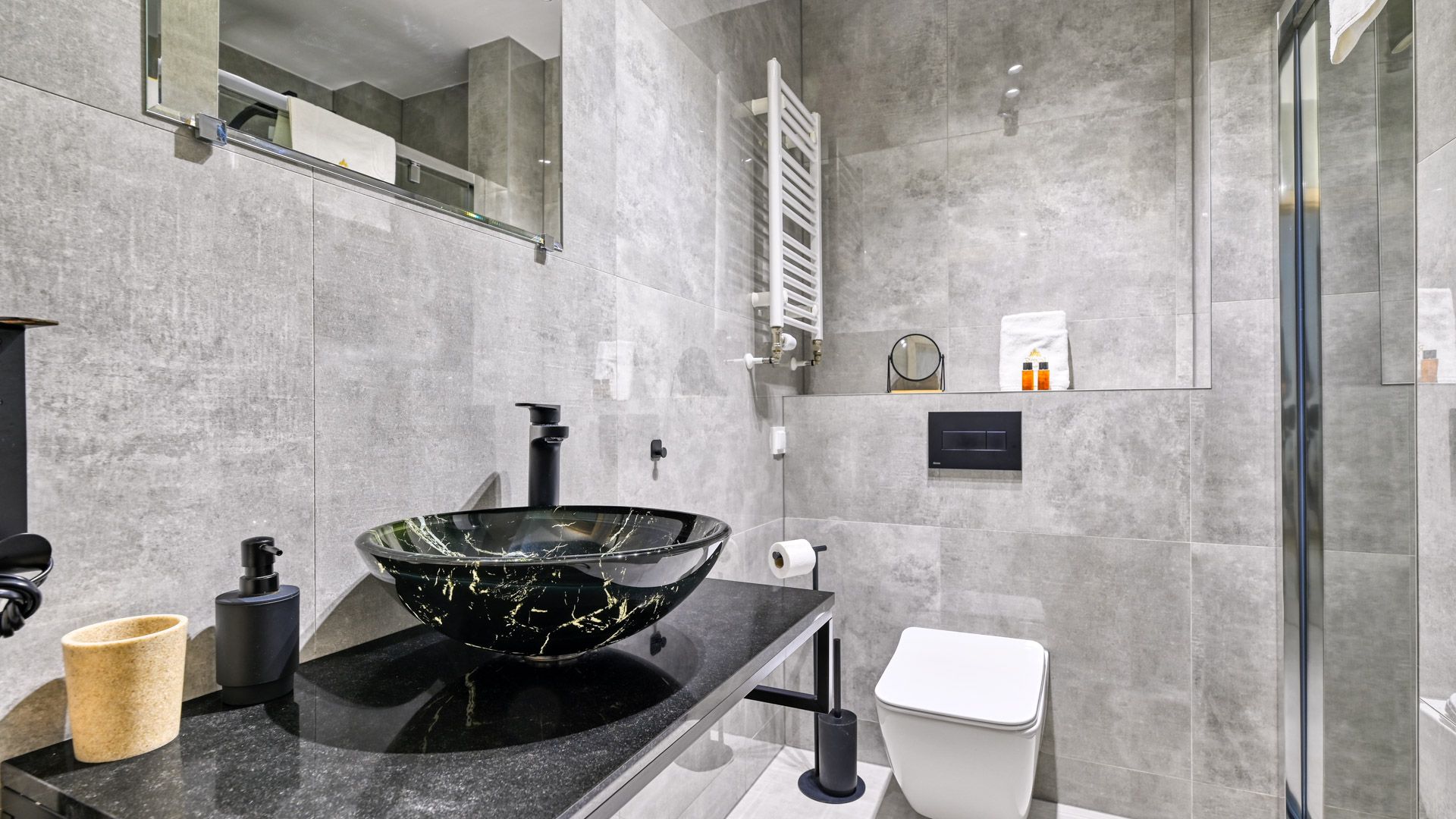 Łazienka apartamentu jest elegancka i wyposażona w prysznic, pralkę, umywalkę i toaletę. Wszystkie niezbędne ręczniki i przybory toaletowe są dostępne na miejscu, aby zapewnić wygodę i komfort podczas pobytu.
