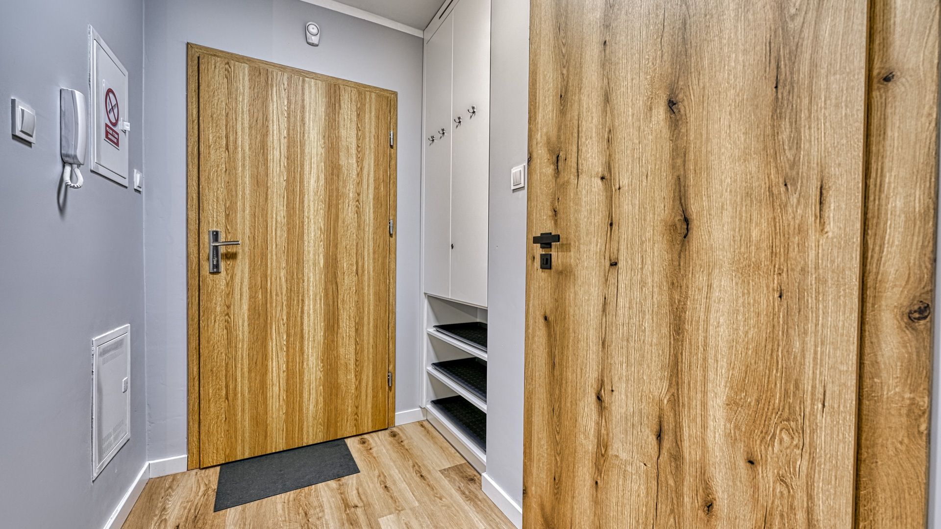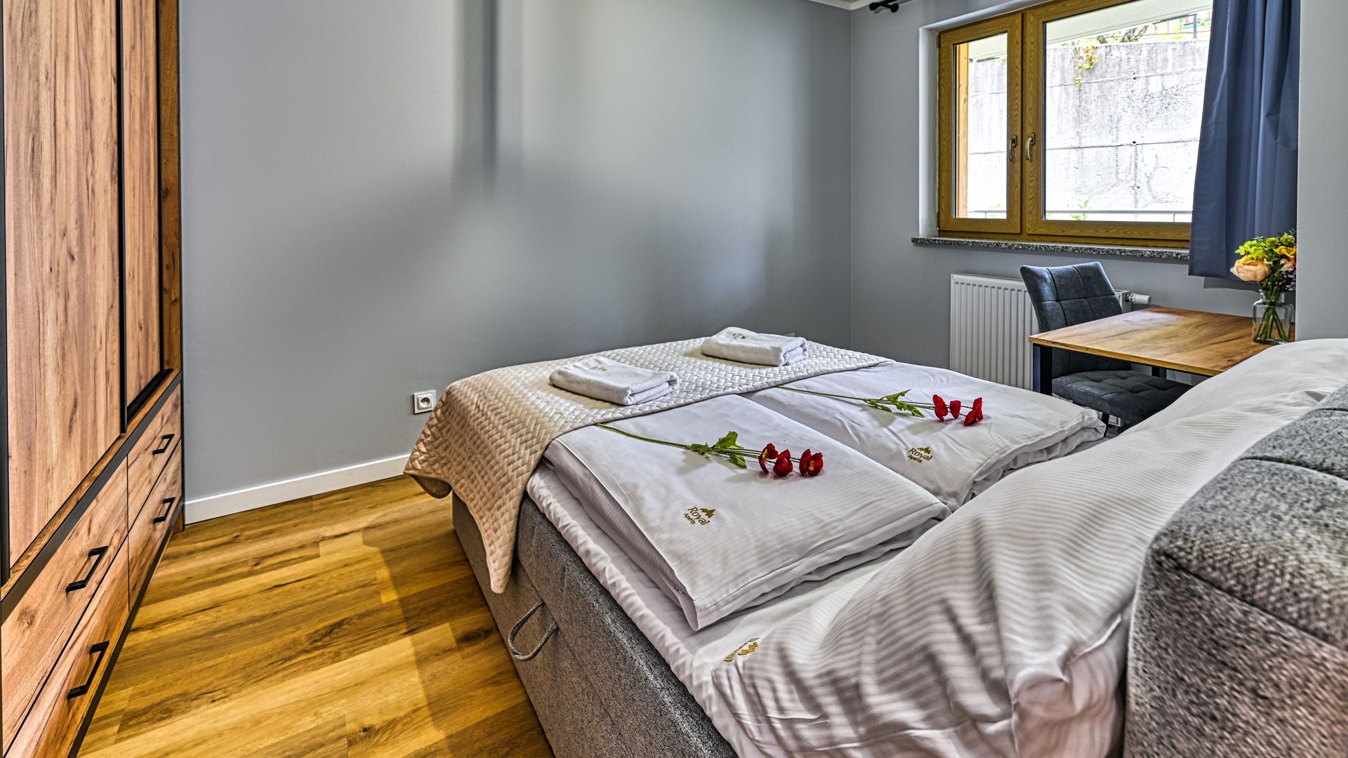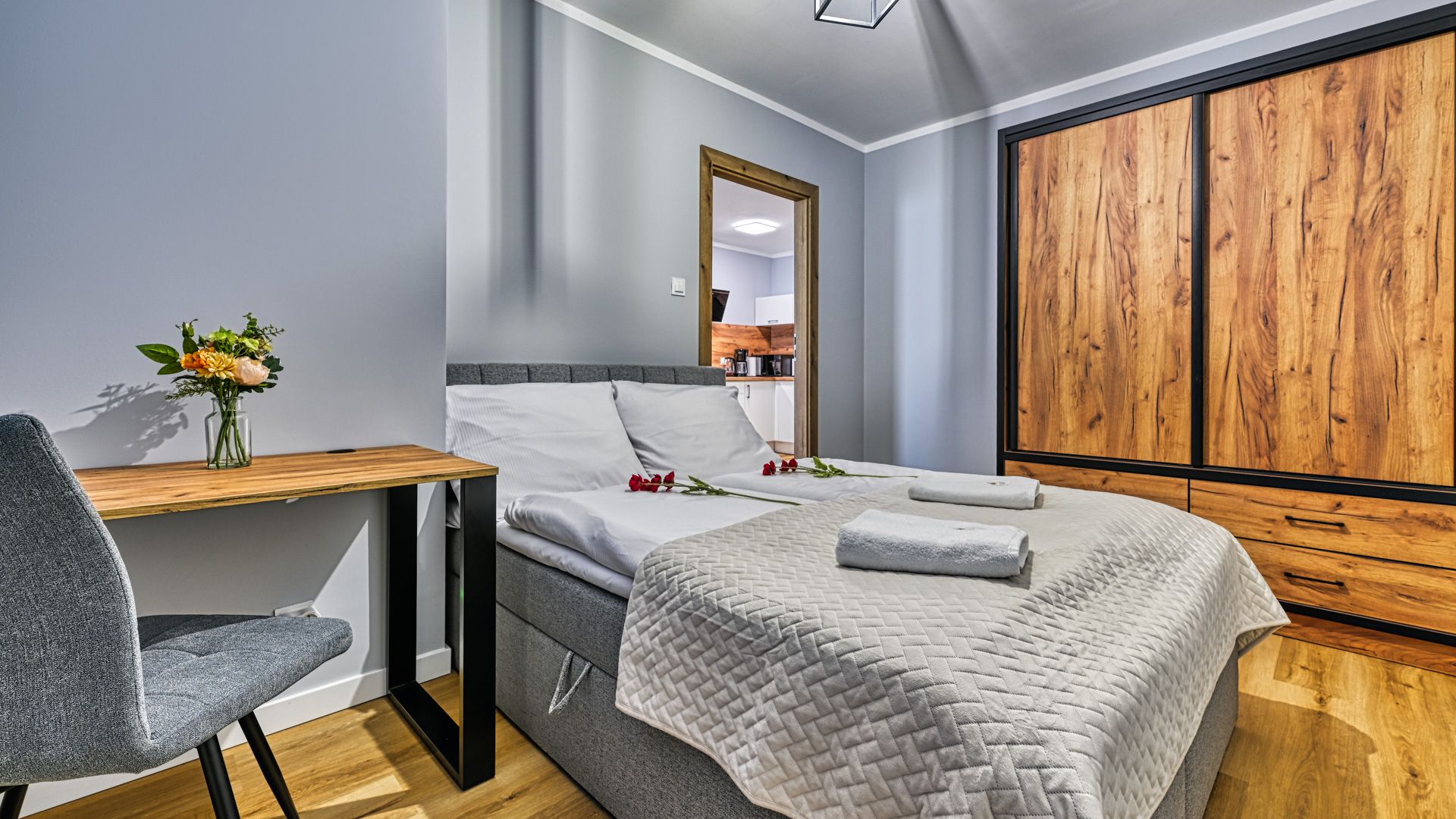 Apartament posiada również przytulną sypialnię, która zapewni komfortowy sen po dniu pełnym zwiedzania. Sypialnia jest wyposażona w wygodne łóżko oraz szafę, w której można przechowywać swoje rzeczy.
