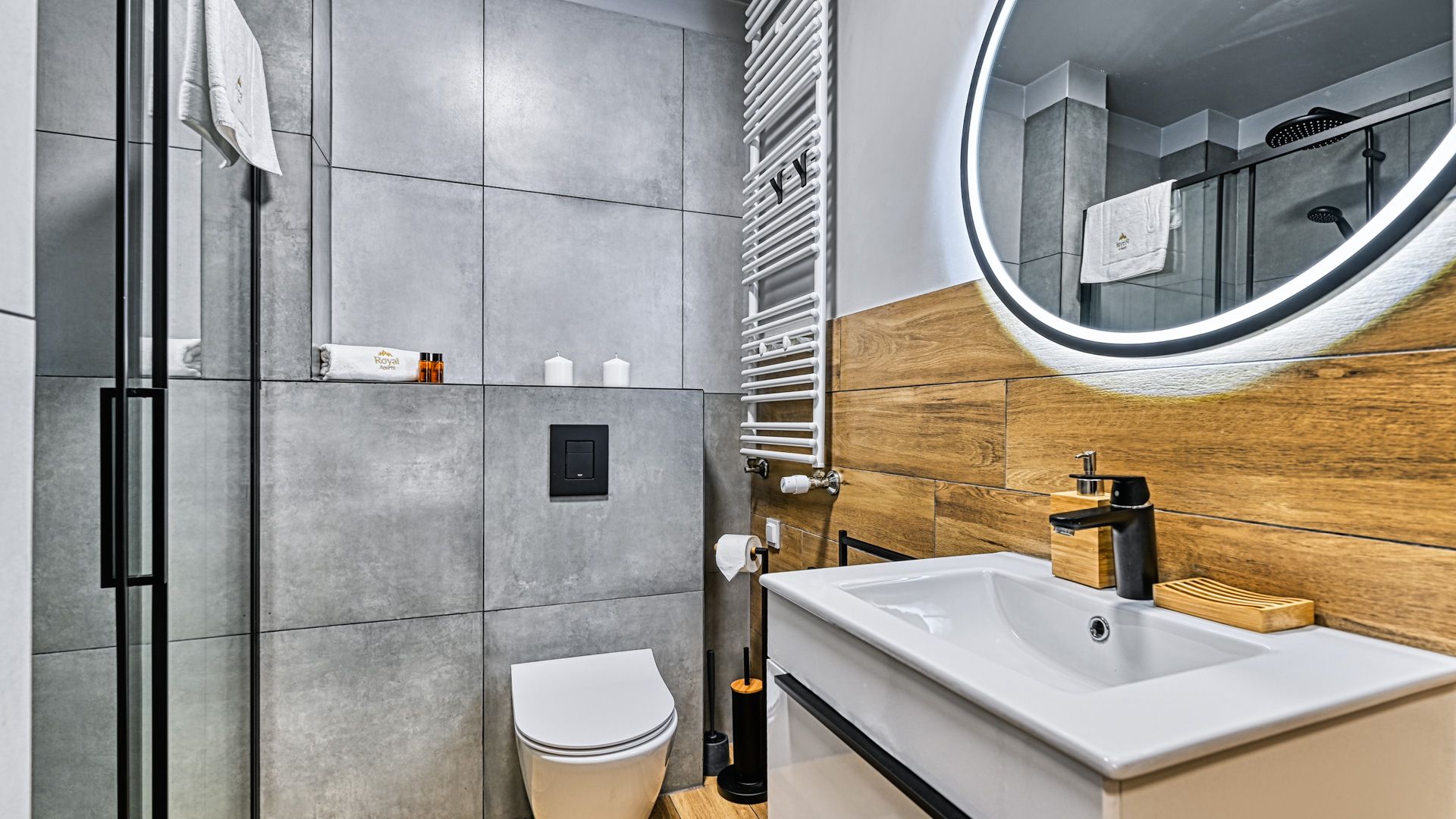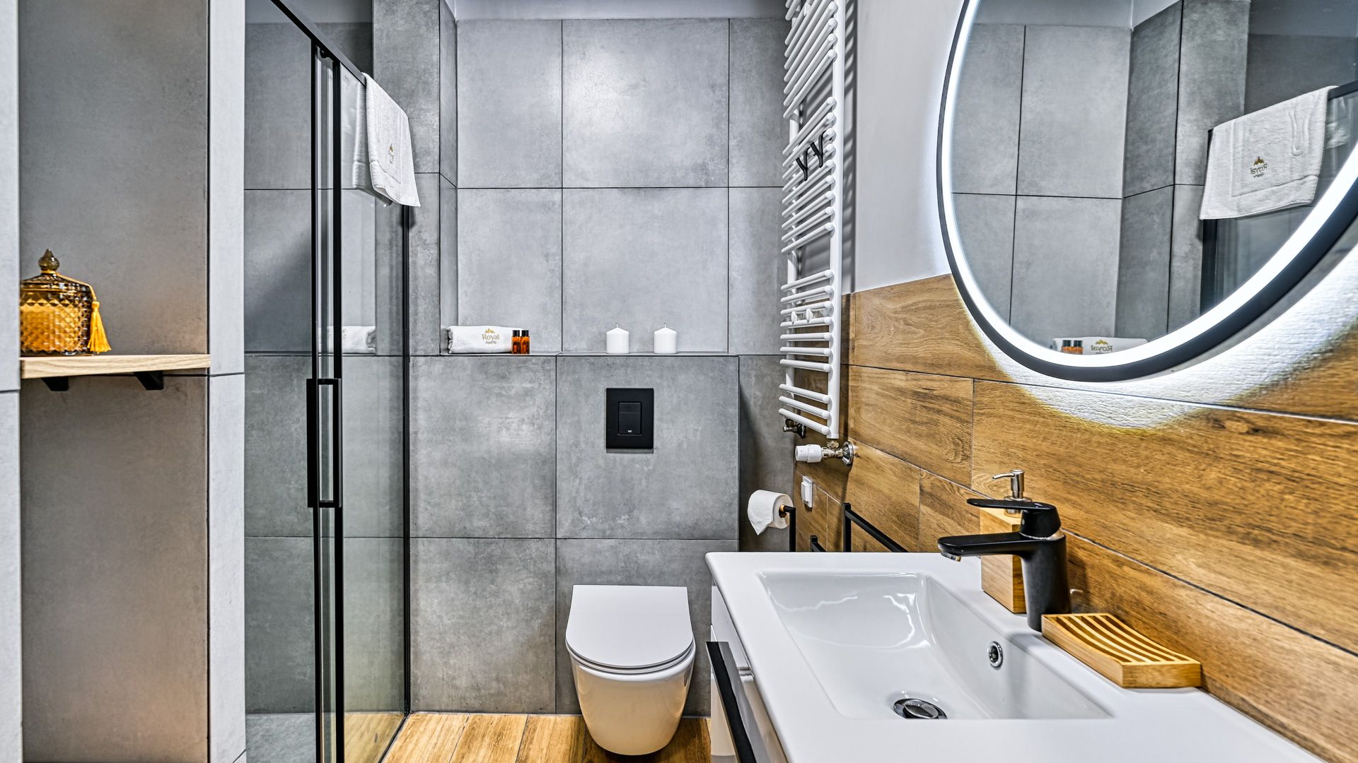 Łazienka apartamentu jest elegancka i wyposażona w prysznic, umywalkę i toaletę. Wszystkie niezbędne ręczniki i przybory toaletowe są dostępne na miejscu, aby zapewnić wygodę i komfort podczas pobytu.