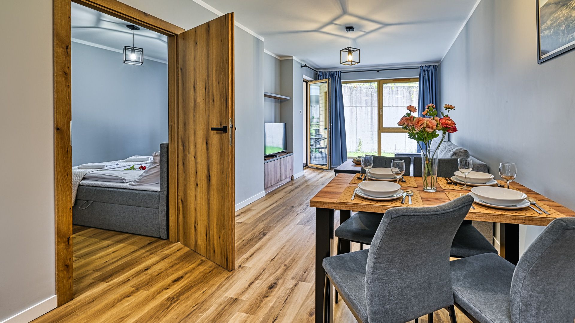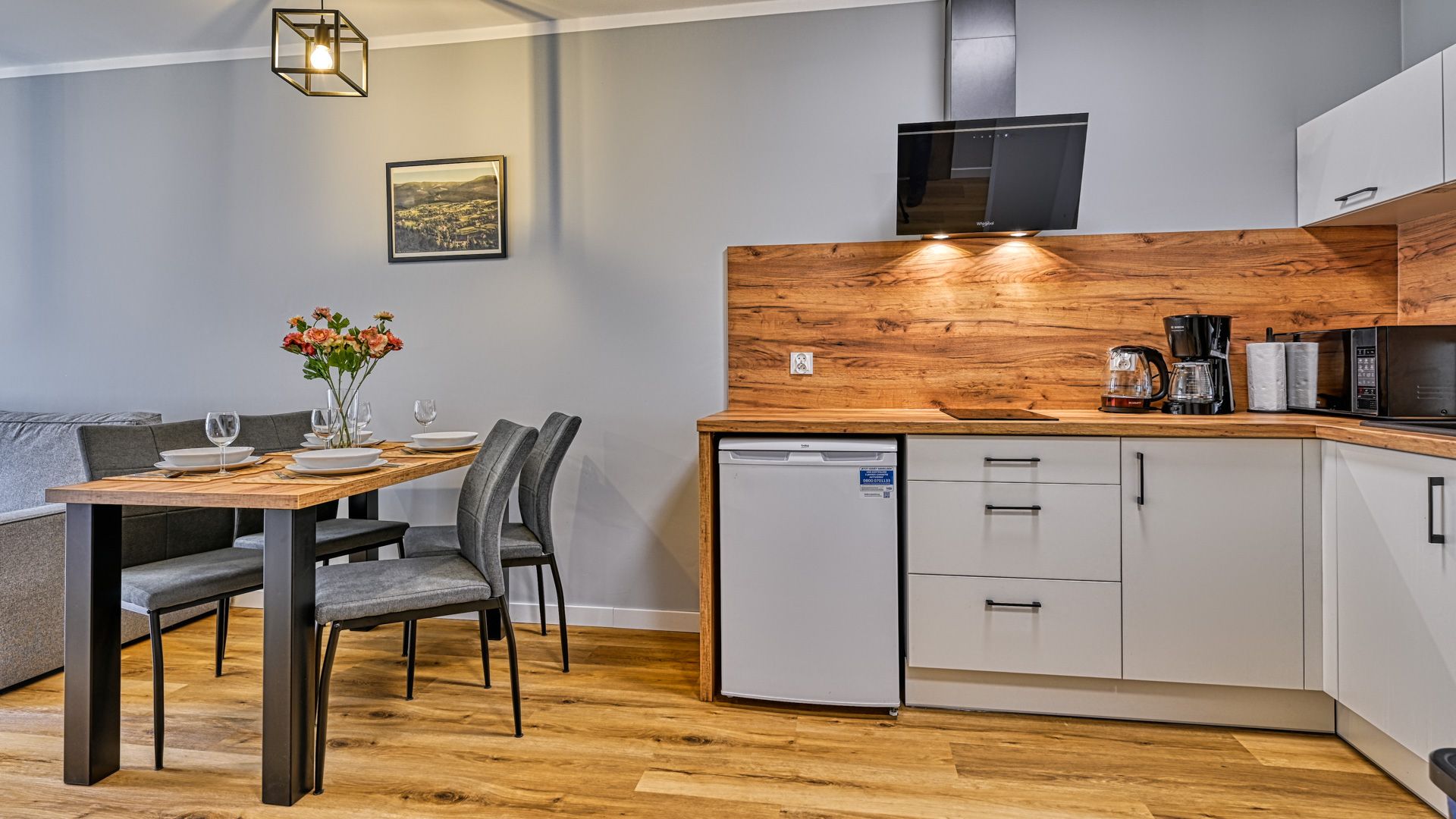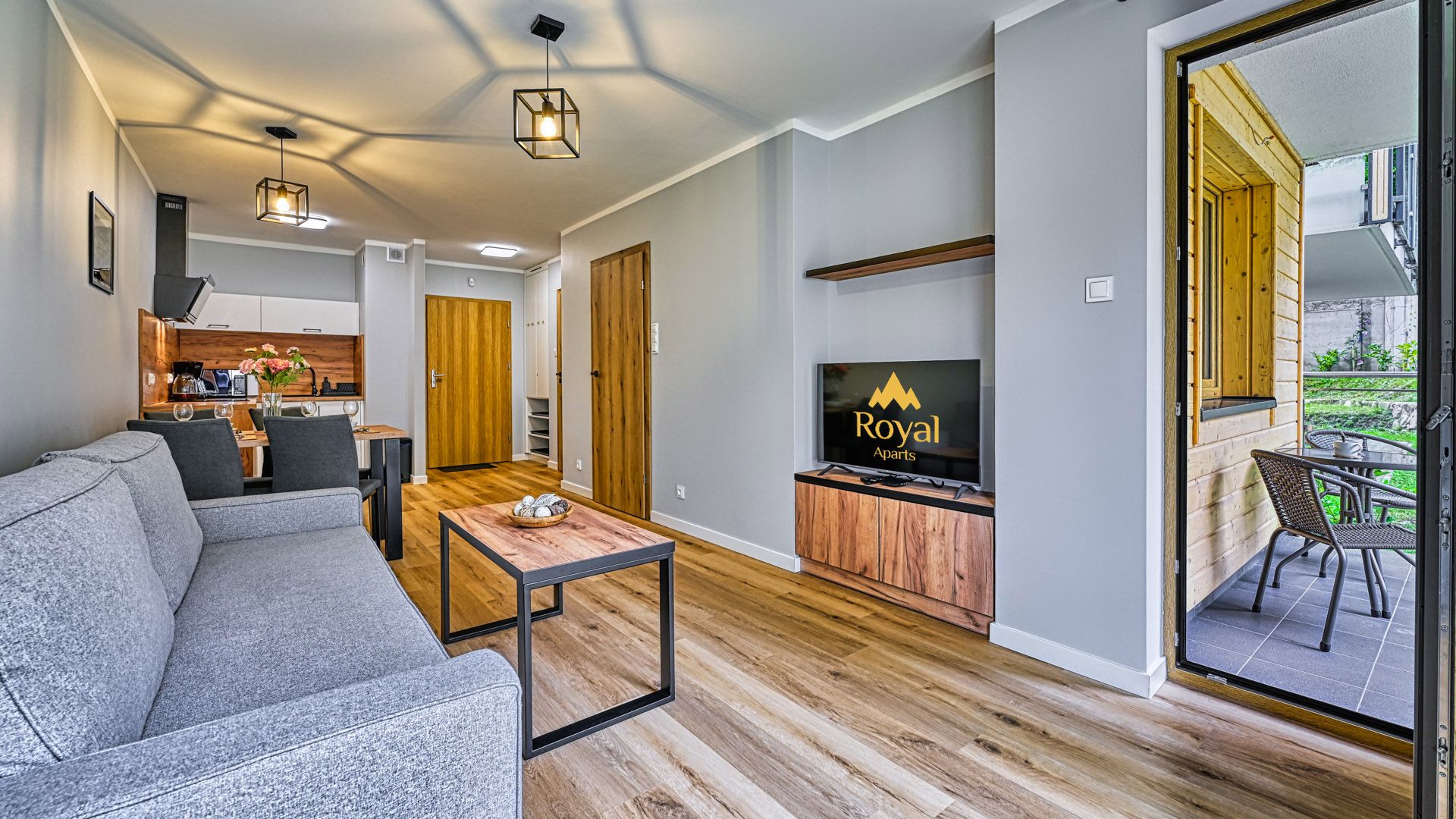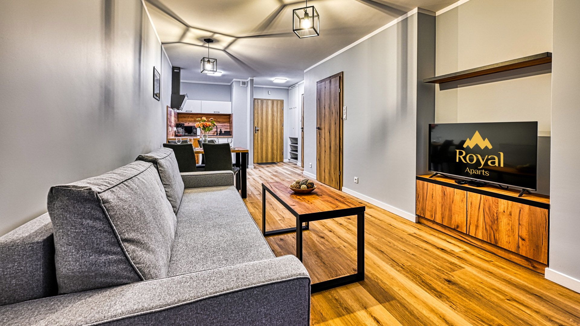 Po wejściu do apartamentu zostaniesz powitany przez przestronny salon z aneksem kuchennym. Salon został urządzony w nowoczesnym stylu z wygodną sofą. To idealne miejsce do relaksu i spędzania czasu w towarzystwie. Telewizor z płaskim ekranem oraz dostęp do Wi-Fi zapewnią rozrywkę i łączność podczas pobytu.