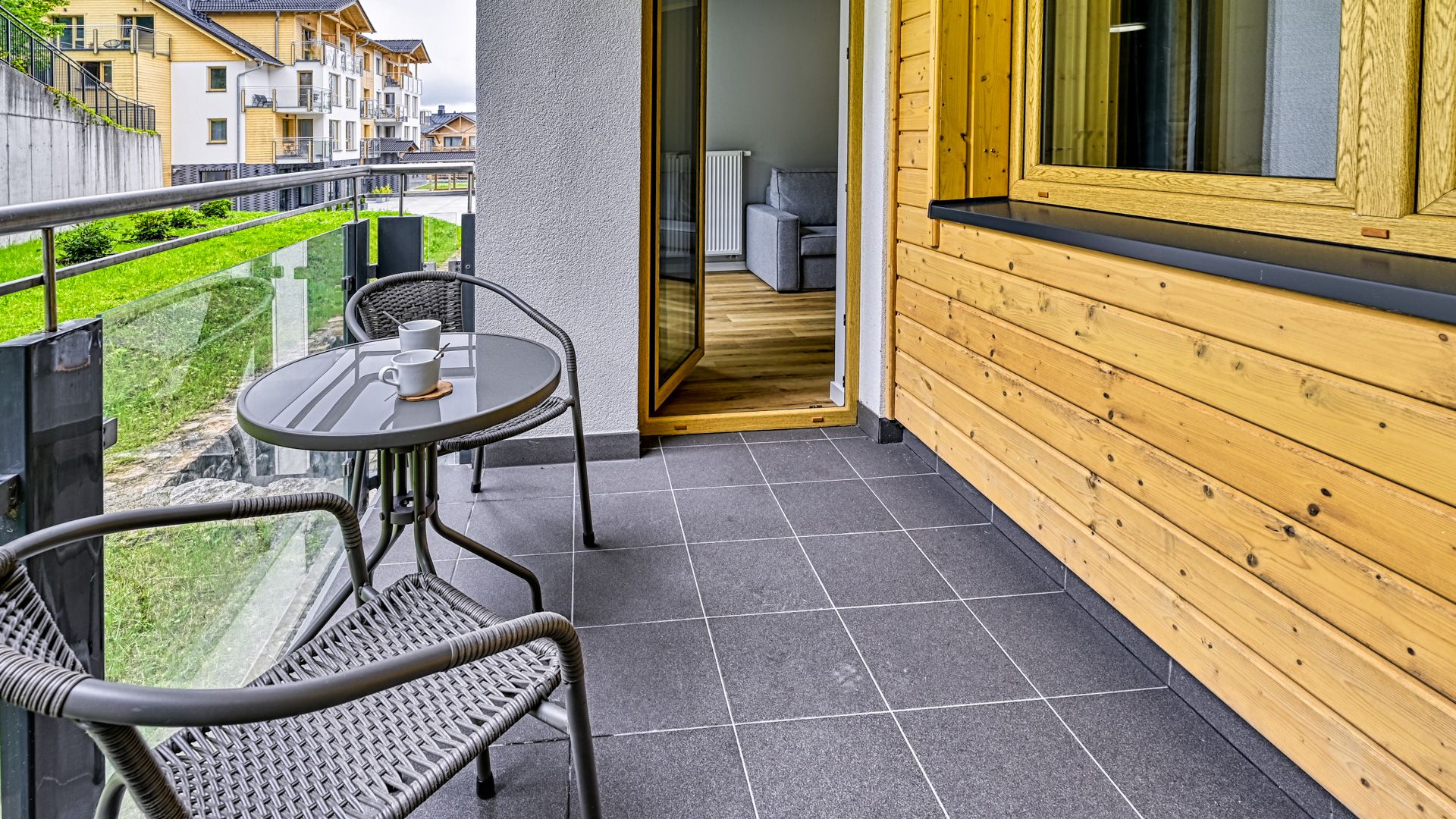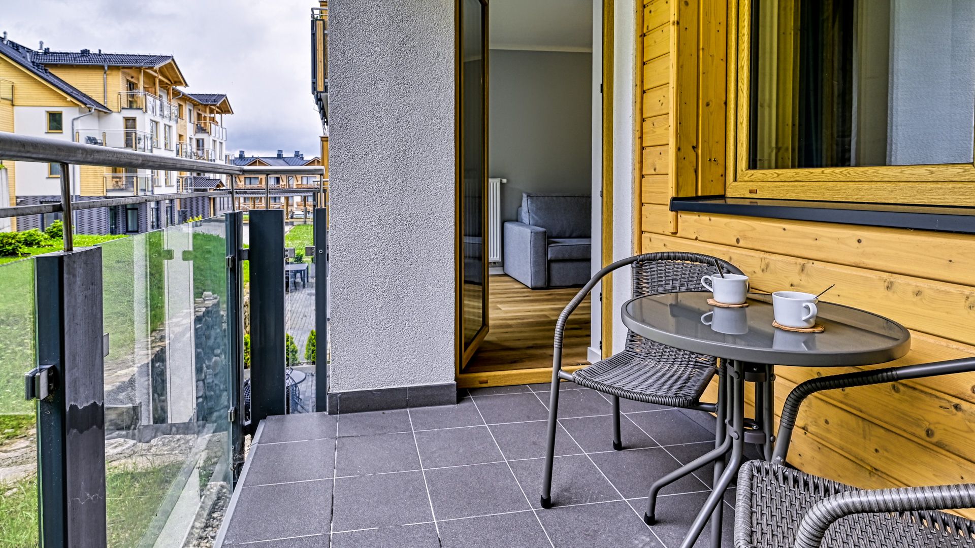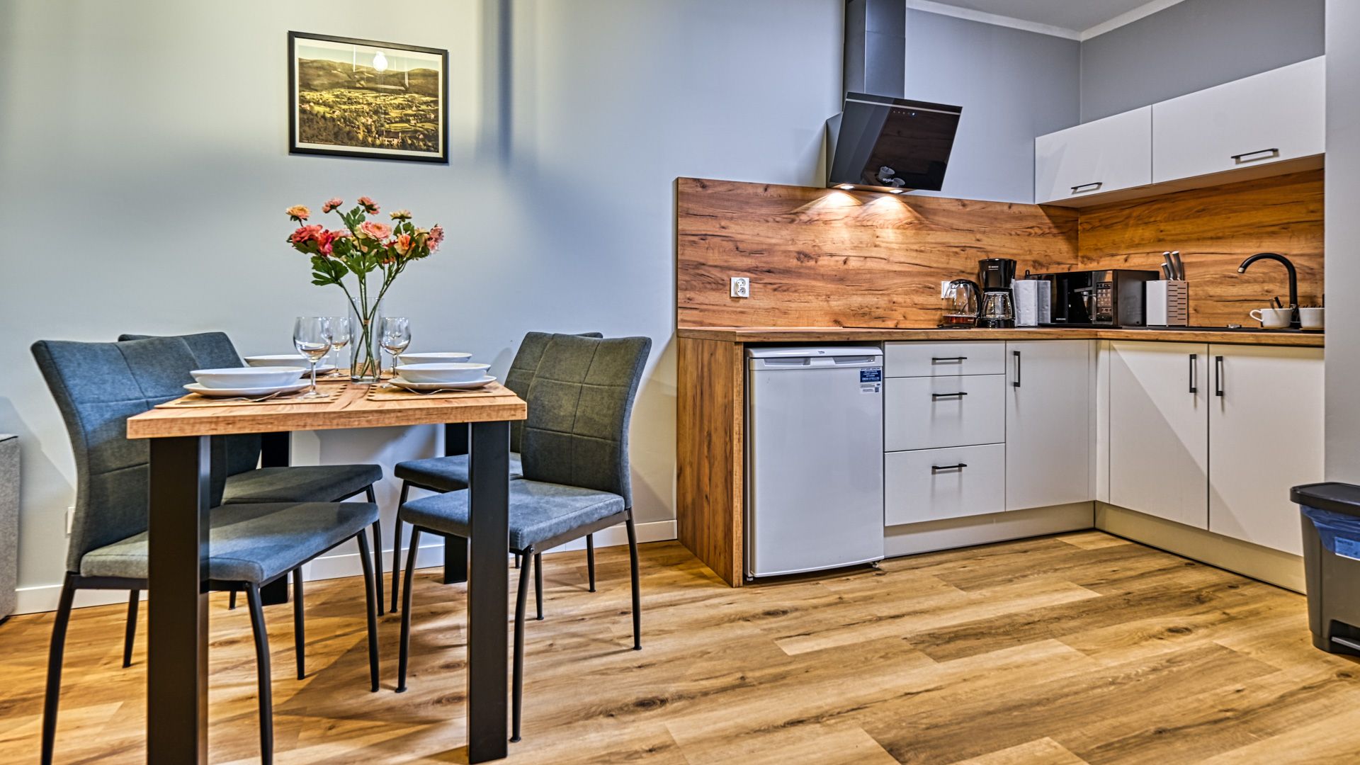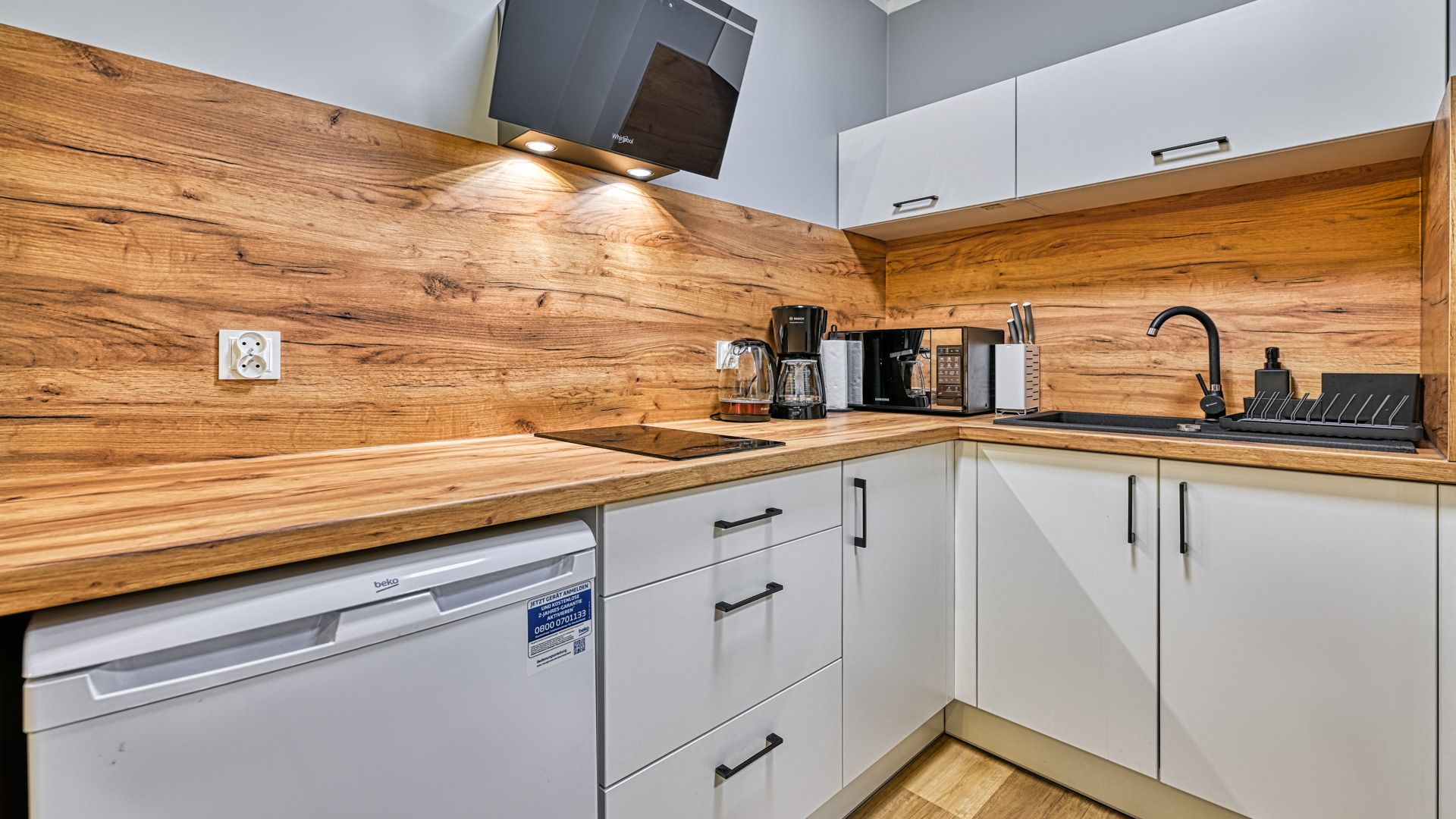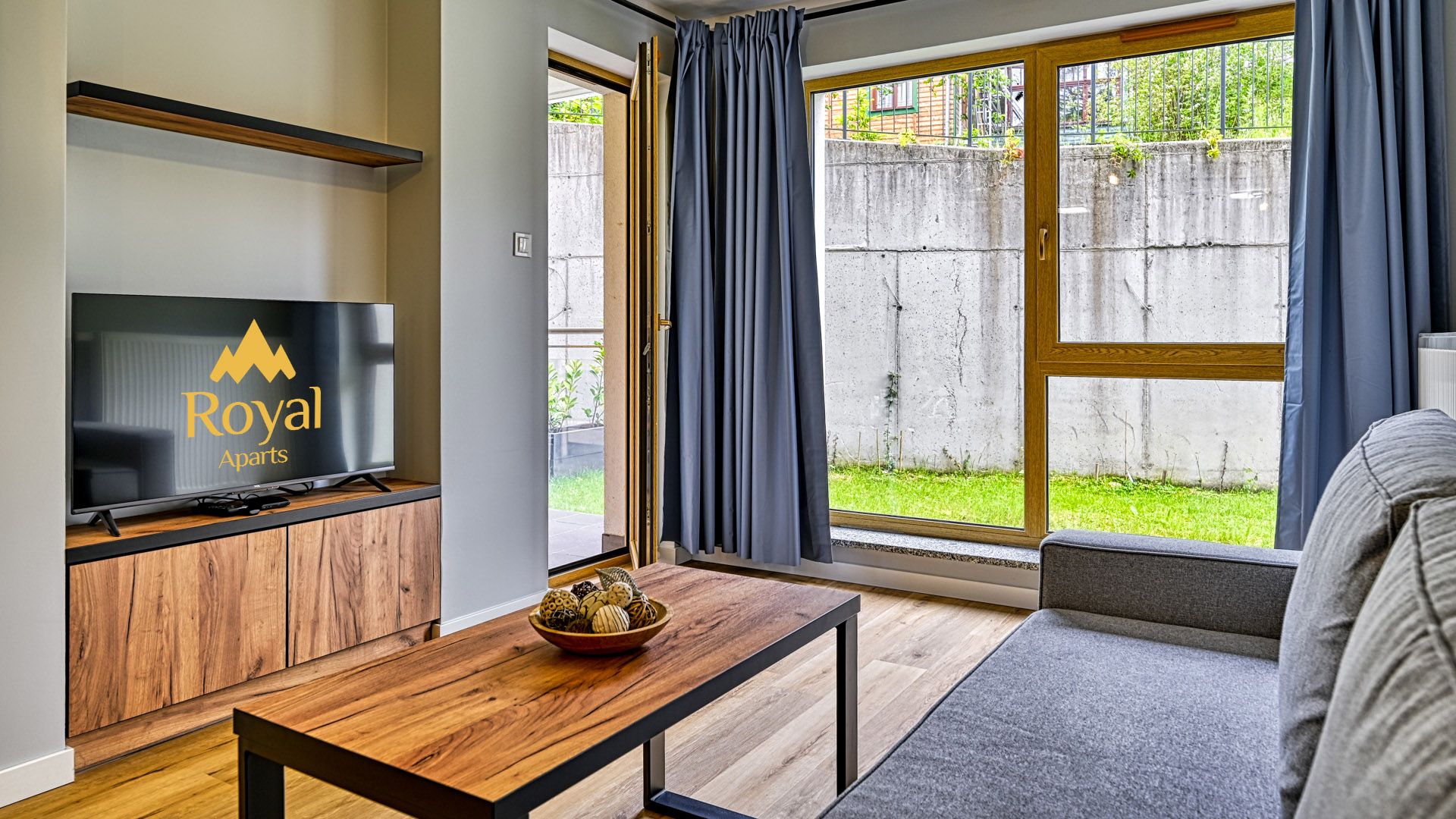 Po wejściu do apartamentu zostaniesz powitany przez przestronny salon z aneksem kuchennym. Salon został urządzony w nowoczesnym stylu z wygodną sofą. To idealne miejsce do relaksu i spędzania czasu w towarzystwie. Telewizor z płaskim ekranem oraz dostęp do Wi-Fi zapewnią rozrywkę i łączność podczas pobytu.