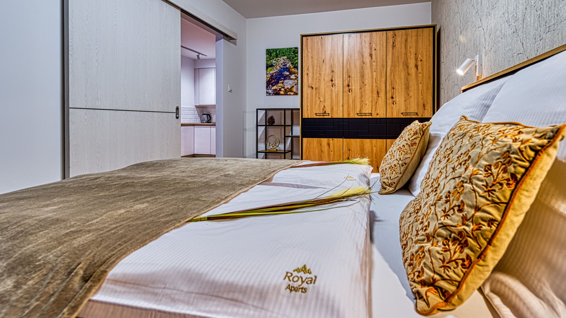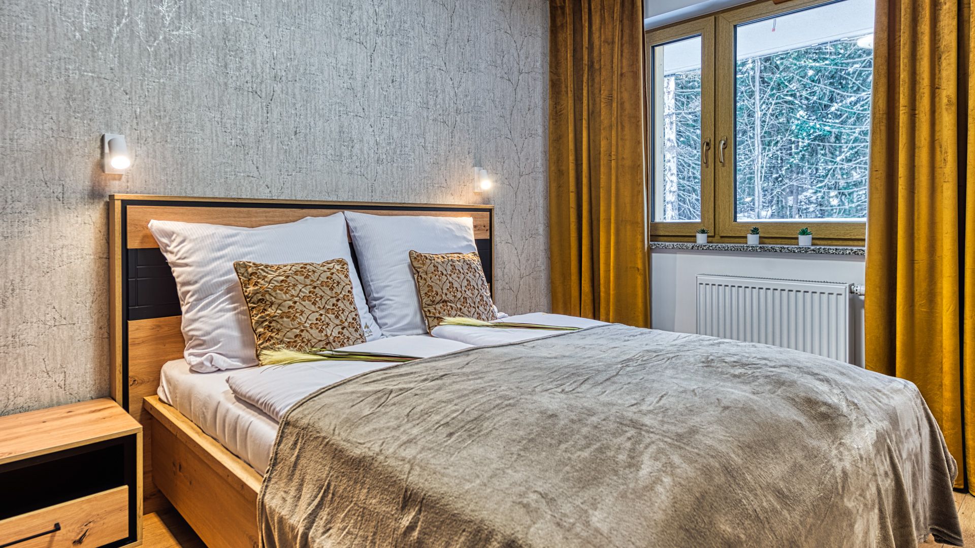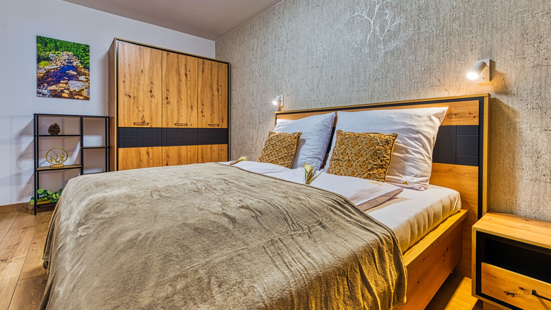 Apartament posiada również przytulną sypialnię, która zapewni komfortowy sen po dniu pełnym zwiedzania. Sypialnia jest wyposażona w wygodne łóżko oraz szafę, w której można przechowywać swoje rzeczy. Dodatkowo, dostępne są również dodatkowe miejsca do spania, takie jak rozkładana sofa w salonie.