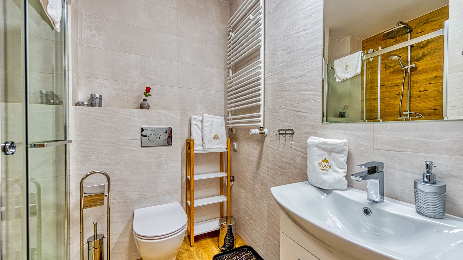 Łazienka apartamentu jest elegancka i wyposażona w prysznic, umywalkę i toaletę. Wszystkie niezbędne ręczniki i przybory toaletowe są dostępne na miejscu, aby zapewnić wygodę i komfort podczas pobytu.