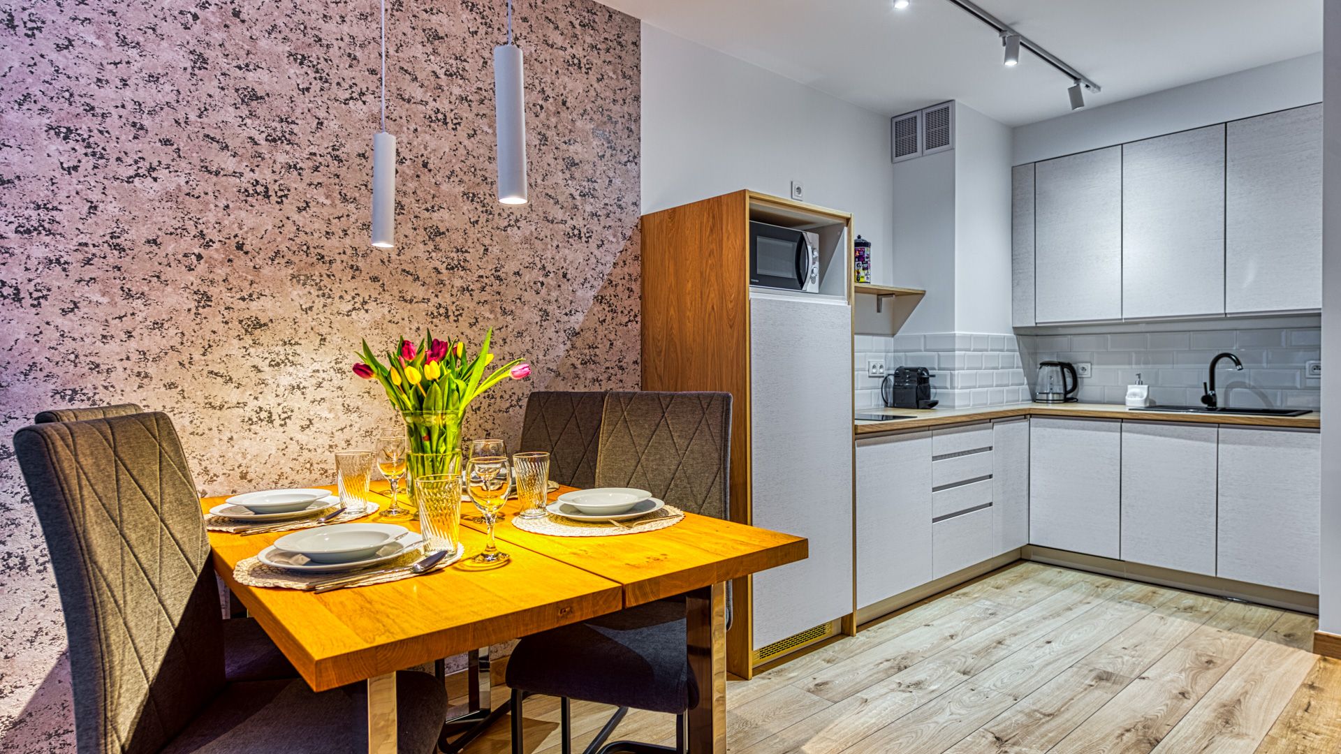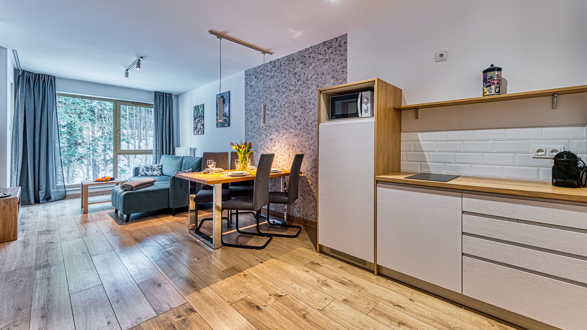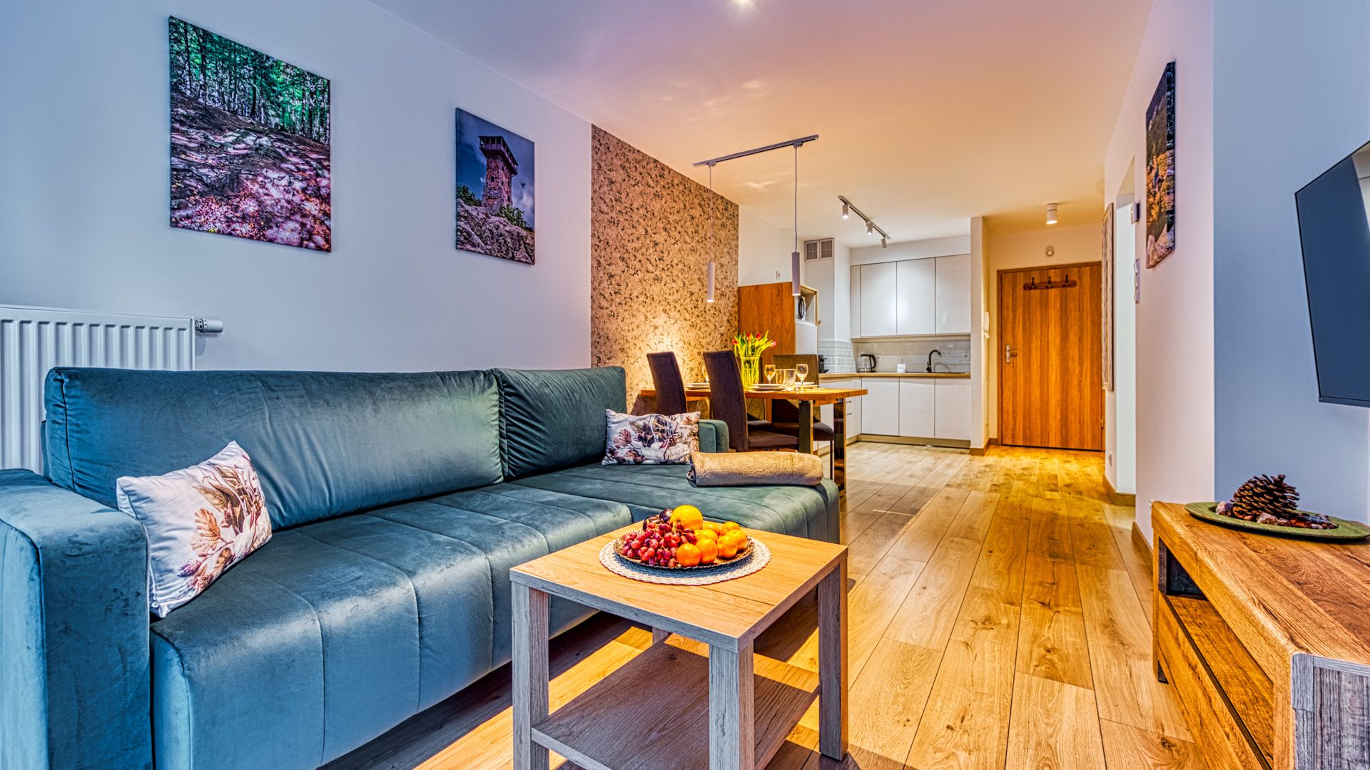 Po wejściu do apartamentu zostaniesz powitany przez przestronny salon z aneksem kuchennym. Salon został urządzony w nowoczesnym stylu z wygodną sofą. To idealne miejsce do relaksu i spędzania czasu w towarzystwie. Telewizor z płaskim ekranem oraz dostęp do Wi-Fi zapewnią rozrywkę i łączność podczas pobytu.