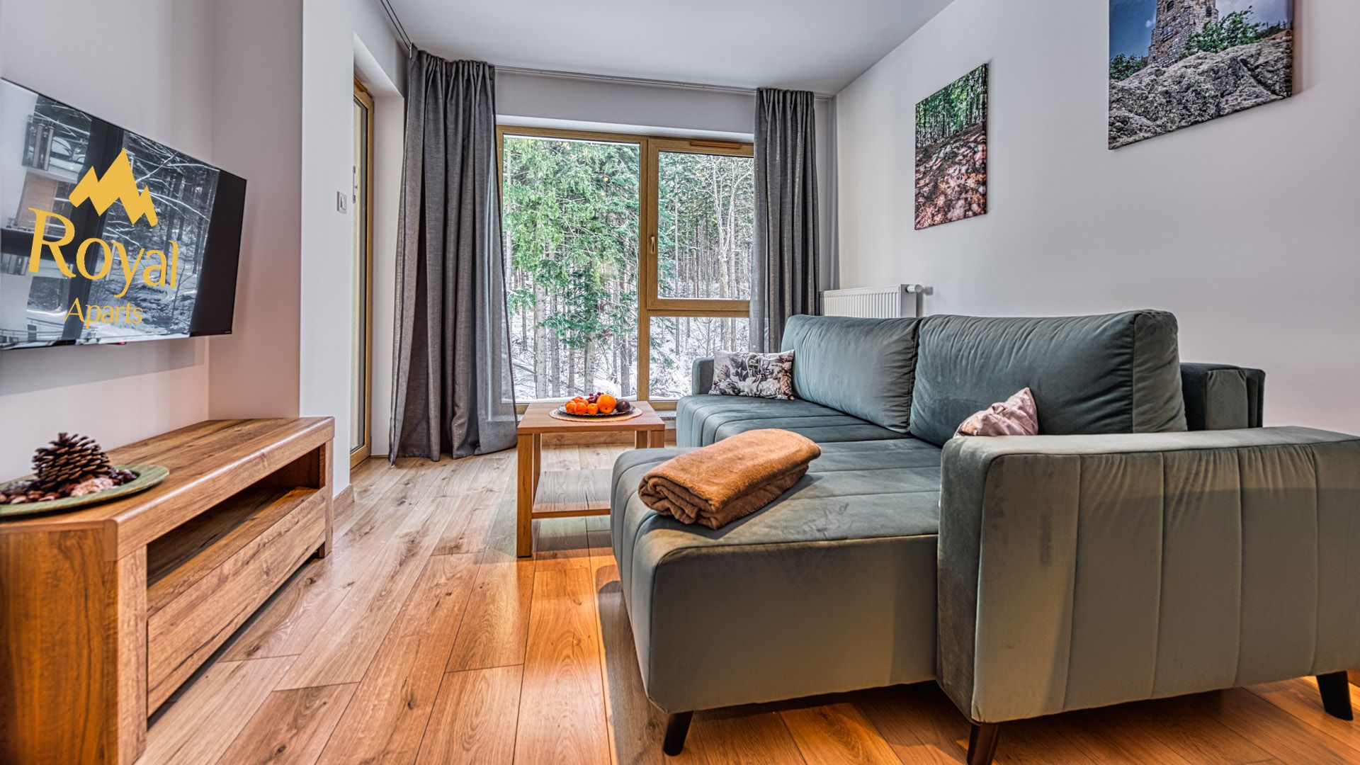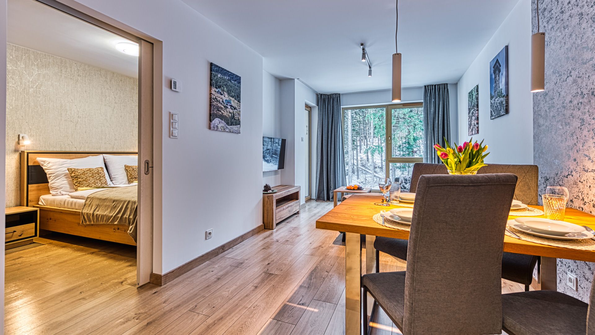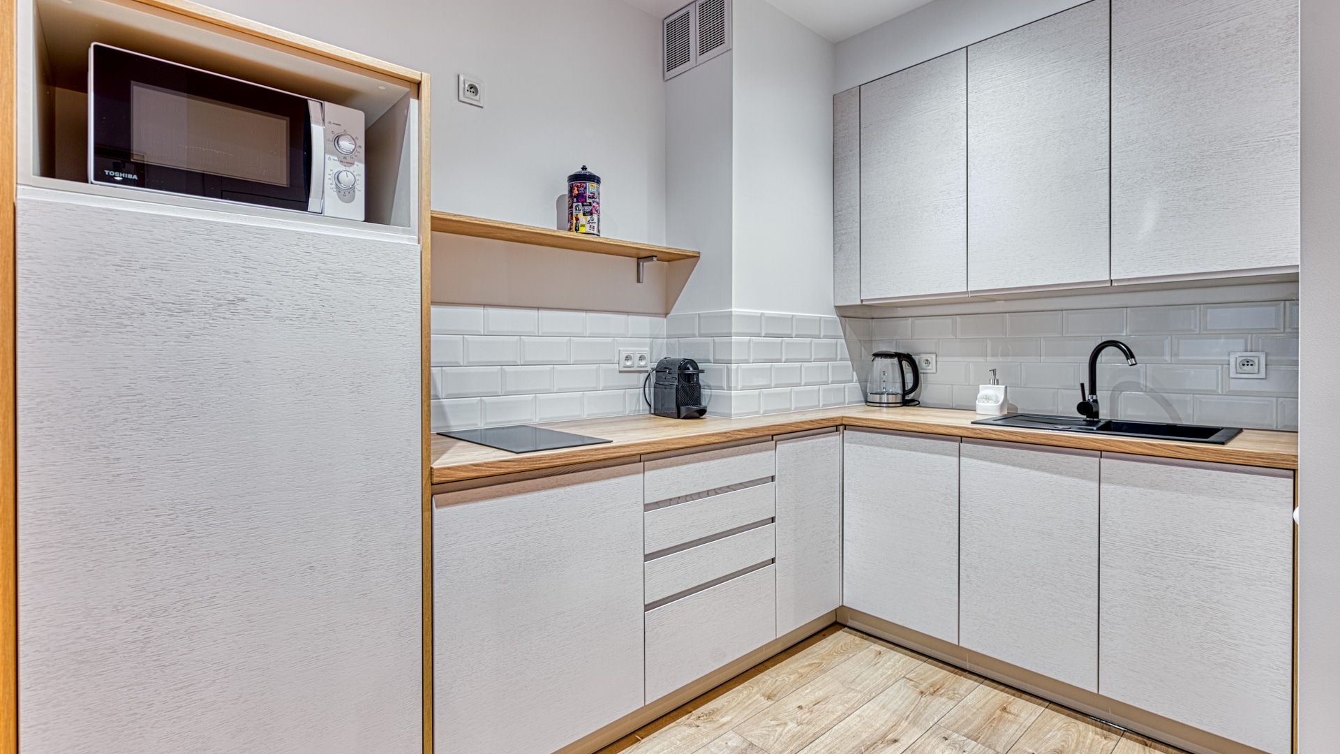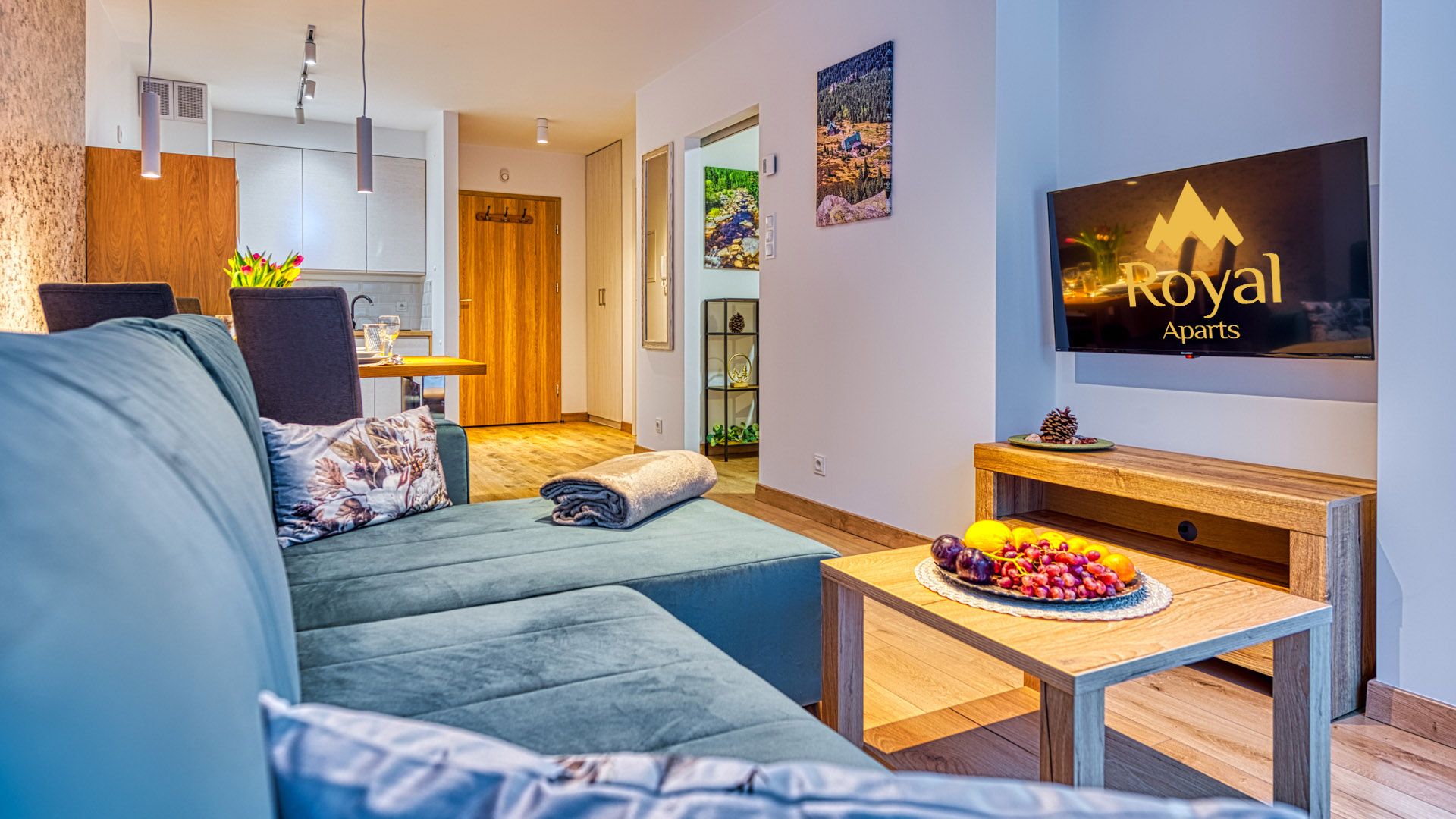 Po wejściu do apartamentu zostaniesz powitany przez przestronny salon z aneksem kuchennym. Salon został urządzony w nowoczesnym stylu z wygodną sofą. To idealne miejsce do relaksu i spędzania czasu w towarzystwie. Telewizor z płaskim ekranem oraz dostęp do Wi-Fi zapewnią rozrywkę i łączność podczas pobytu.