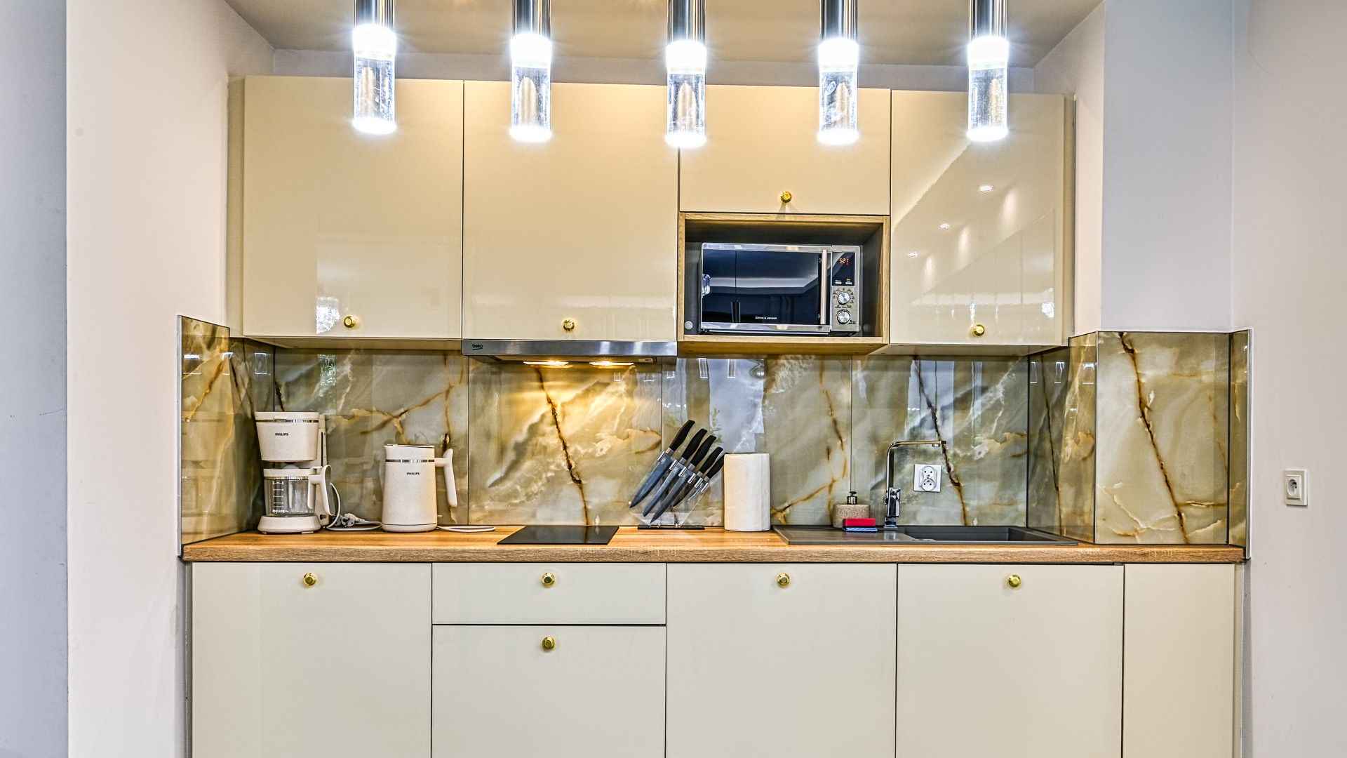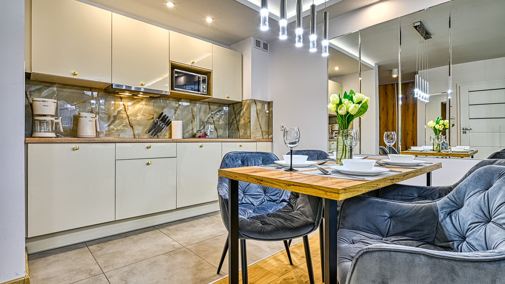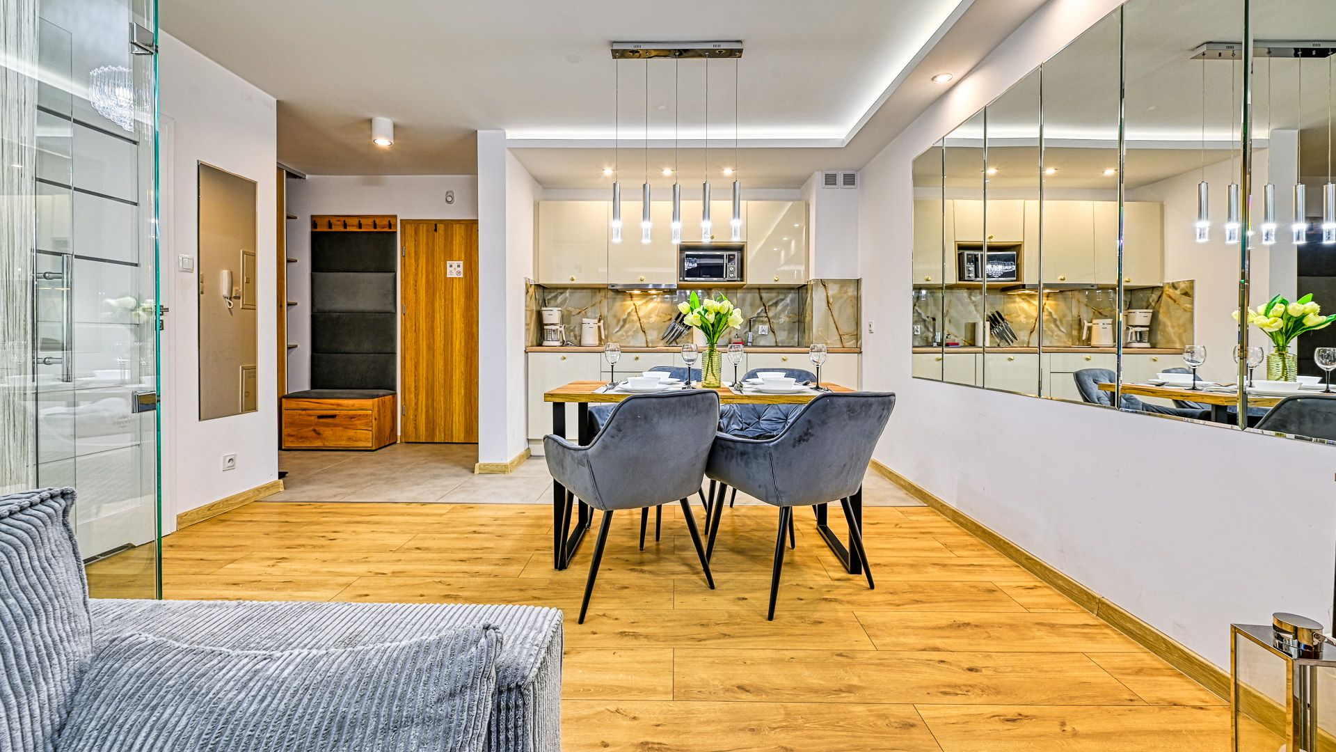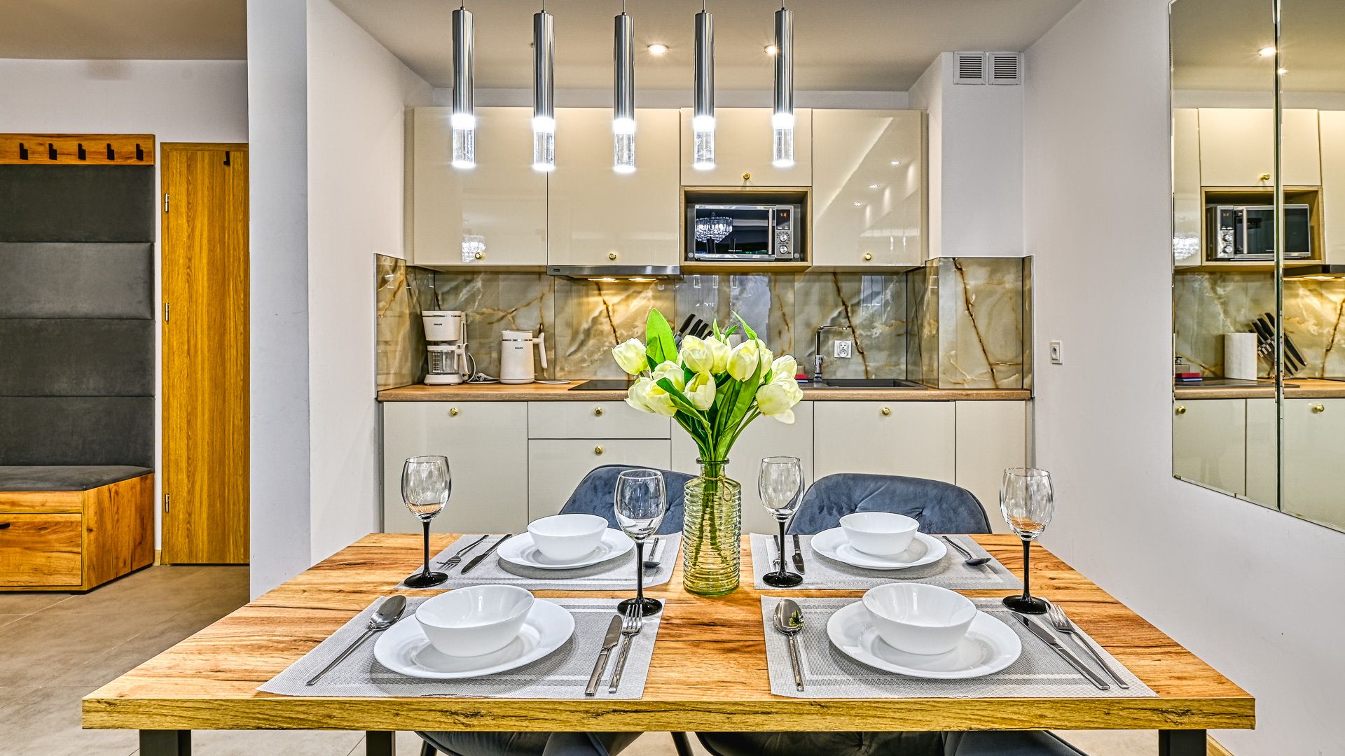 Aneks kuchenny jest w pełni wyposażony i oferuje wszystkie niezbędne urządzenia i przybory kuchenne, które umożliwią Ci przygotowanie pysznych posiłków. Przy stole jadalnym znajduje się miejsce dla wszystkich gości, aby można było wspólnie spożywać posiłki i cieszyć się towarzystwem. W skład wyposażenia apartamentu wchodzą również zmywarka i ekspres do kawy.