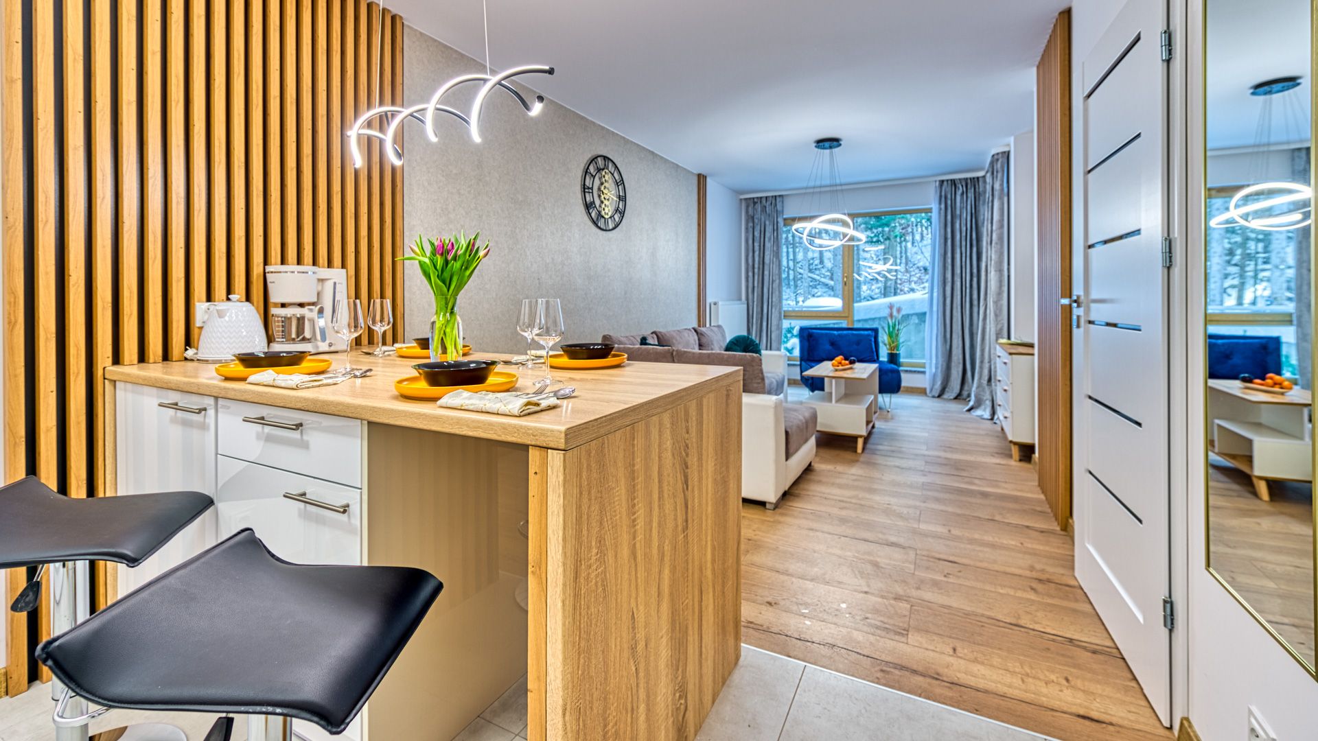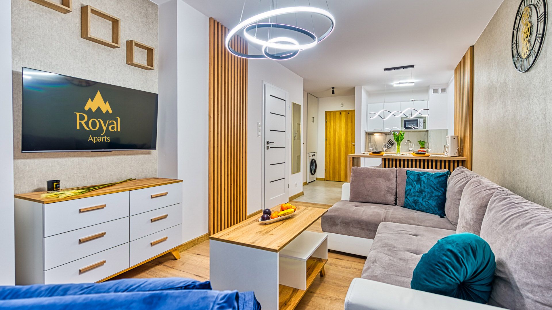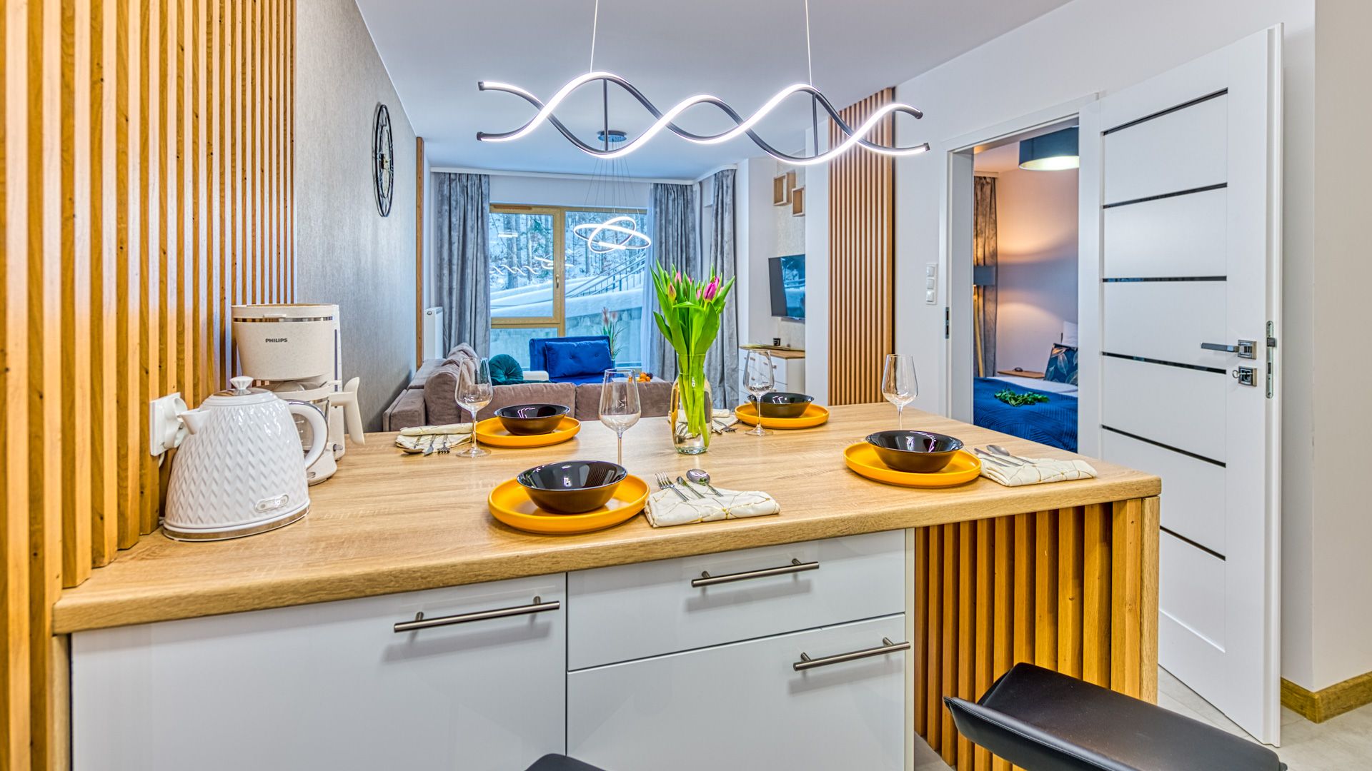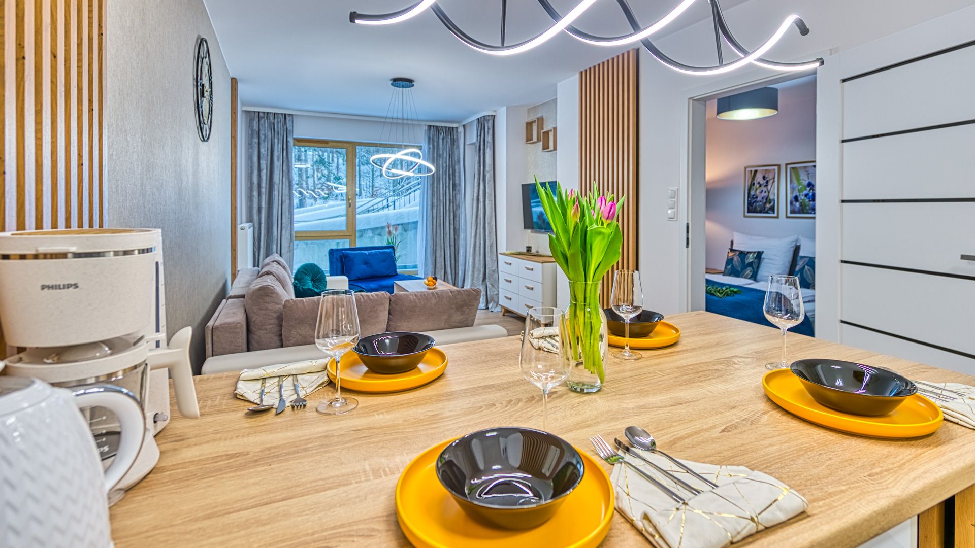 Po wejściu do apartamentu zostaniesz powitany przez przestronny salon z aneksem kuchennym. Salon został urządzony w nowoczesnym stylu z wygodną sofą i fotelem, idealnymi do relaksu i spędzania czasu w towarzystwie. Telewizor z płaskim ekranem oraz dostęp do Wi-Fi zapewnią rozrywkę i łączność podczas pobytu.