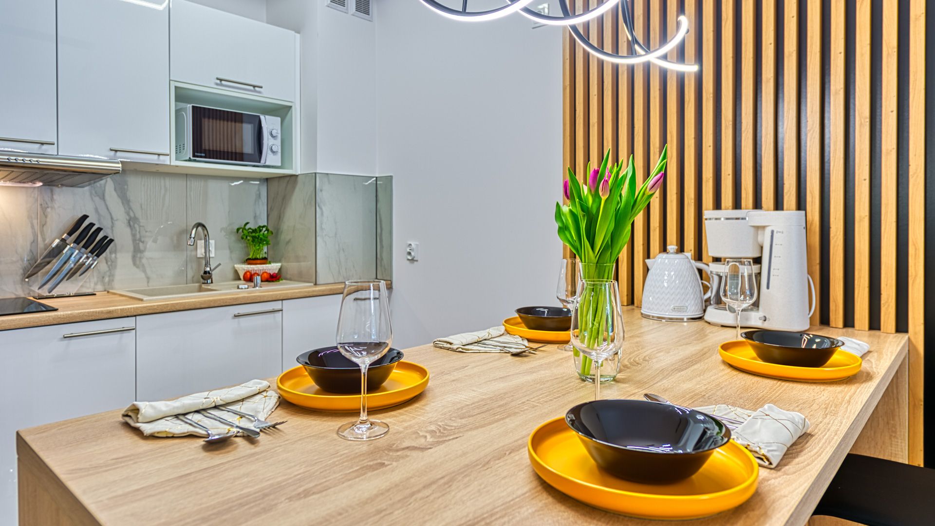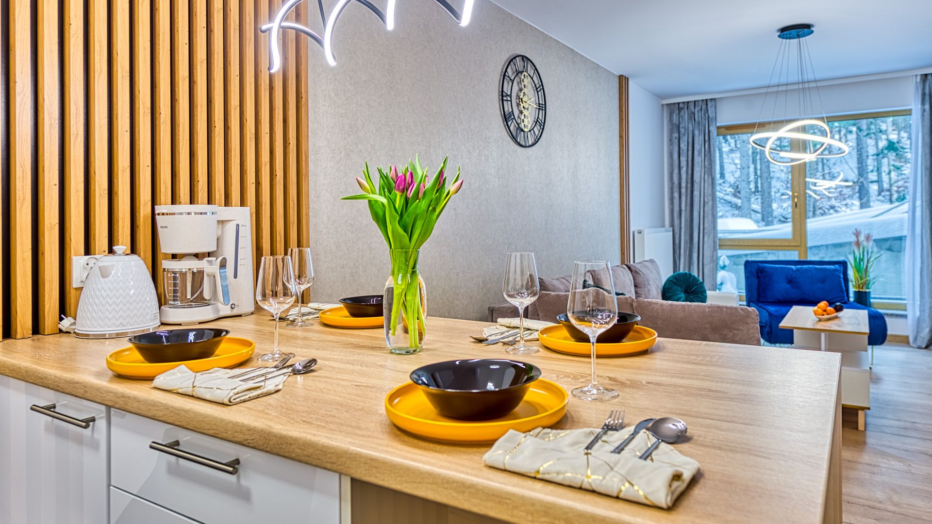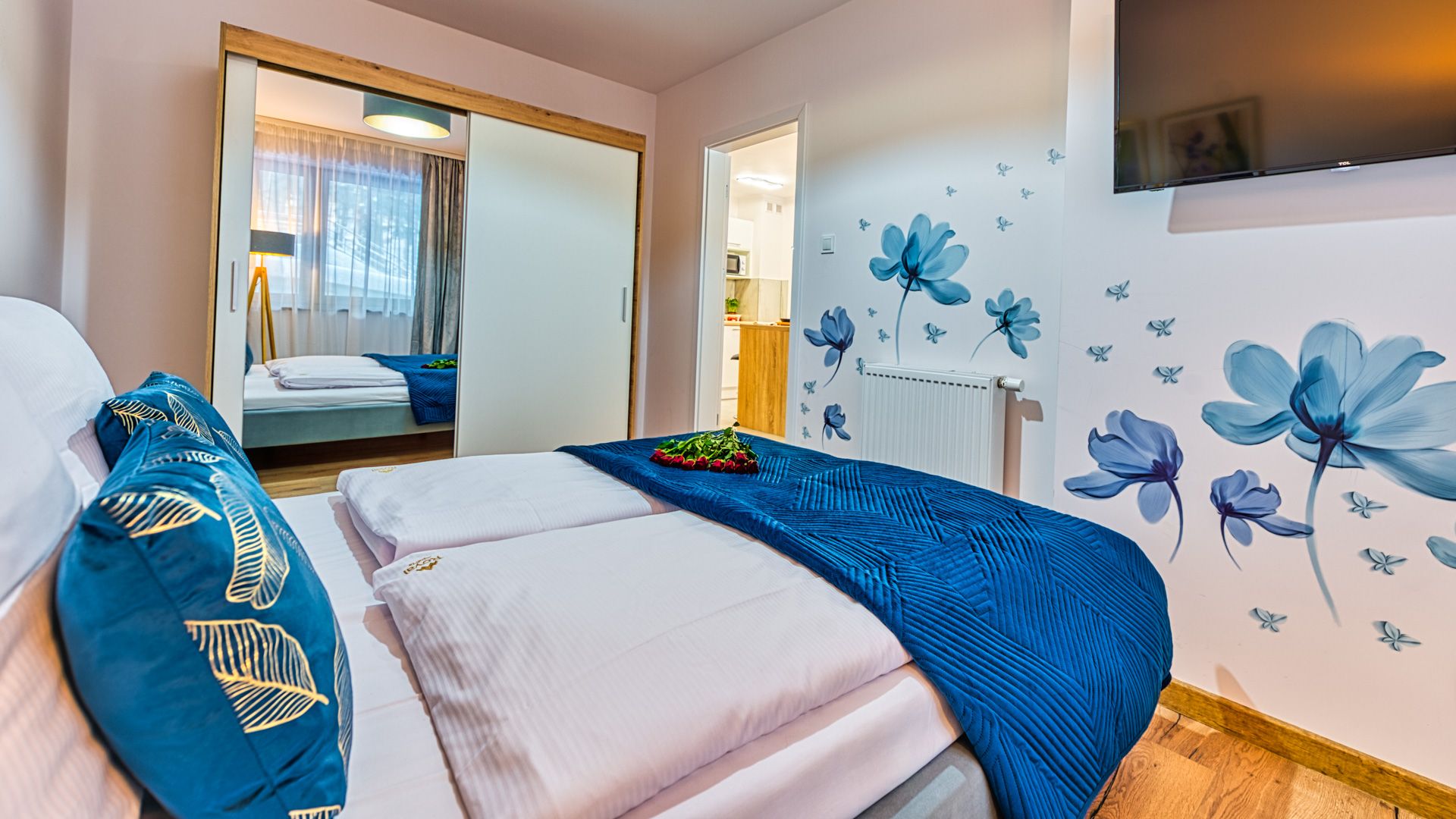 Po wejściu do apartamentu zostaniesz powitany przez przestronny salon z aneksem kuchennym. Salon został urządzony w nowoczesnym stylu z wygodną sofą i fotelem, idealnymi do relaksu i spędzania czasu w towarzystwie. Telewizor z płaskim ekranem oraz dostęp do Wi-Fi zapewnią rozrywkę i łączność podczas pobytu.