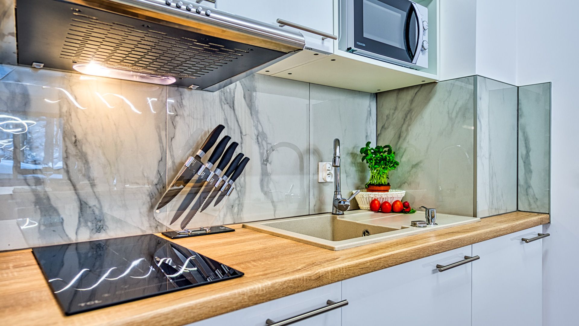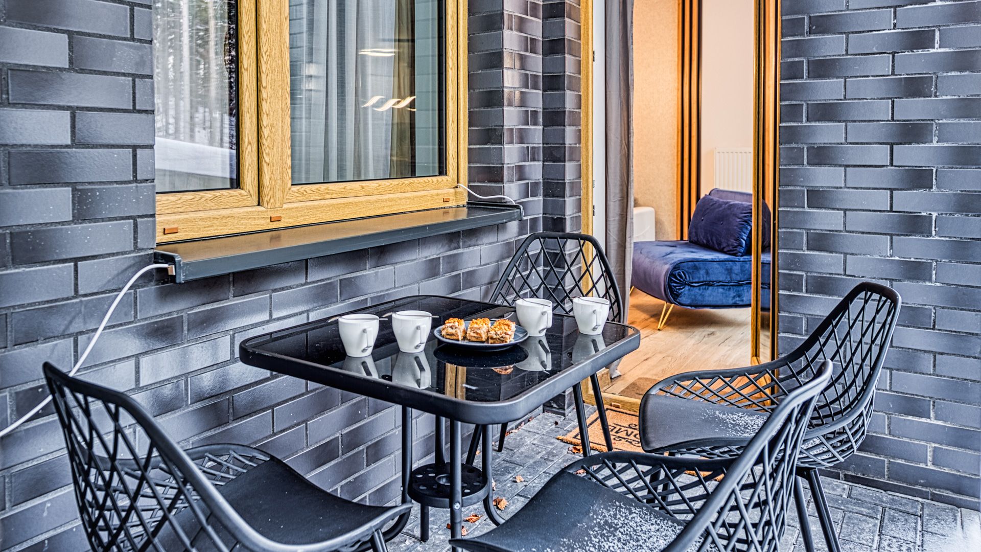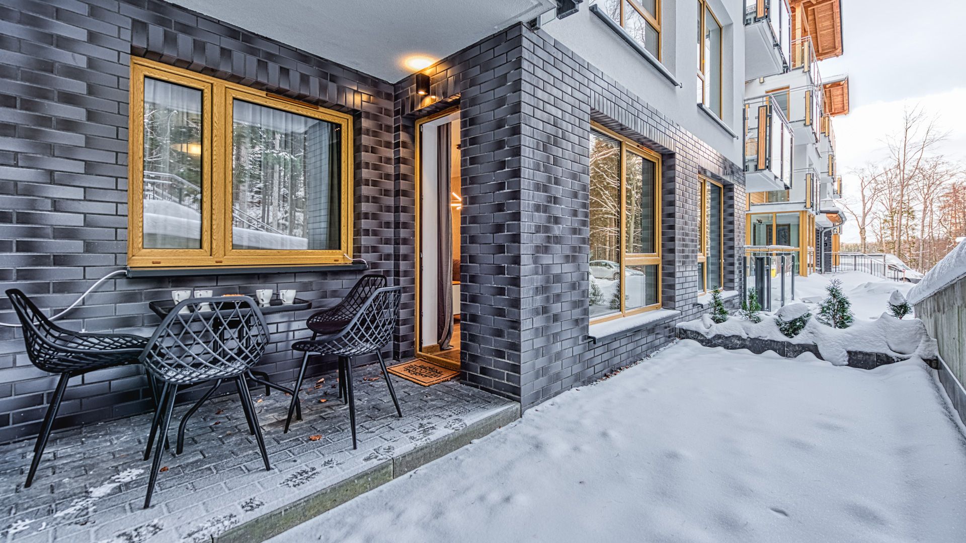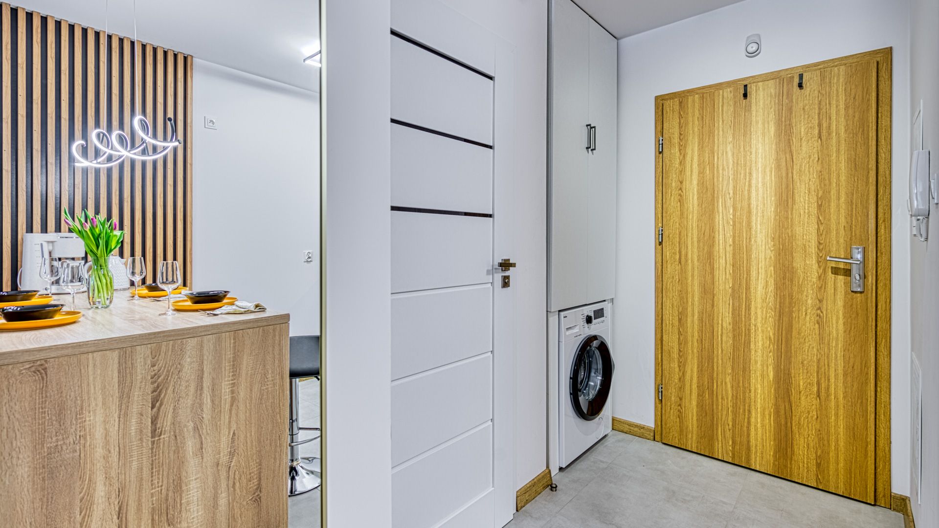 Po wejściu do apartamentu zostaniesz powitany przez przestronny salon z aneksem kuchennym. Salon został urządzony w nowoczesnym stylu z wygodną sofą i fotelem, idealnymi do relaksu i spędzania czasu w towarzystwie. Telewizor z płaskim ekranem oraz dostęp do Wi-Fi zapewnią rozrywkę i łączność podczas pobytu.