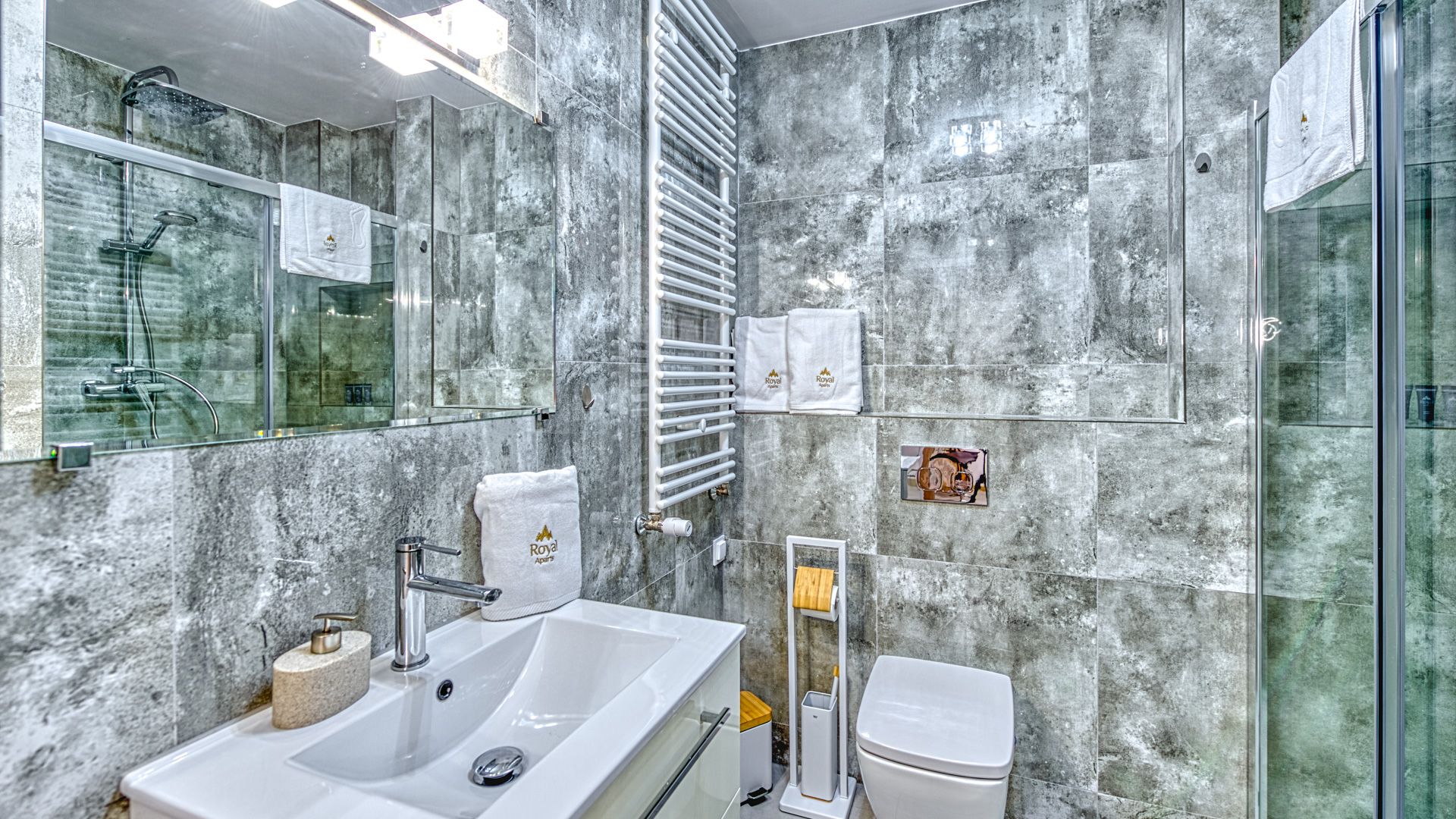 Łazienka apartamentu jest elegancka i wyposażona w prysznic, umywalkę i toaletę. Wszystkie niezbędne ręczniki i przybory toaletowe są dostępne na miejscu, aby zapewnić wygodę i komfort podczas pobytu.