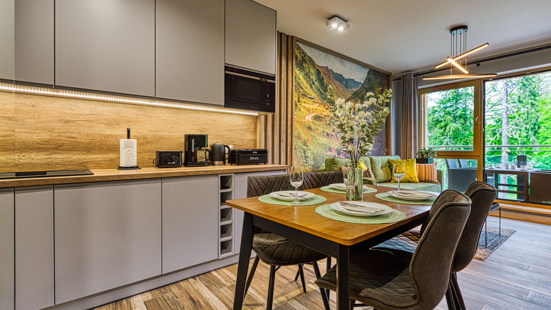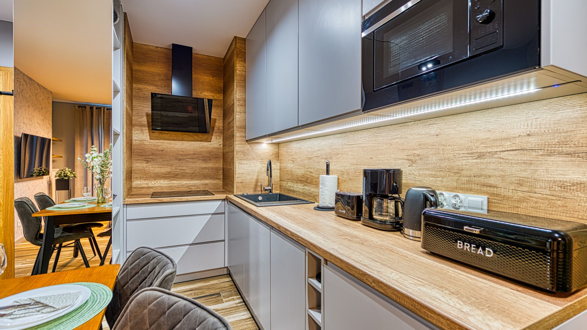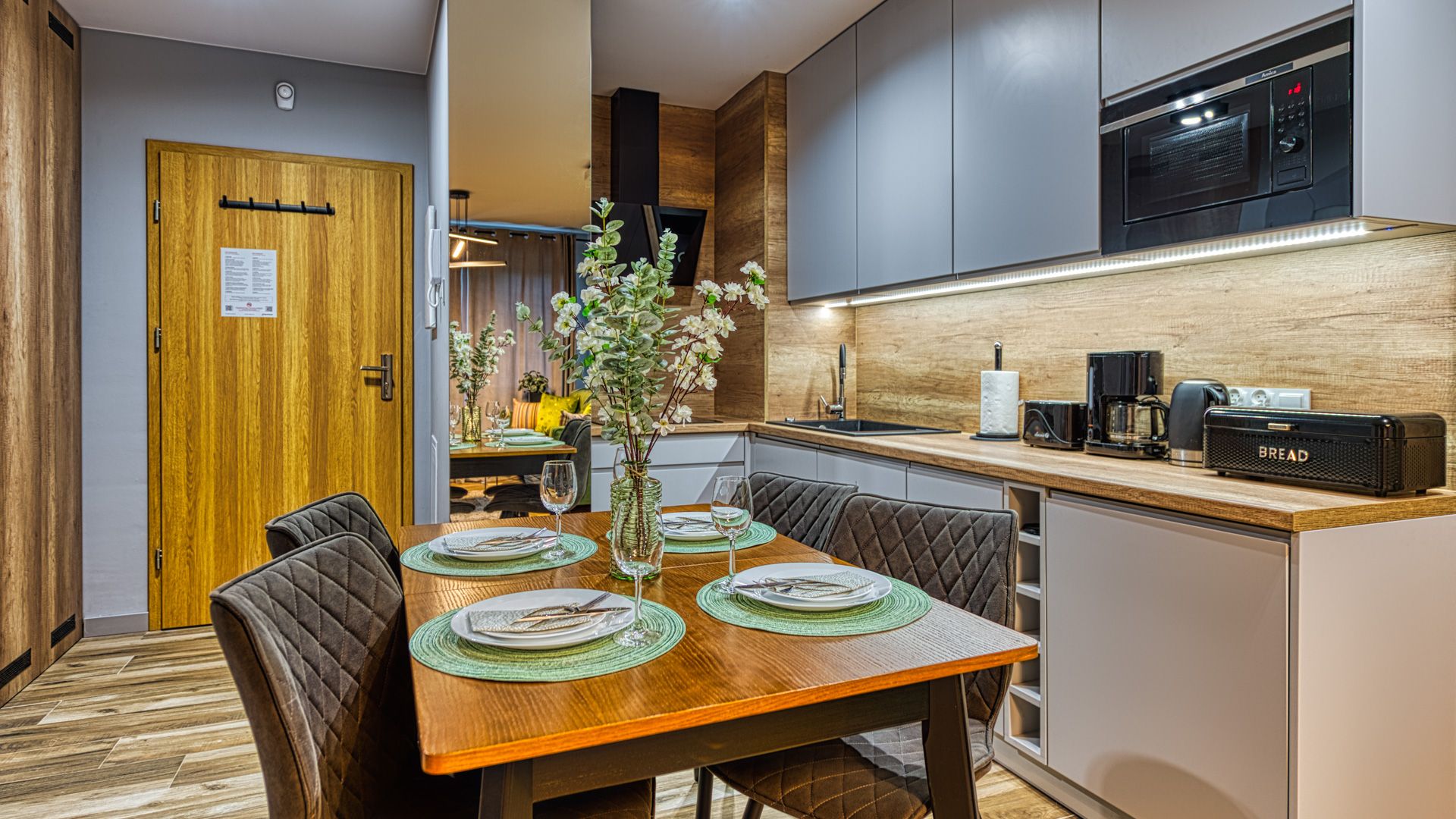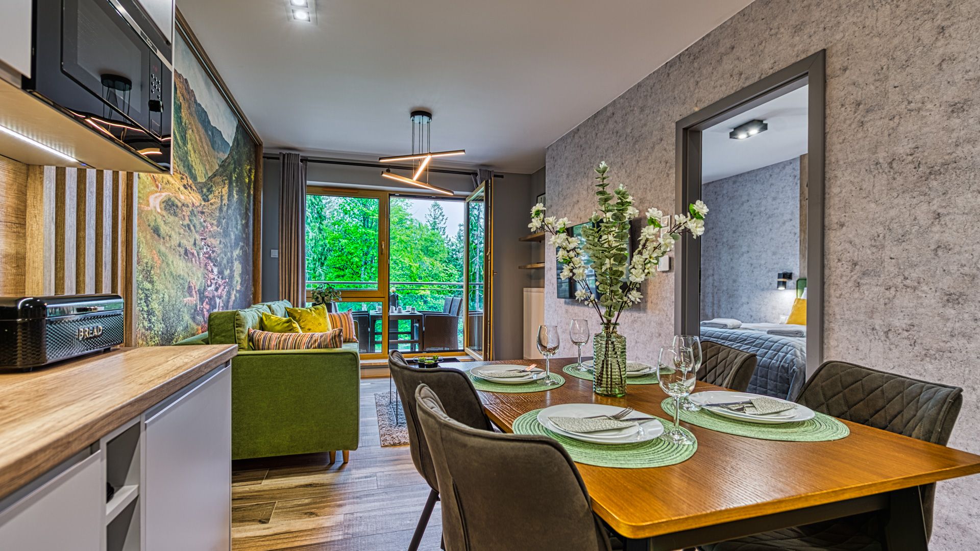 Po wejściu do apartamentu zostaniesz powitany przez przestronny salon z aneksem kuchennym. Salon został urządzony w nowoczesnym stylu z wygodną sofą. To idealne miejsce do relaksu i spędzania czasu w towarzystwie. Telewizor z płaskim ekranem oraz dostęp do Wi-Fi zapewnią rozrywkę i łączność podczas pobytu. W skład apartamentu wchodzą również książki i płyty DVD.