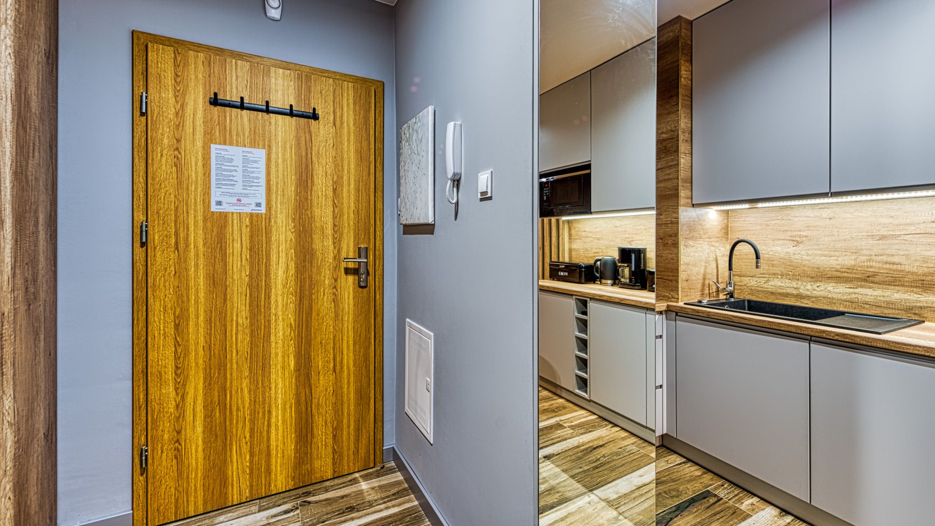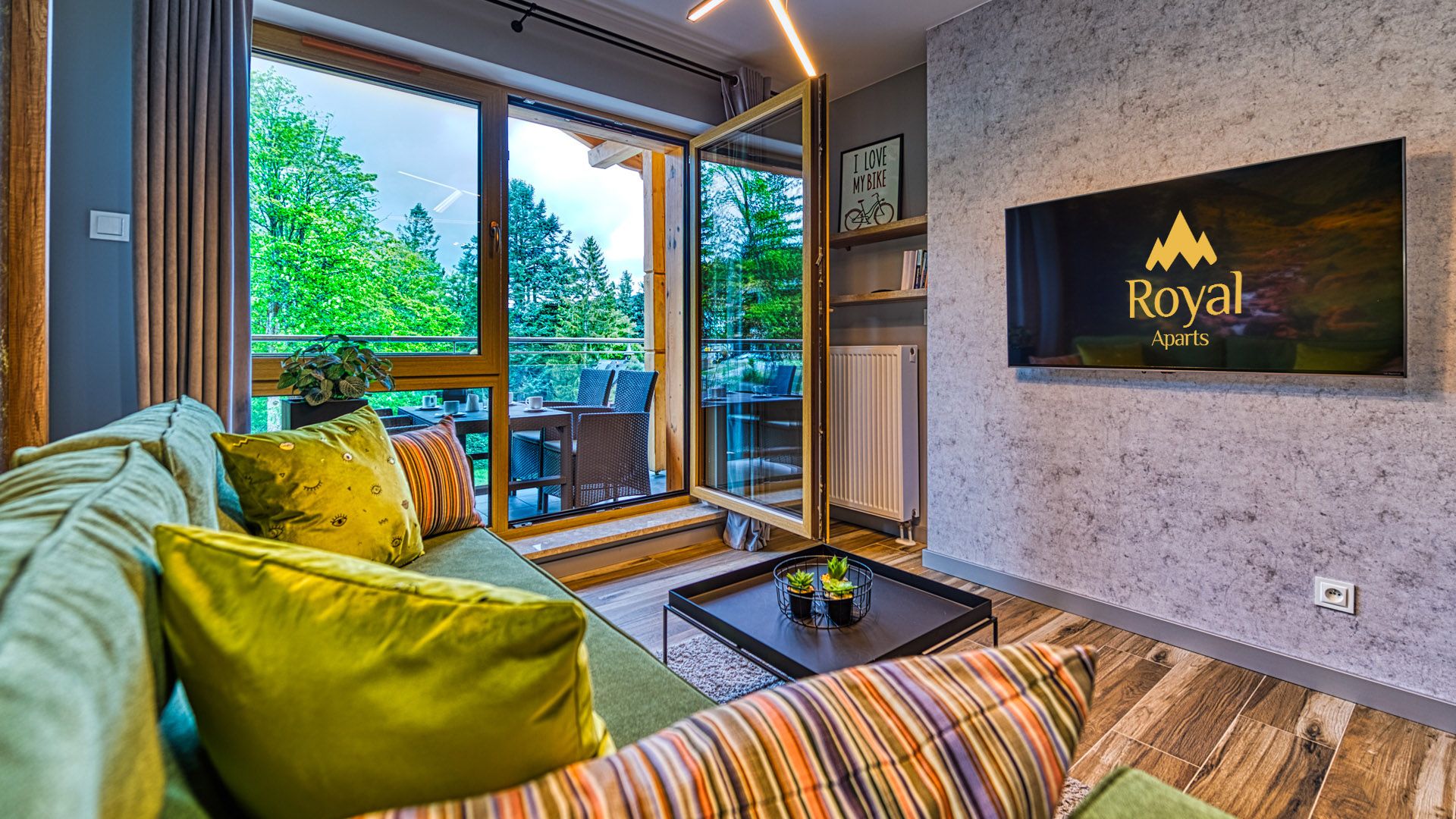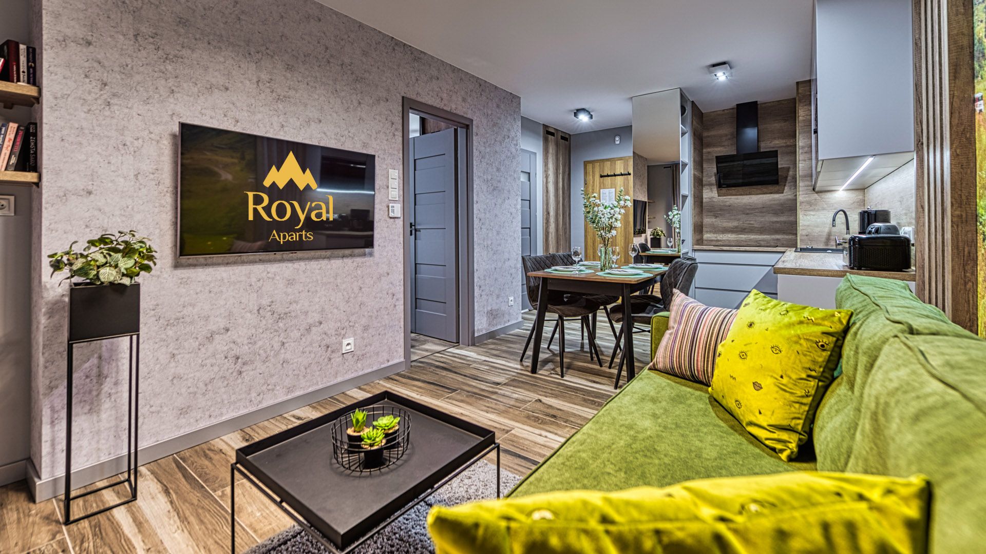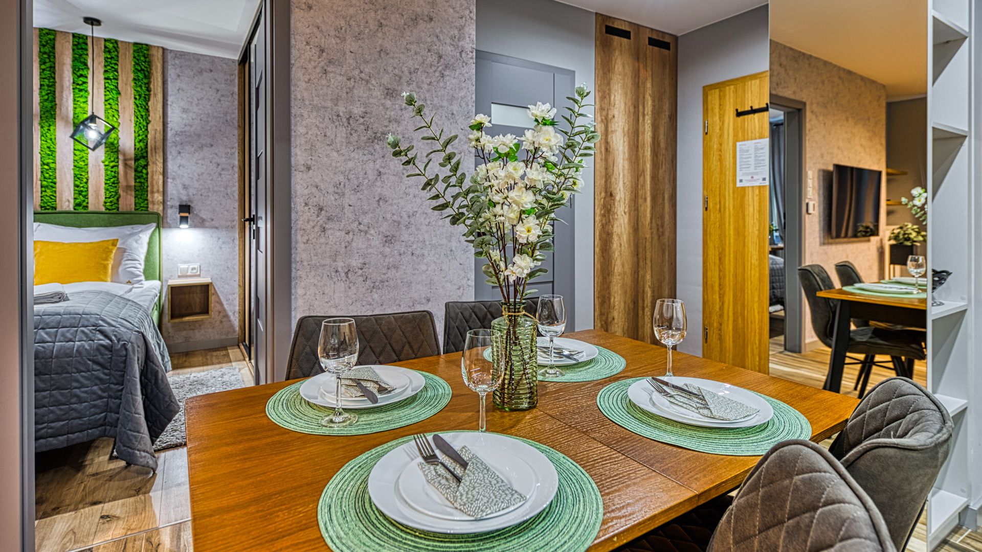 Po wejściu do apartamentu zostaniesz powitany przez przestronny salon z aneksem kuchennym. Salon został urządzony w nowoczesnym stylu z wygodną sofą. To idealne miejsce do relaksu i spędzania czasu w towarzystwie. Telewizor z płaskim ekranem oraz dostęp do Wi-Fi zapewnią rozrywkę i łączność podczas pobytu. W skład apartamentu wchodzą również książki i płyty DVD.