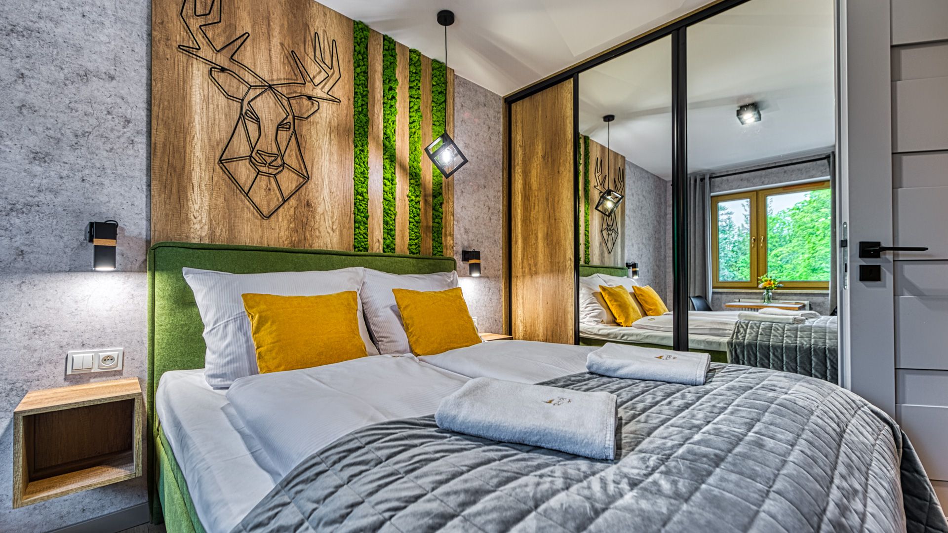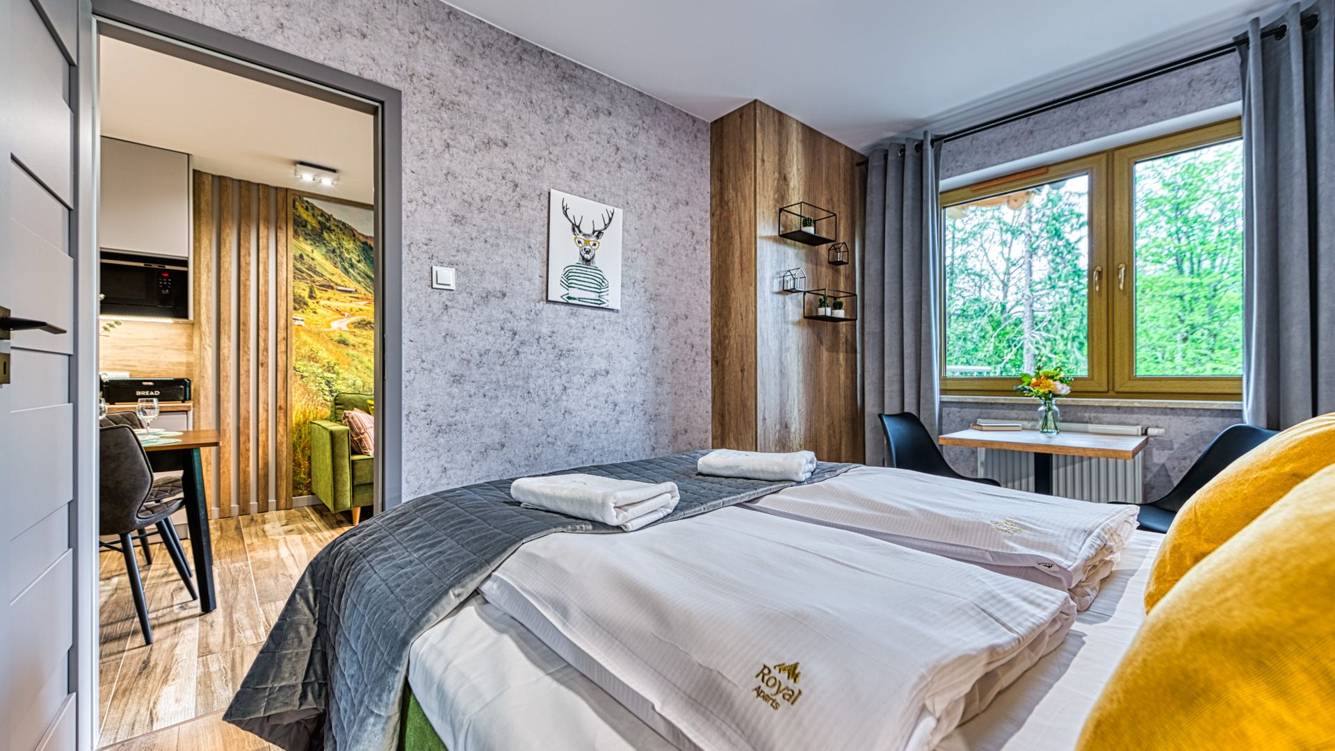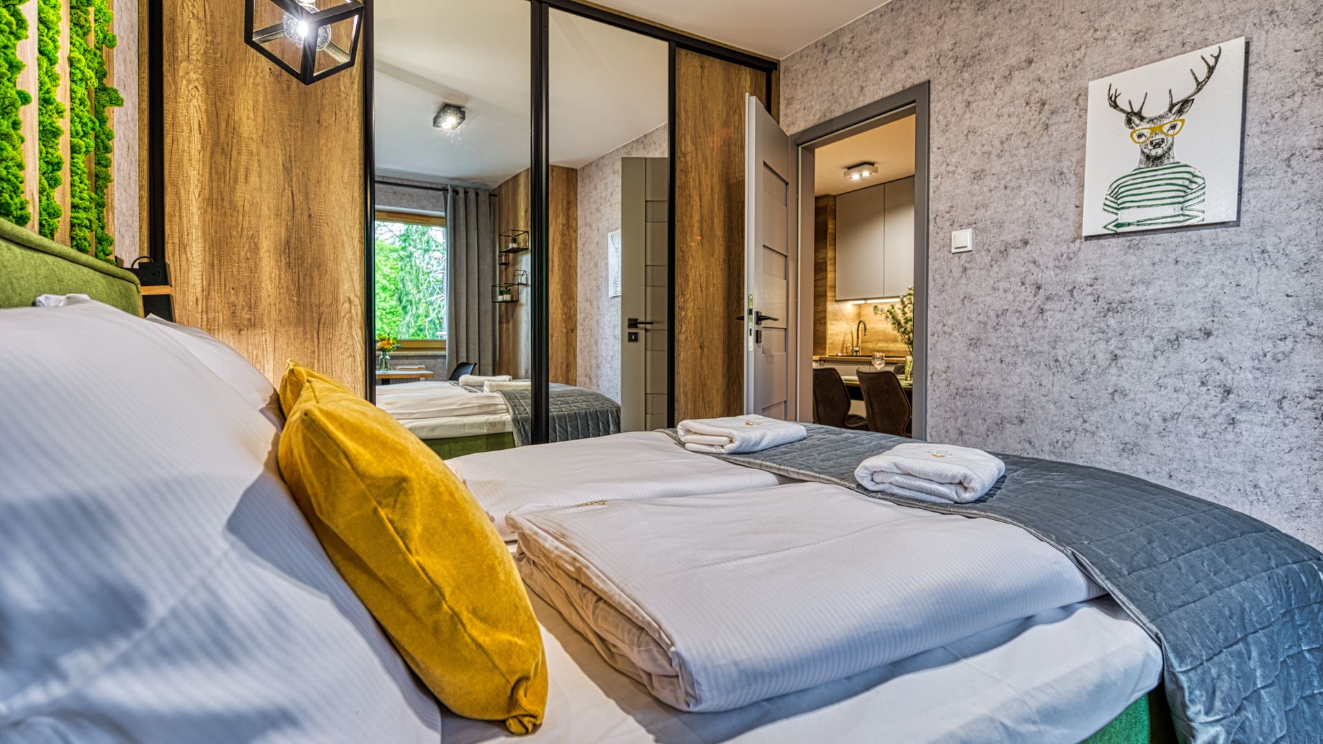 Apartament posiada również przytulną sypialnię, która zapewni komfortowy sen po dniu pełnym zwiedzania. Sypialnia jest wyposażona w wygodne dwuosobowe łóżko zachęcające do odpoczynku po długim dniu zwiedzania.
