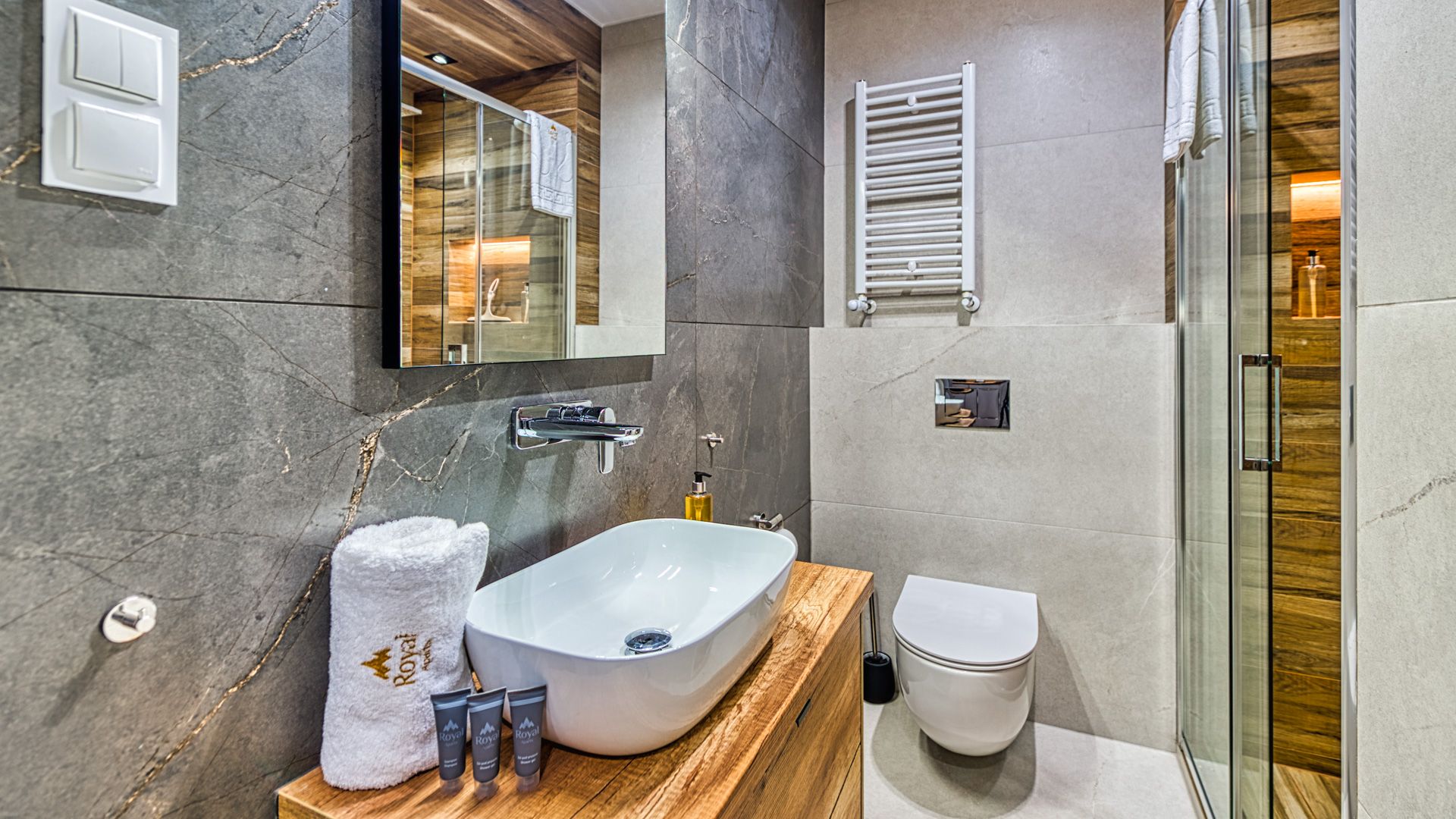 Łazienka apartamentu jest elegancka i wyposażona w prysznic, umywalkę i toaletę. Wszystkie niezbędne ręczniki i przybory toaletowe są dostępne na miejscu, aby zapewnić wygodę i komfort podczas pobytu.