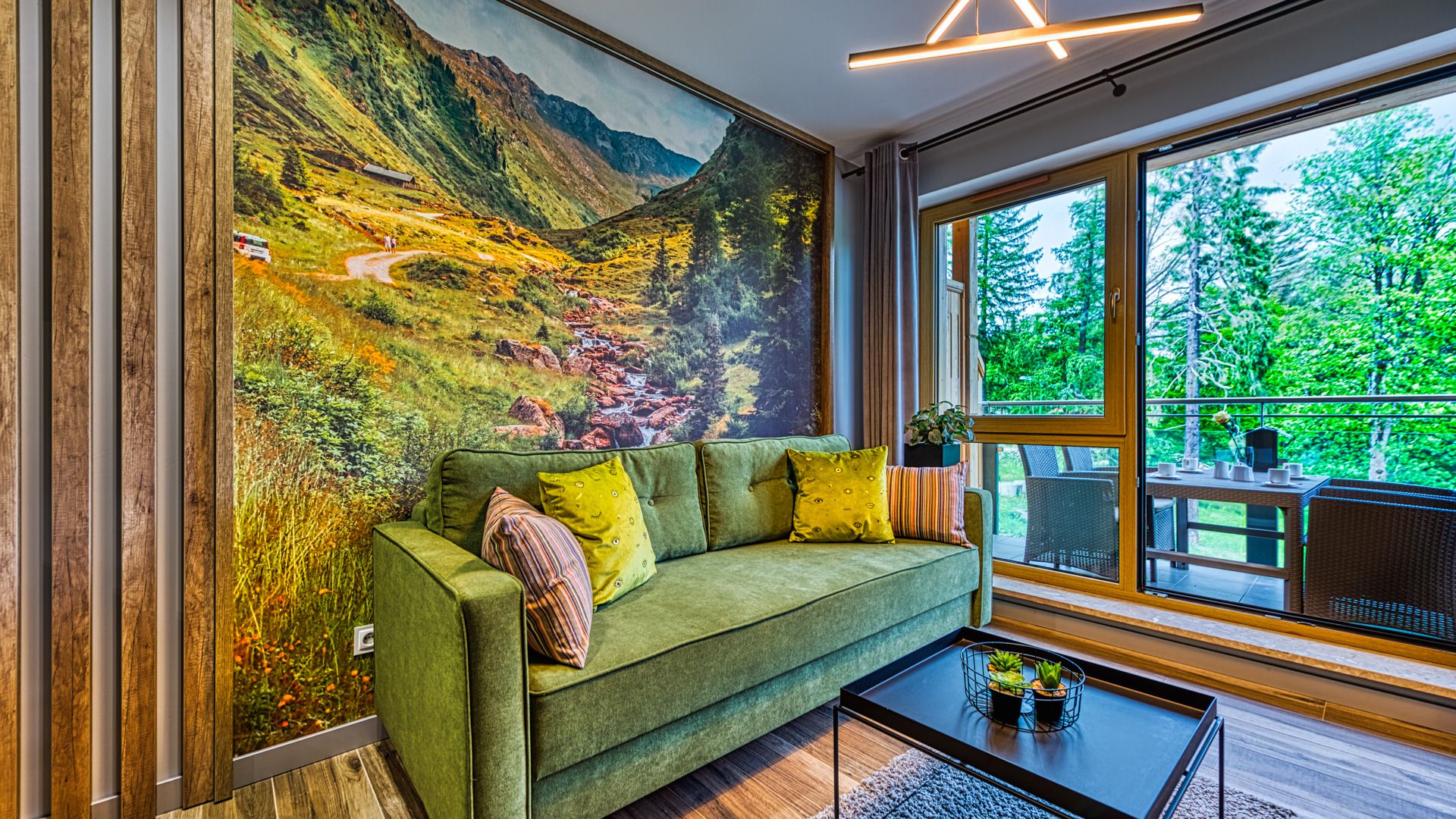 Apartament jest doskonale położony, w bliskiej odległości od restauracji, sklepów i innych atrakcji turystycznych. Dodatkowo, dla wygody naszych gości, dostępne jest miejsce parkingowe w hali garażowej. Z tarasu apartamentu możemy dostrzec Wysoki Kamień - jeden z najpopularniejszych szczytów Gór Izerskich.