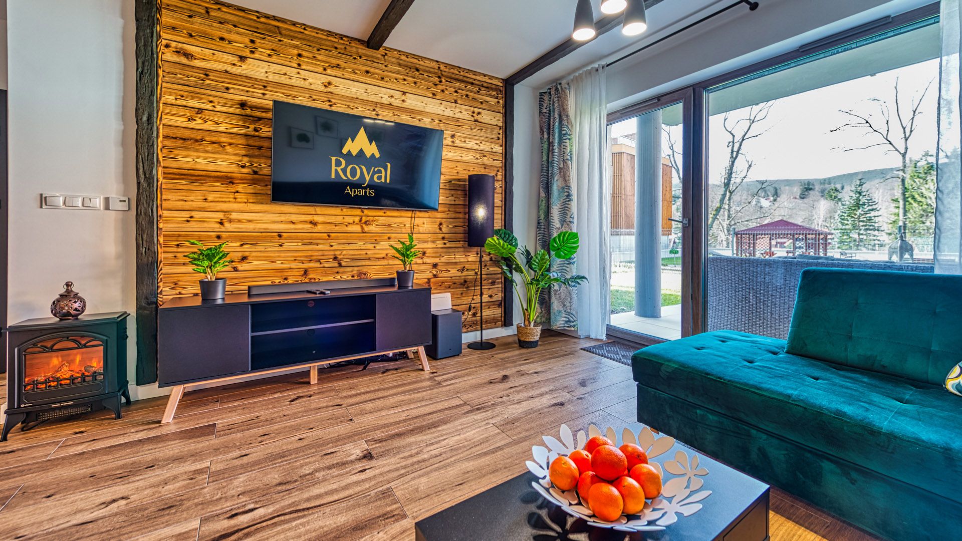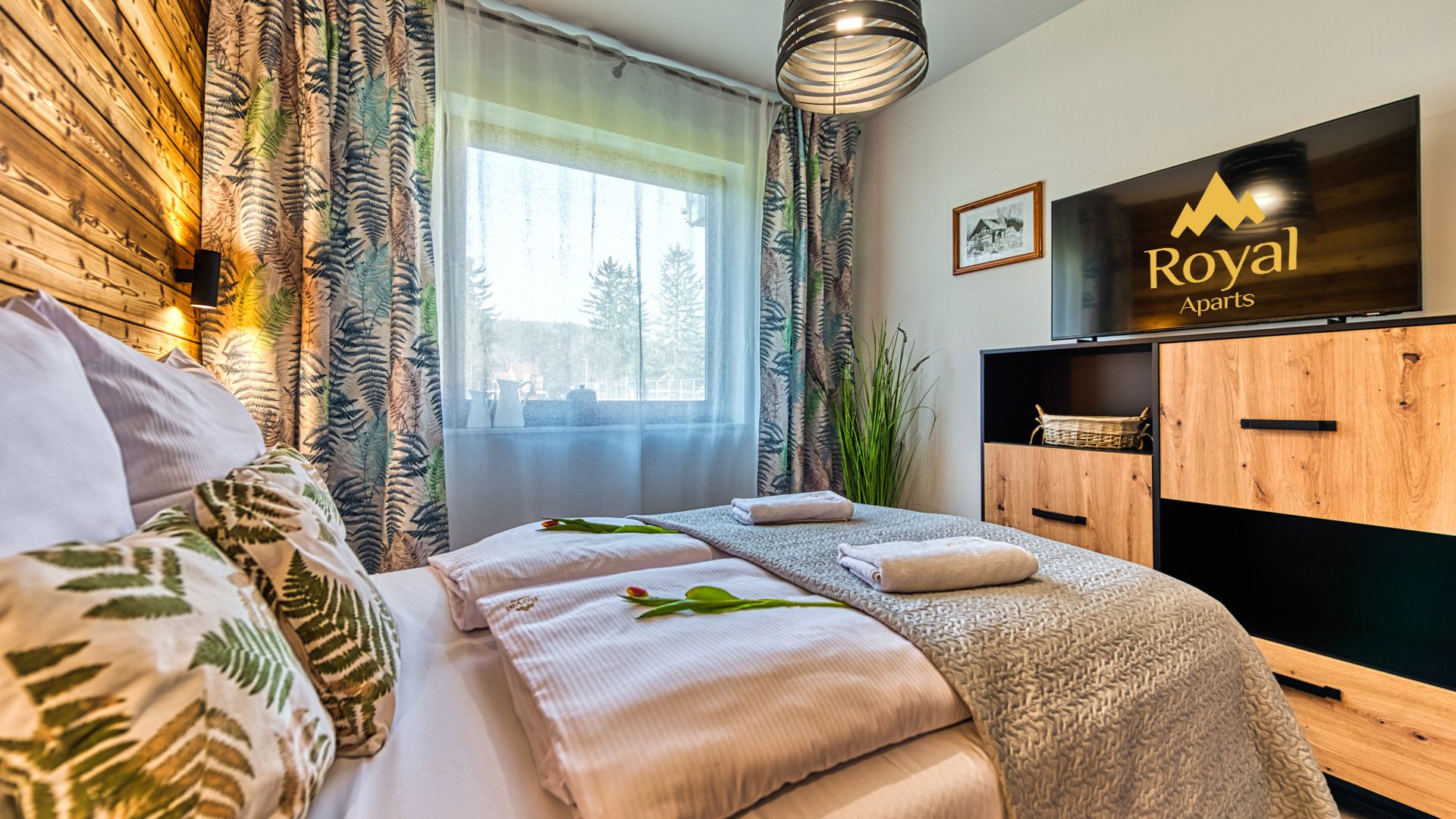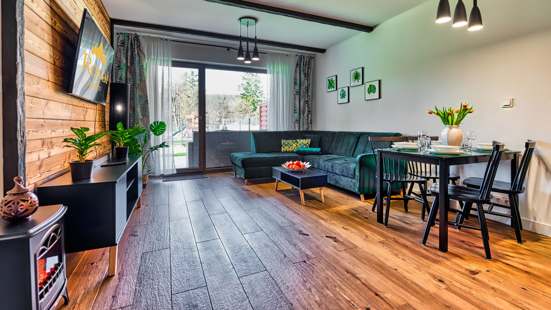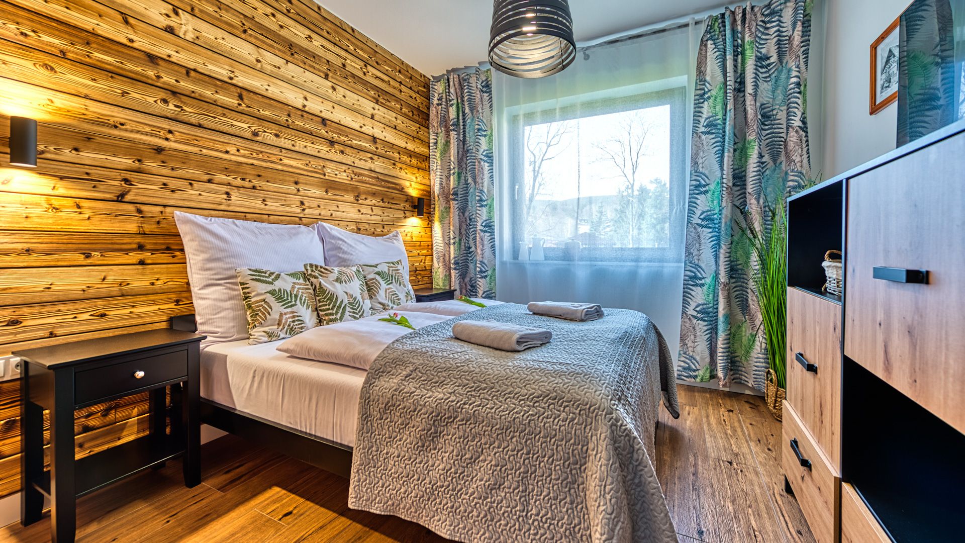 Prezentowany apartament jest częścią prestiżowego kompleksu Stone Hill w samym centrum Szklarskiej Poręby. To nowoczesny, czteroosobowy, w pełni wyposażony lokal o powierzchni 40m^2. W sypialni znajduje się duże łóżko małżeńskie, telewizor oraz obszerna szafa. Część dzienna apartamentu składa się z, salonu połączonego z aneksem kuchennym i wyposażona jest w rozkładaną sofę, panoramiczny telewizor, kominek i stół kuchenny. Całość domyka wykończona w wysokim standardzie łazienka.