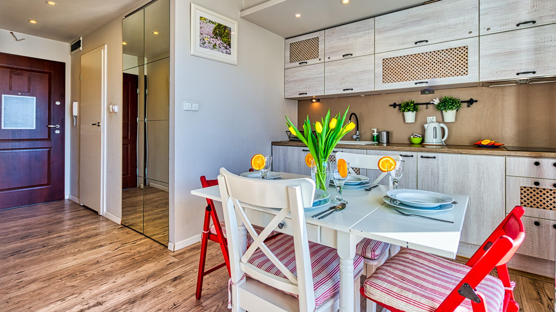 Aneks kuchenny został starannie wyposażony, zawierając niezbędne elementy do samodzielnego przygotowywania posiłków, takie jak czajnik, talerze, sztućce, płyta kuchenna, lodówka i opiekacz. Apartament wyposażono w telewizor oraz zapewniono bezpłatny dostęp do internetu WiFi.