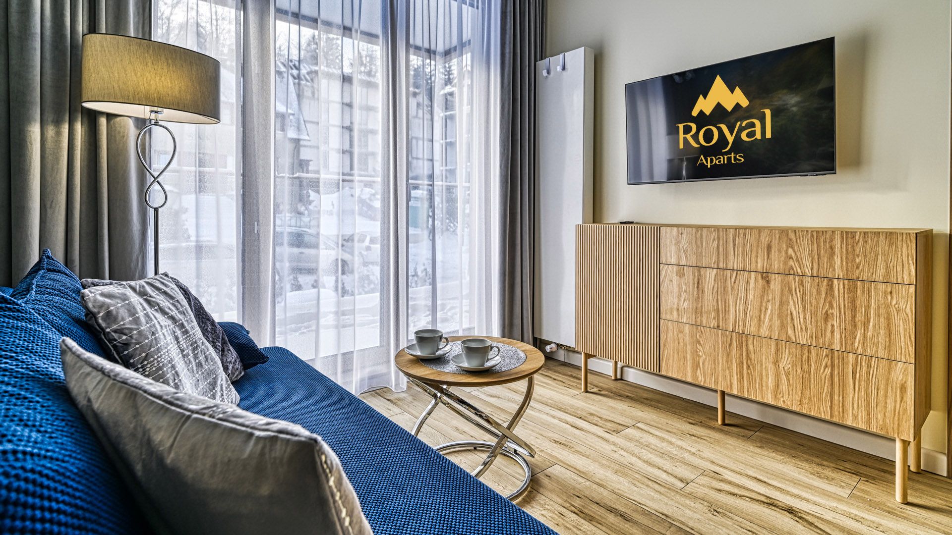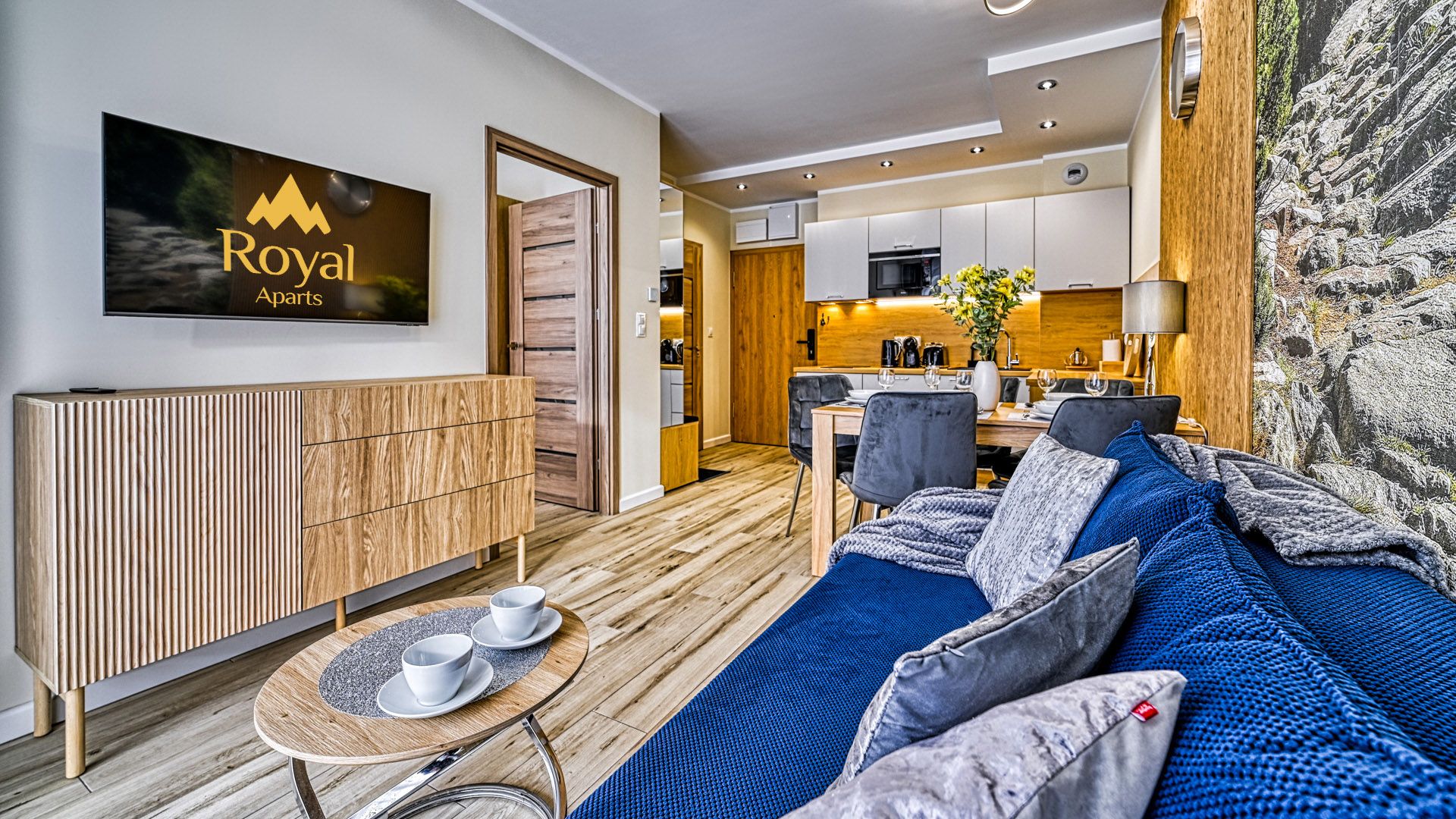Przestronny salon wyposażony jest w wygodną sofę oraz telewizor z dostępem do serwisu Netflix, co pozwala na relaks po dniu pełnym wrażeń. Z salonu można wyjść na balkon, który zapewnia dodatkowe miejsce do odpoczynku na świeżym powietrzu.