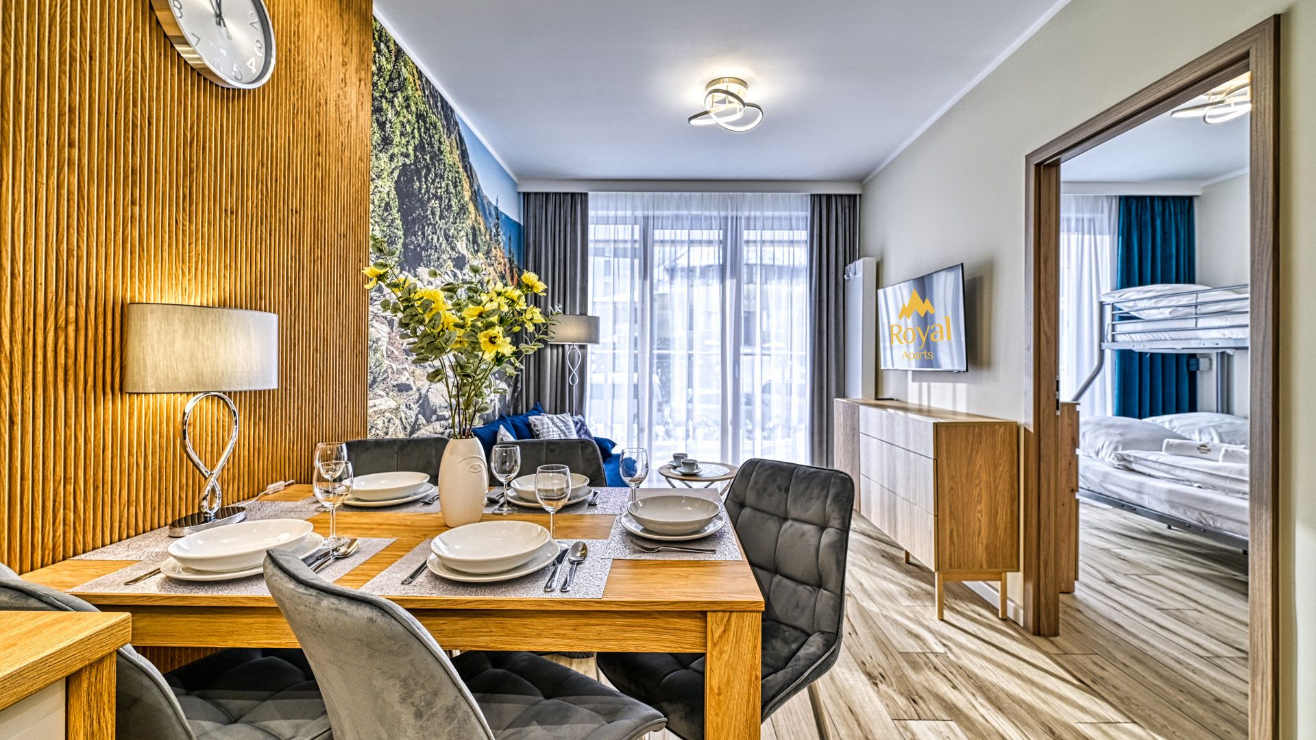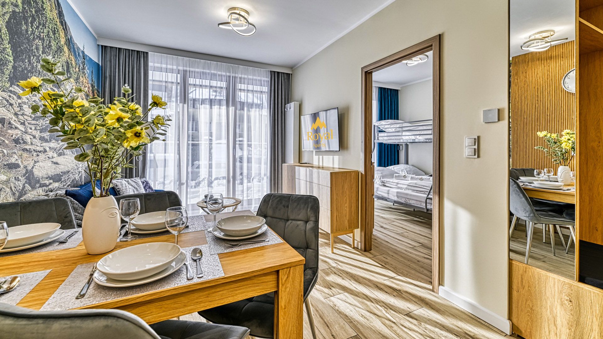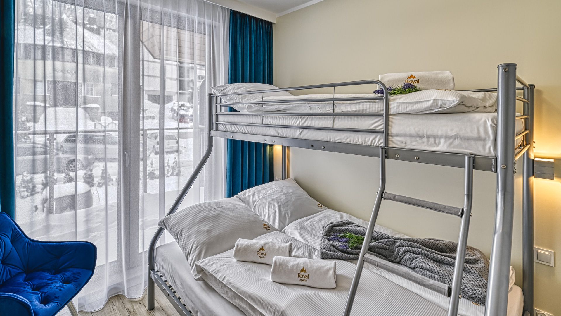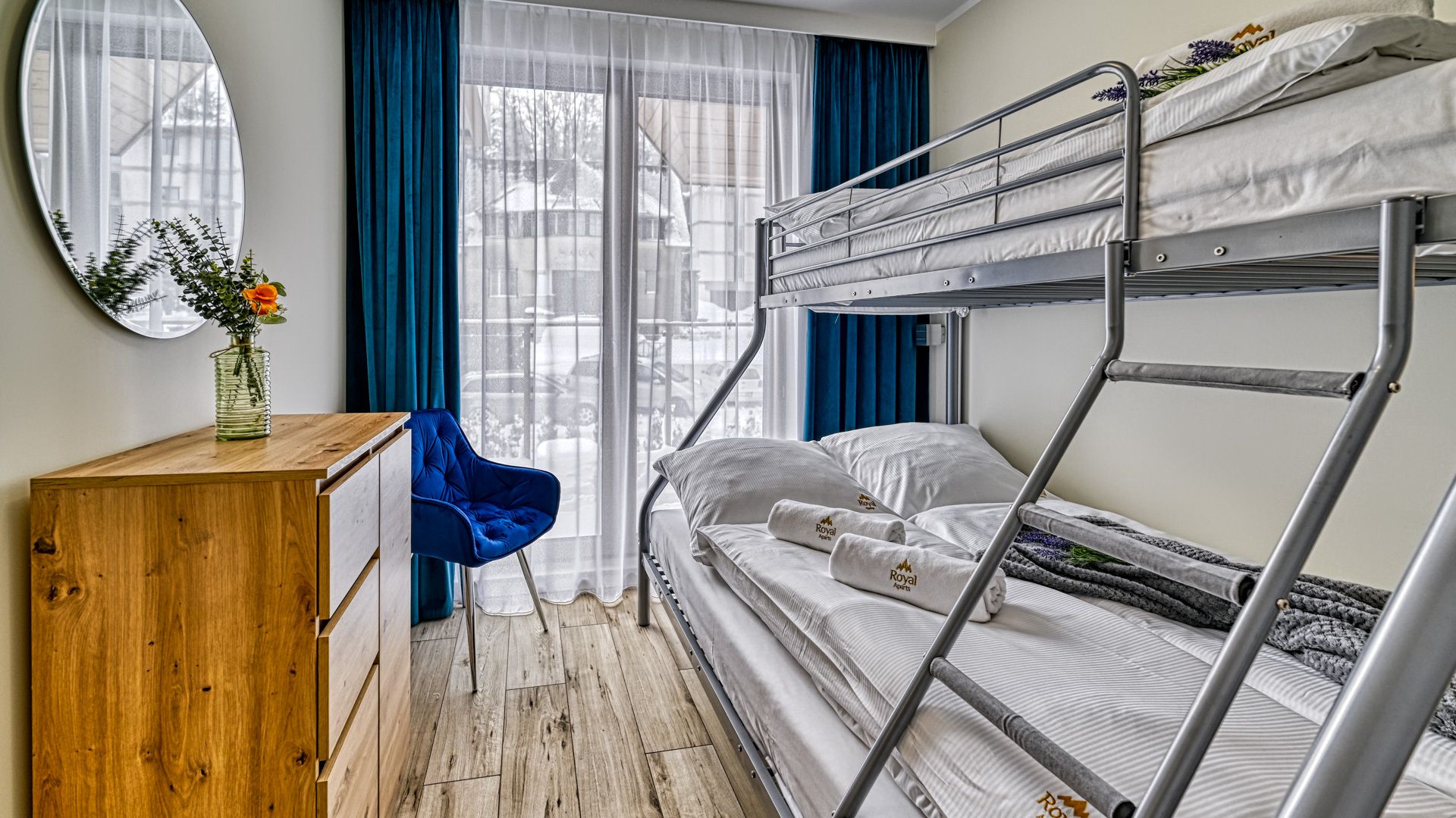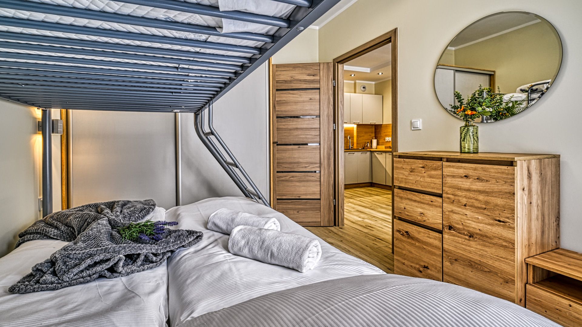 Apartament posiada jedną sypialnię z łóżkiem piętrowym, które pomieści trzy osoby, co czyni go idealnym rozwiązaniem dla rodzin z dziećmi lub grupy znajomych.