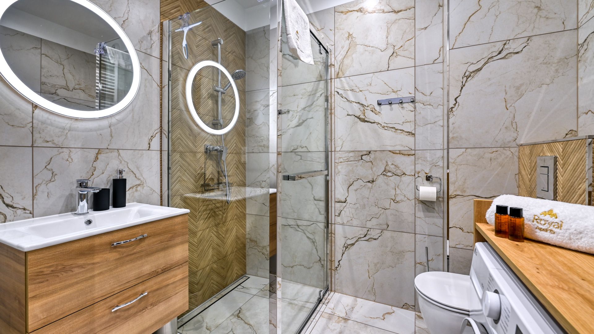 Elegancka łazienka wyposażona jest w przestronny prysznic oraz pralkę, co zwiększa wygodę podczas dłuższego pobytu.
