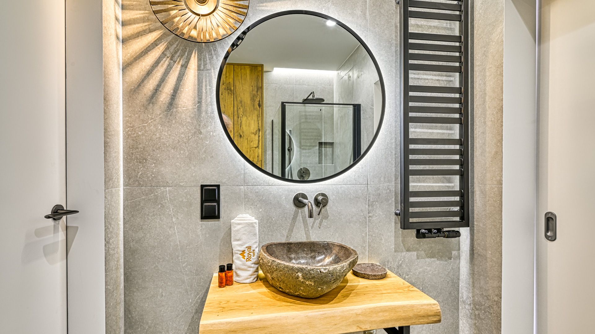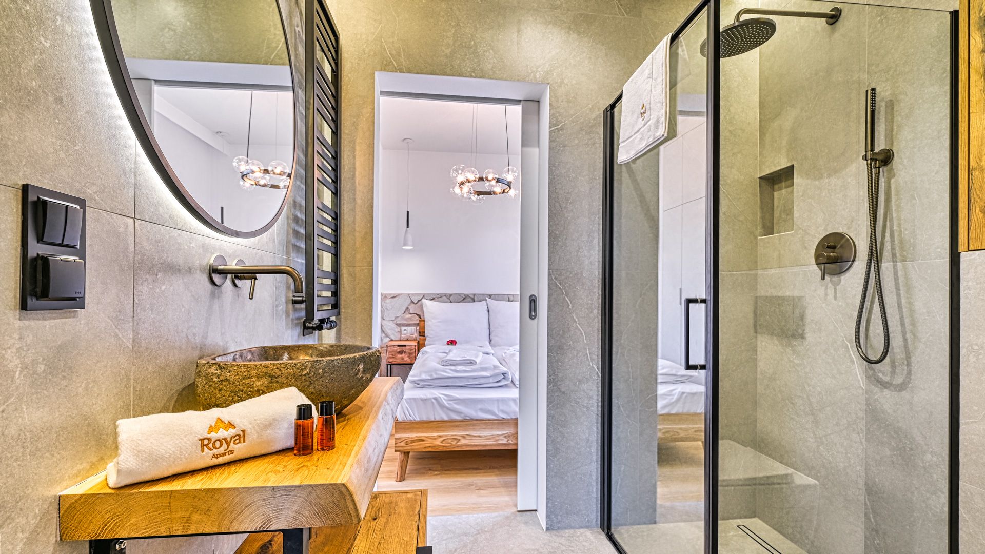 Elegancka łazienka wyposażona jest w przestronny prysznic oraz suszarkę, co zwiększa wygodę podczas dłuższego pobytu.