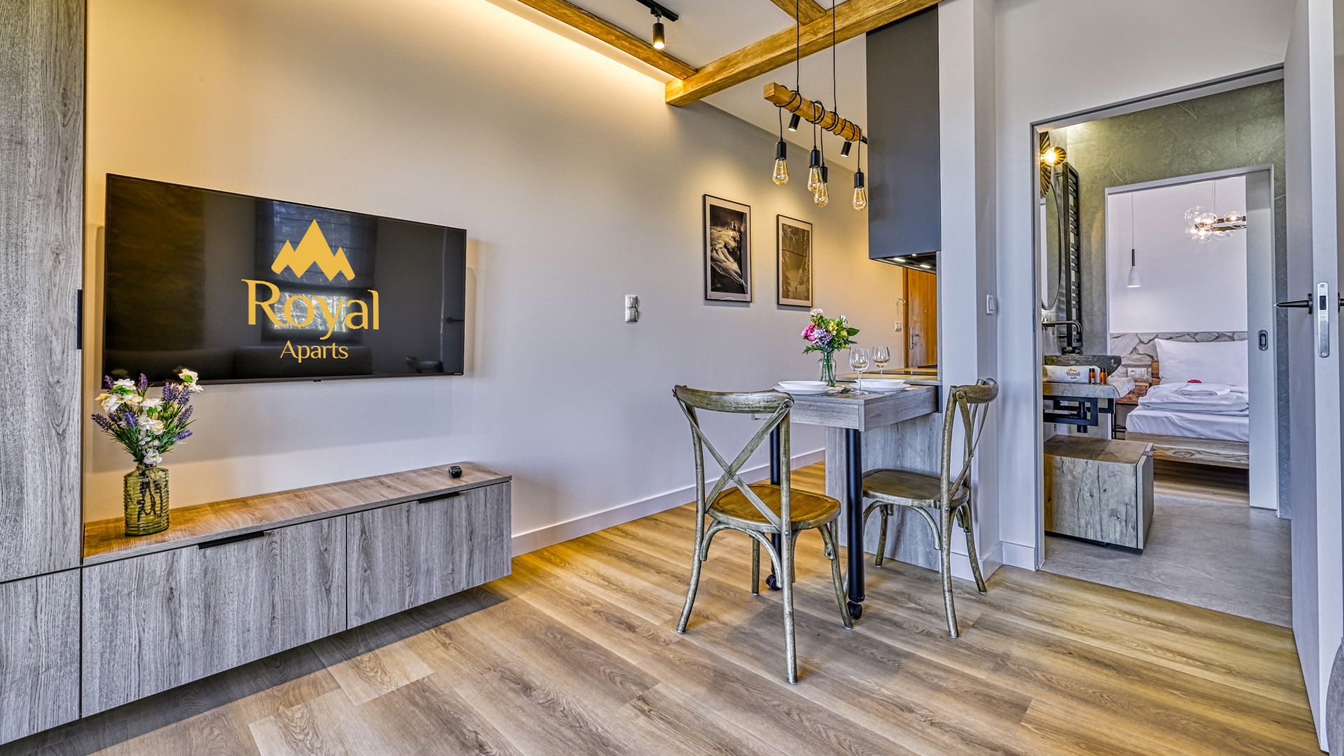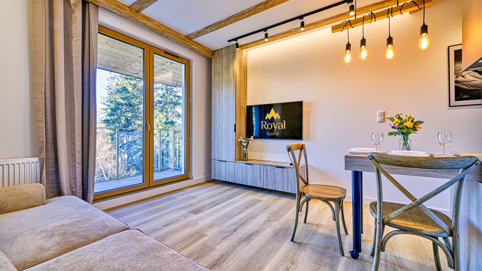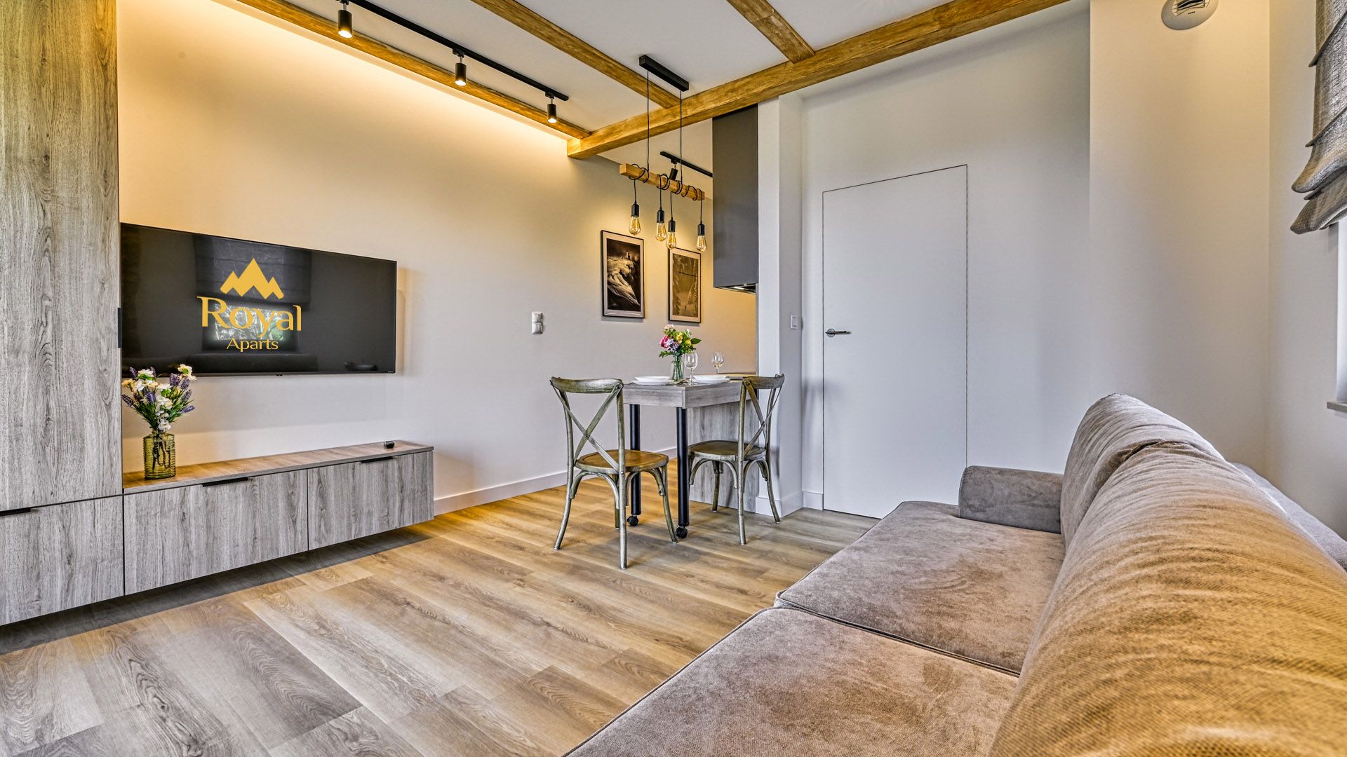 Przestronny salon wyposażony jest w wygodną sofę oraz telewizor z dostępem do serwisu Netflix, co pozwala na relaks po dniu pełnym wrażeń. Z salonu można wyjść na balkon, który zapewnia dodatkowe miejsce do odpoczynku na świeżym powietrzu.