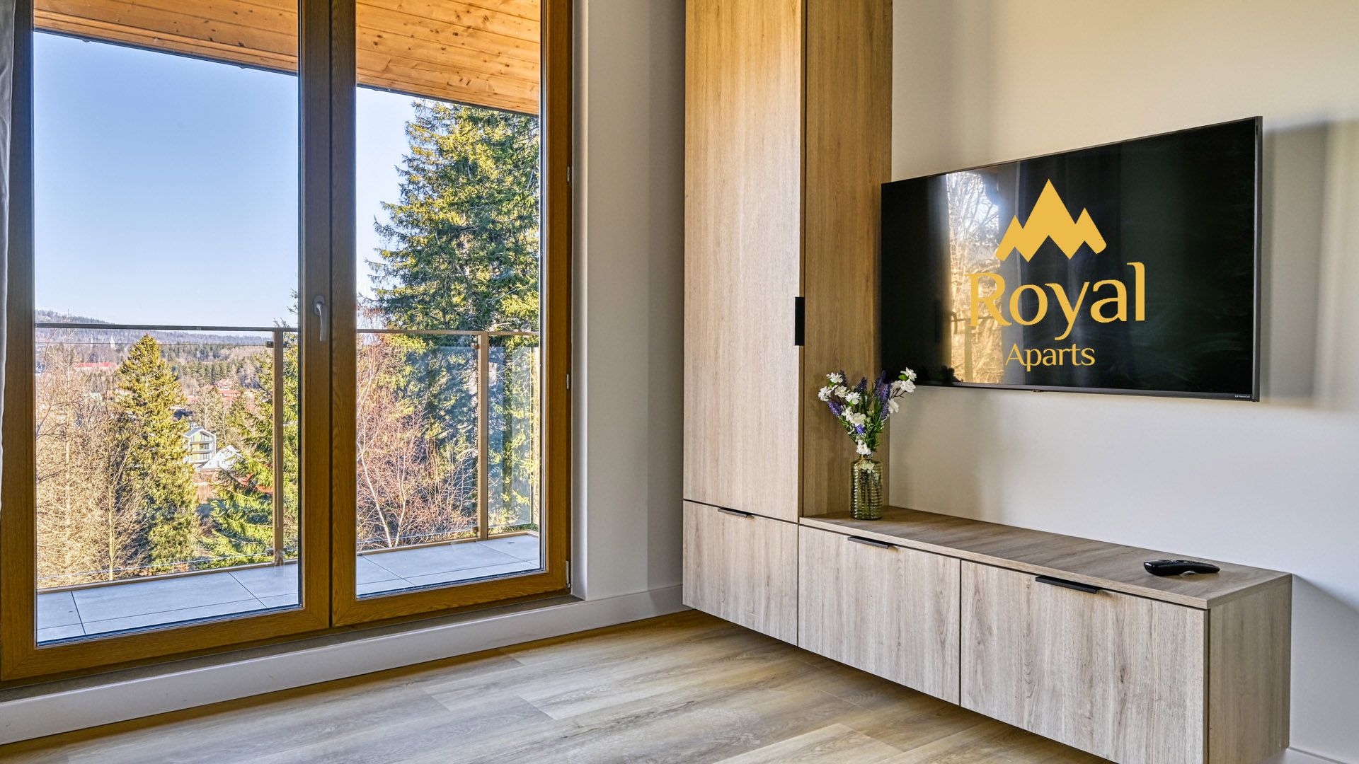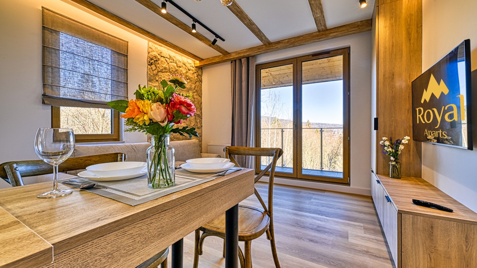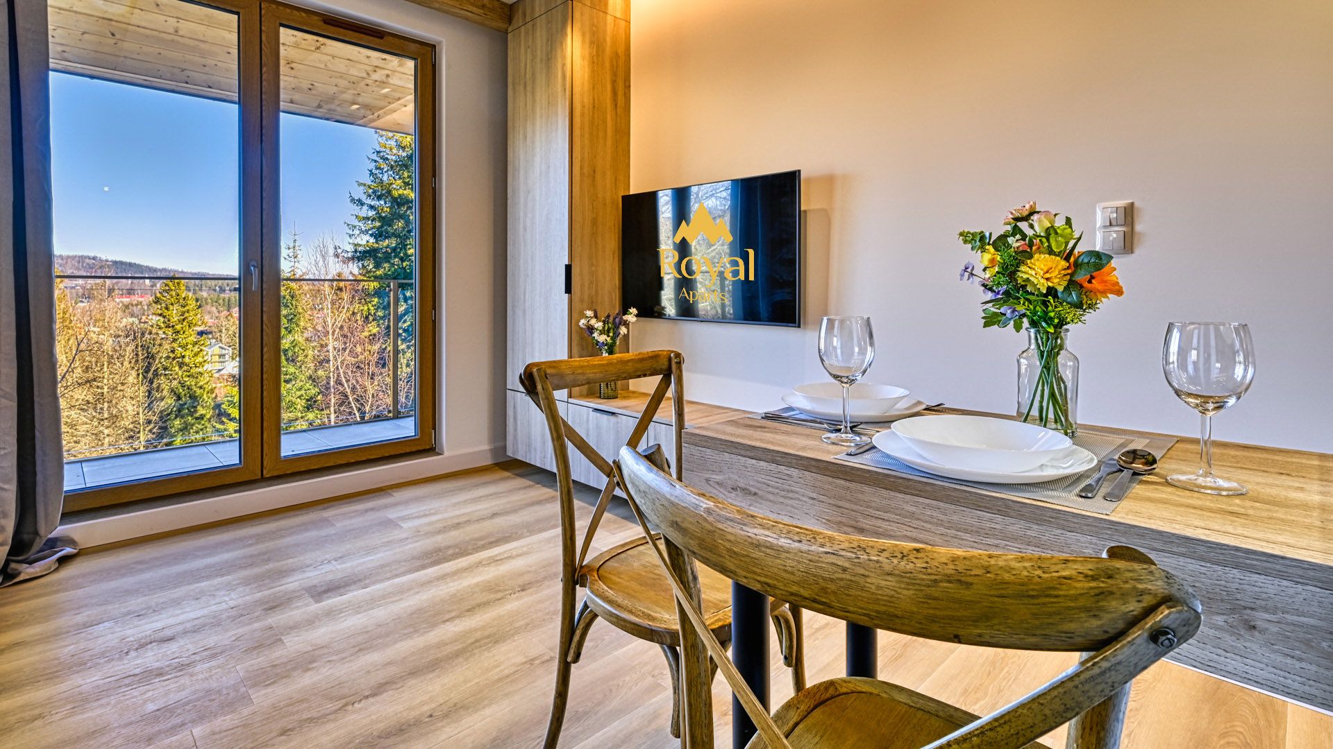 Przestronny salon wyposażony jest w wygodną sofę oraz telewizor z dostępem do serwisu Netflix, co pozwala na relaks po dniu pełnym wrażeń. Z salonu można wyjść na balkon, który zapewnia dodatkowe miejsce do odpoczynku na świeżym powietrzu.