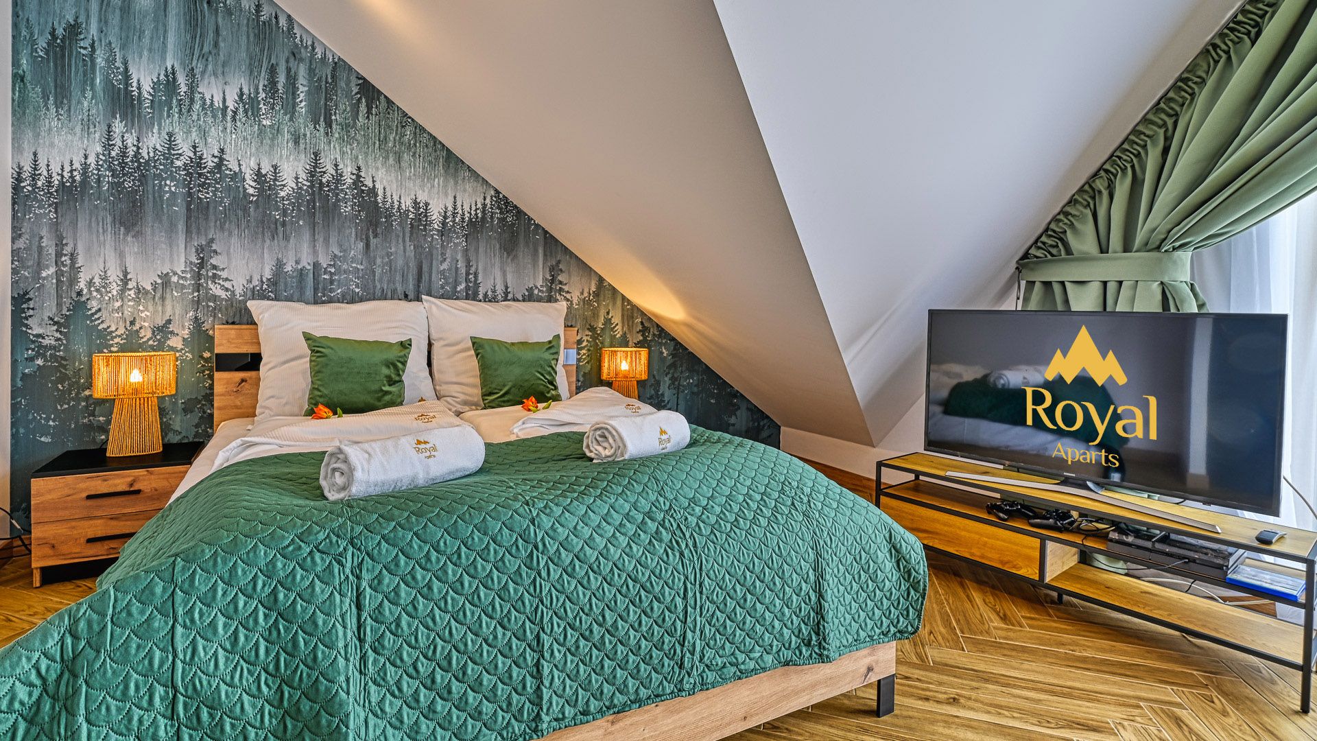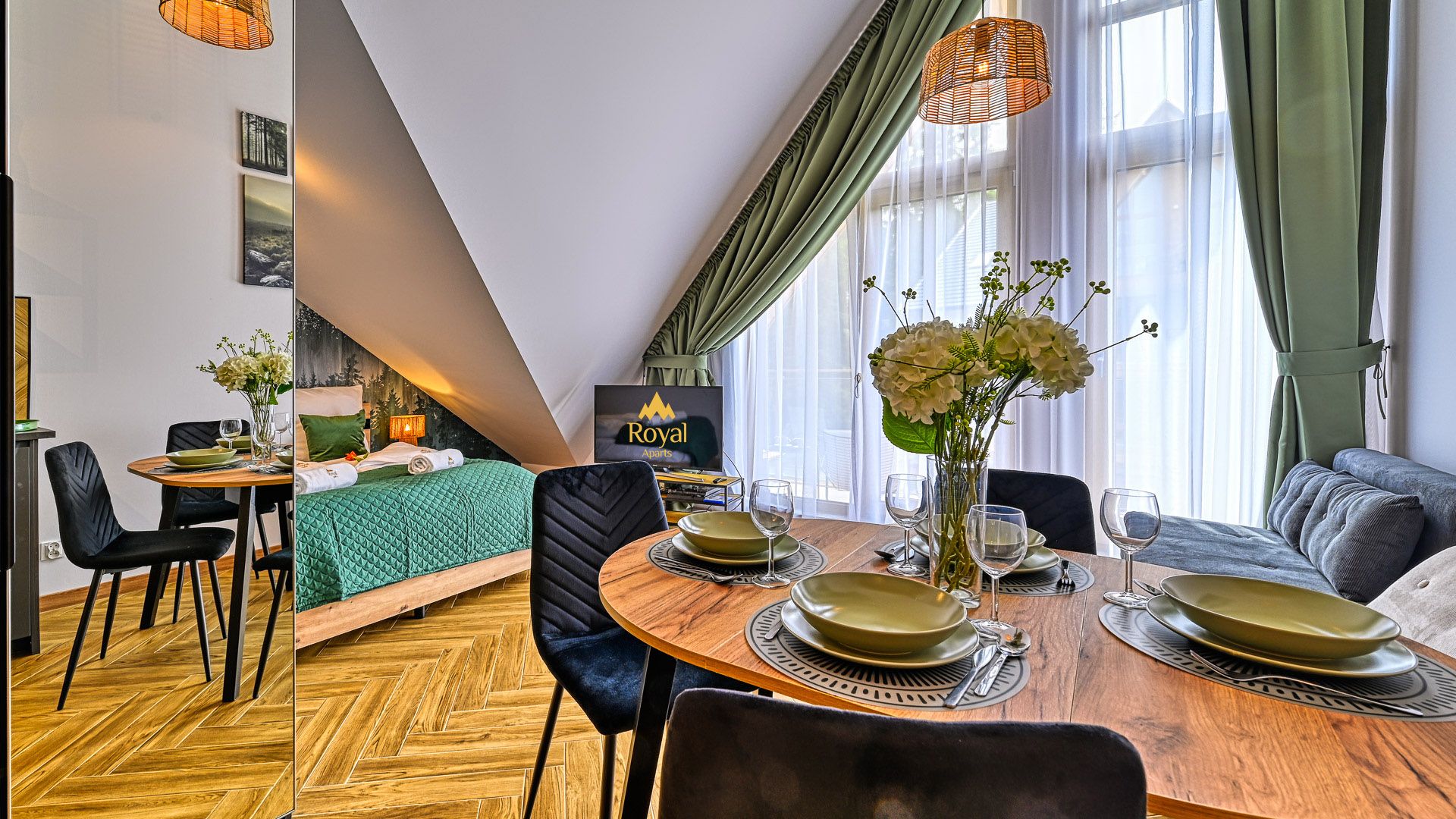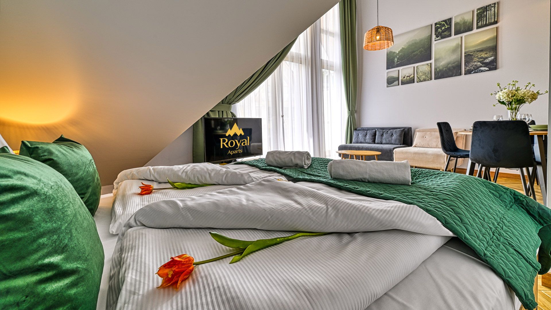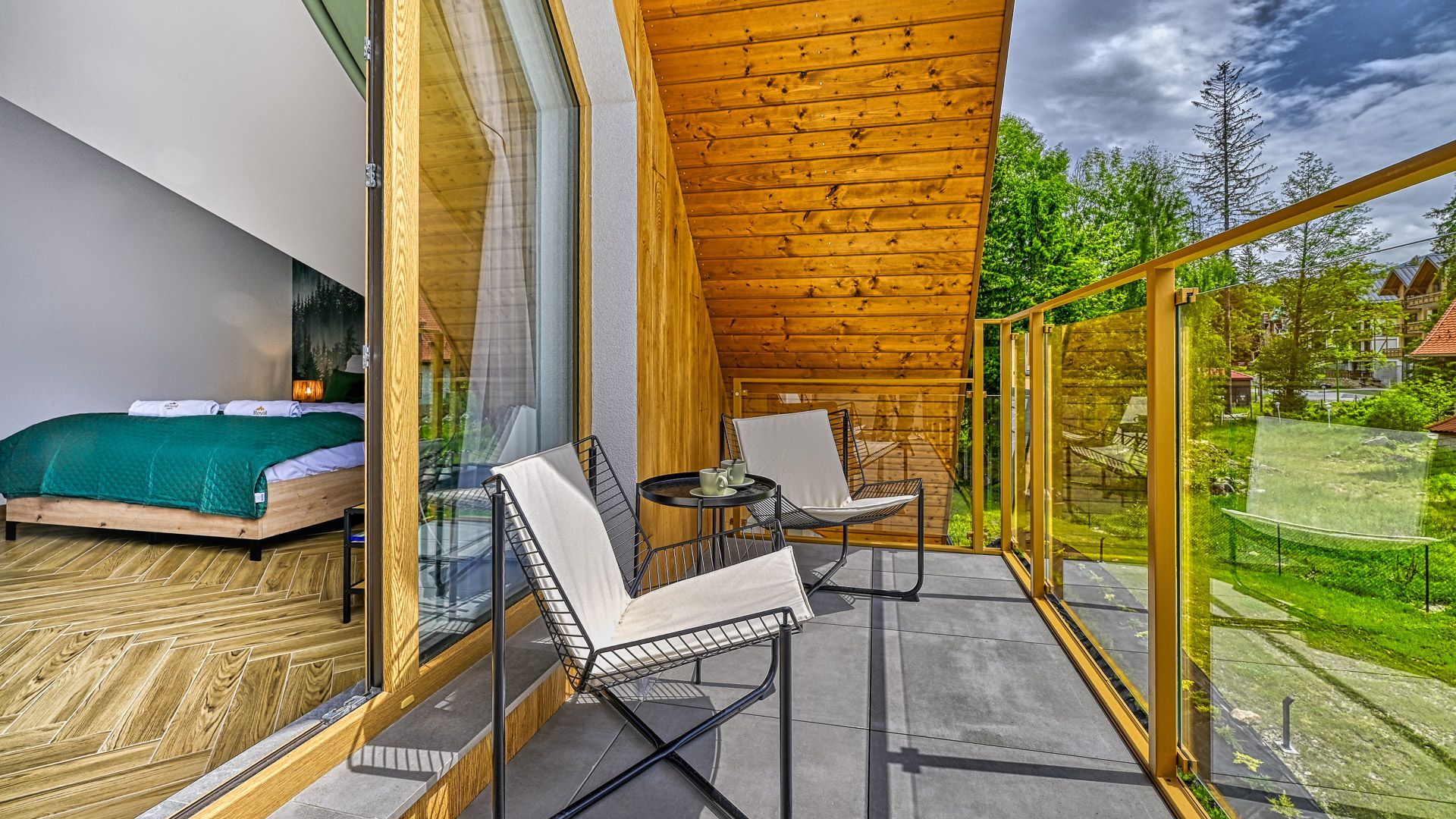 Przestronny salon pełni funkcję części wspólnej i sypialnianej. Znajdują się w nim dwa rozkładane fotele, które po rozłożeniu tworzą wygodne miejsca do spania, a także dwuosobowe łóżko. W salonie znajduje się również telewizor z dostępem do serwisu Netflix oraz konsola PlayStation 4, co pozwala na relaks i rozrywkę po dniu pełnym wrażeń. Z salonu można wyjść na balkon, który stanowi dodatkowe miejsce do odpoczynku na świeżym powietrzu.