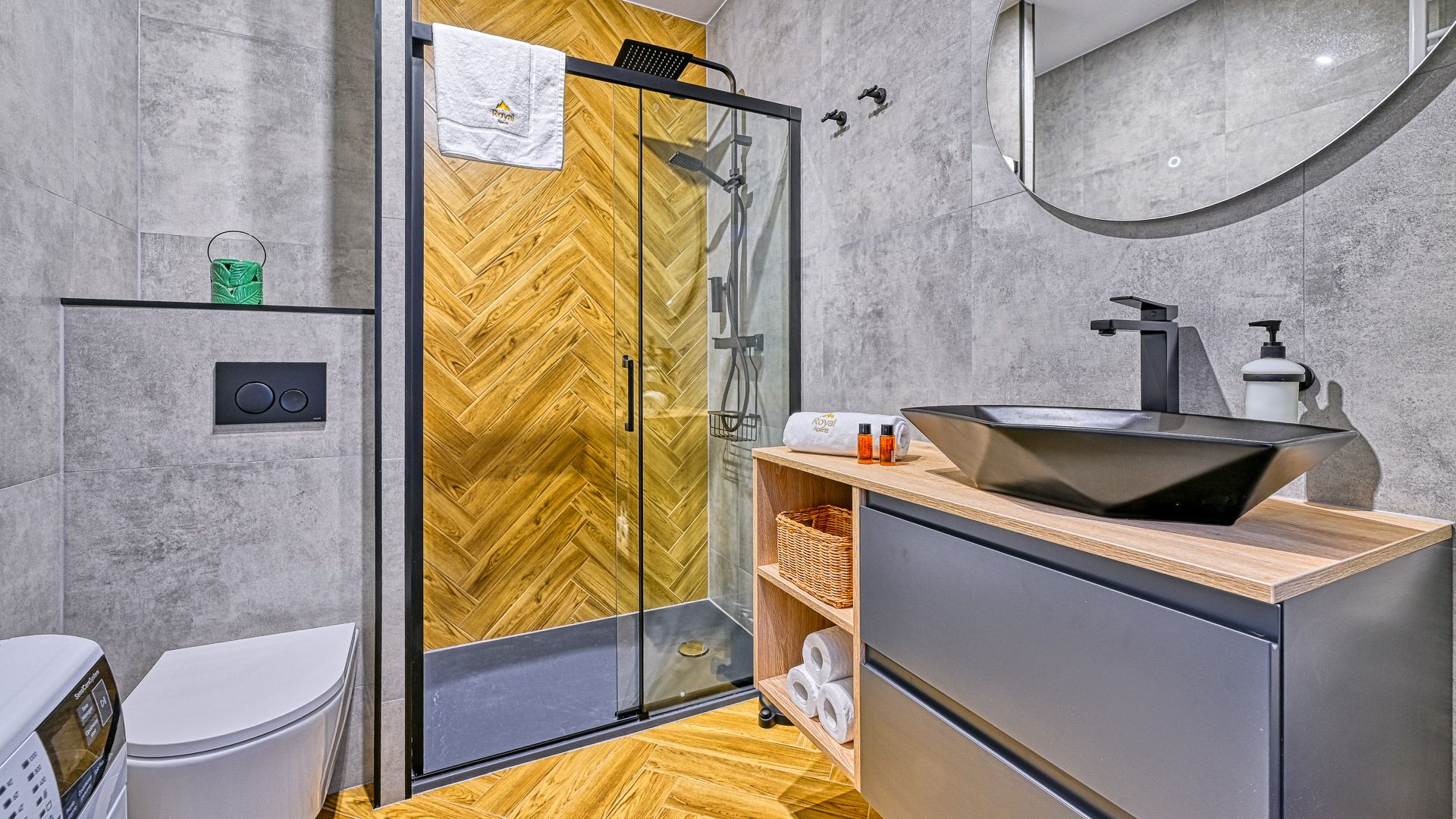Elegancka łazienka wyposażona jest w przestronny prysznic, pralkę oraz suszarkę do włosów, co zwiększa komfort podczas dłuższego pobytu.