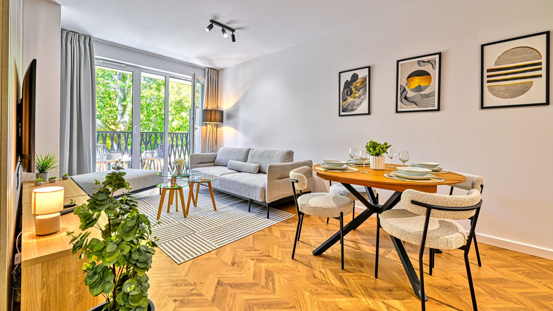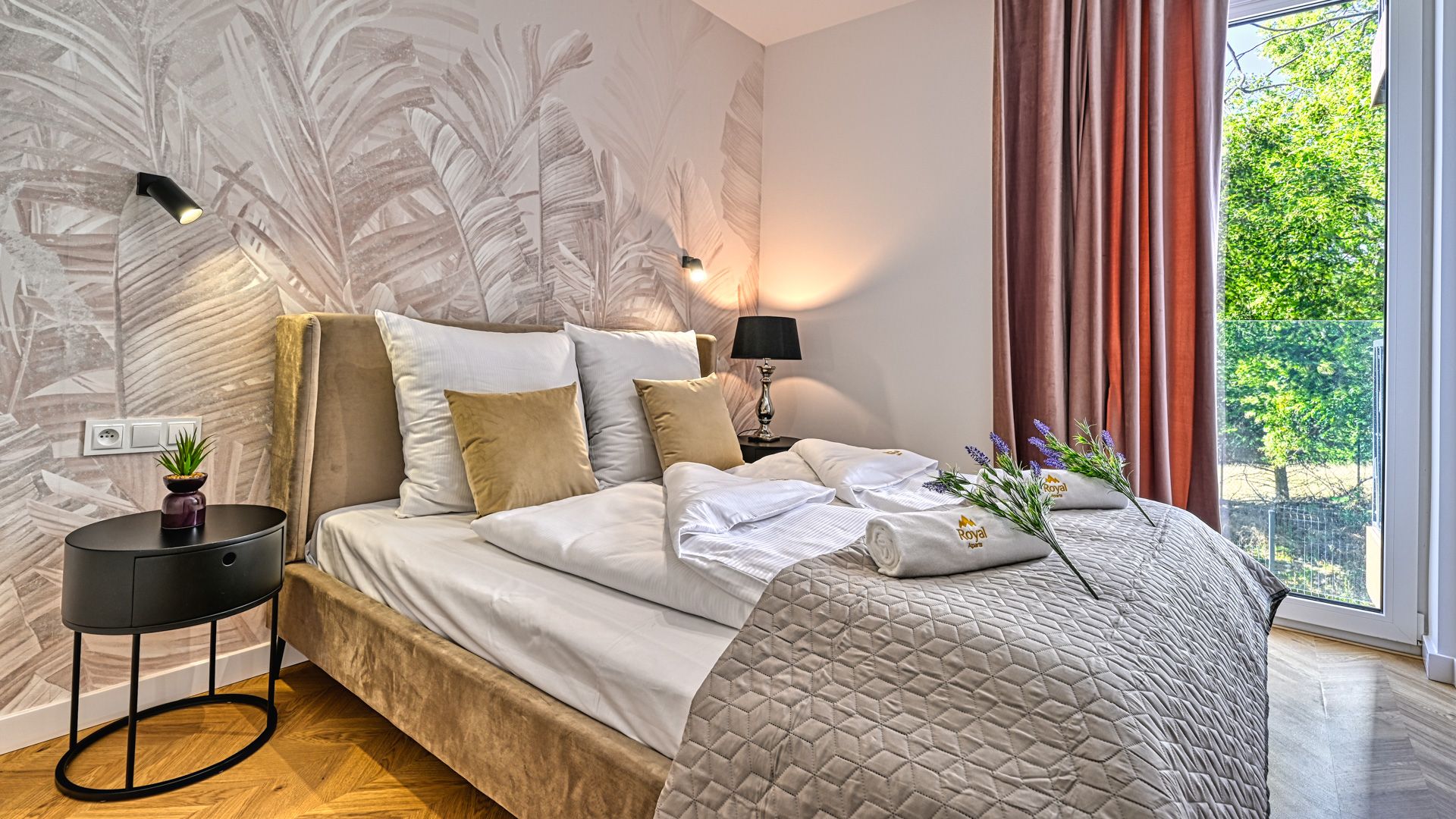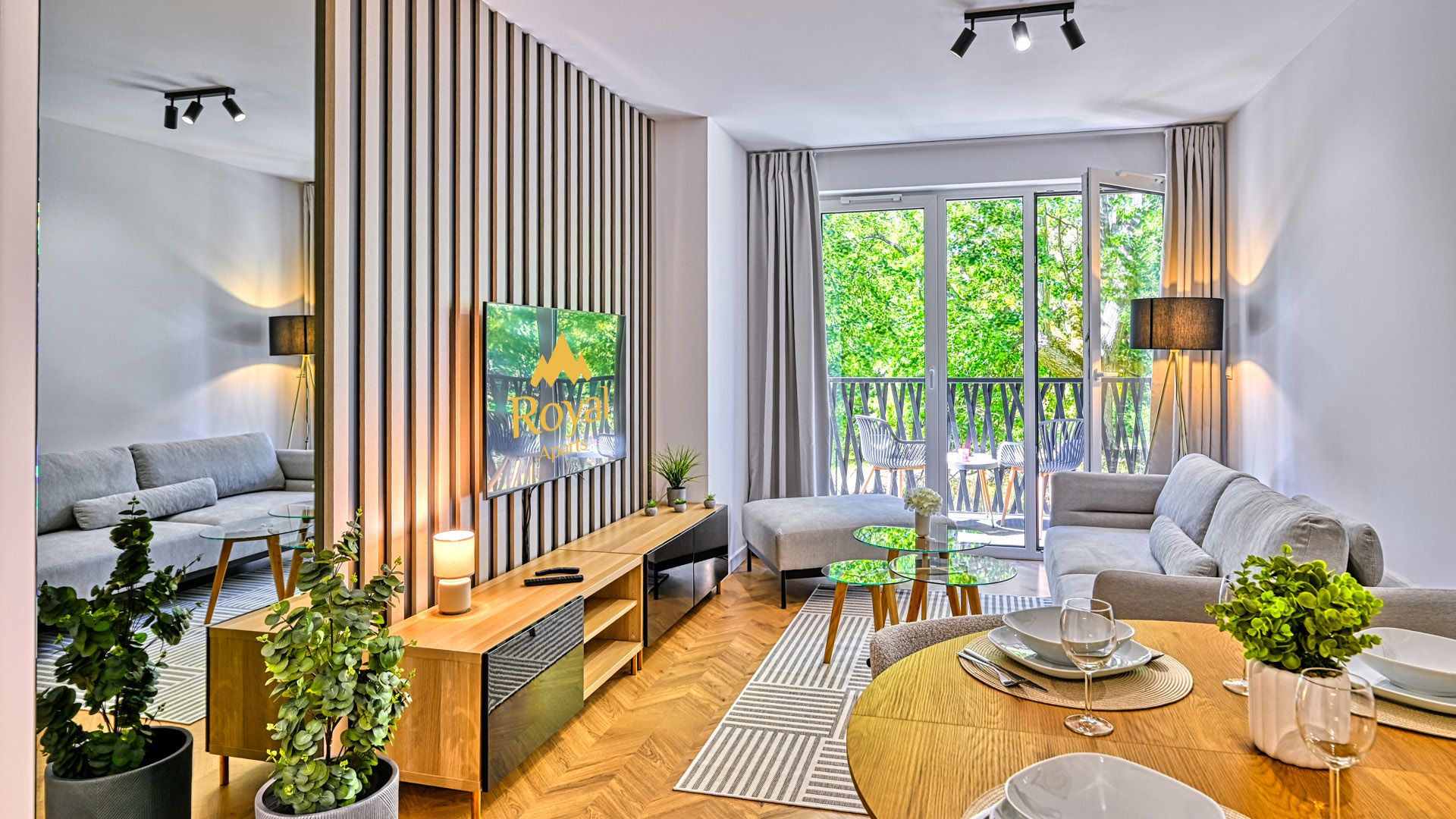 Apartament składa się z sypialni z wygodnym łóżkiem małżeńskim, przestronnego salonu z rozkładaną sofą, w pełni wyposażonego aneksu kuchennego oraz łazienki z prysznicem. Dodatkowym atutem jest balkon z meblami ogrodowymi, doskonały na poranną kawę lub relaks wieczorem.