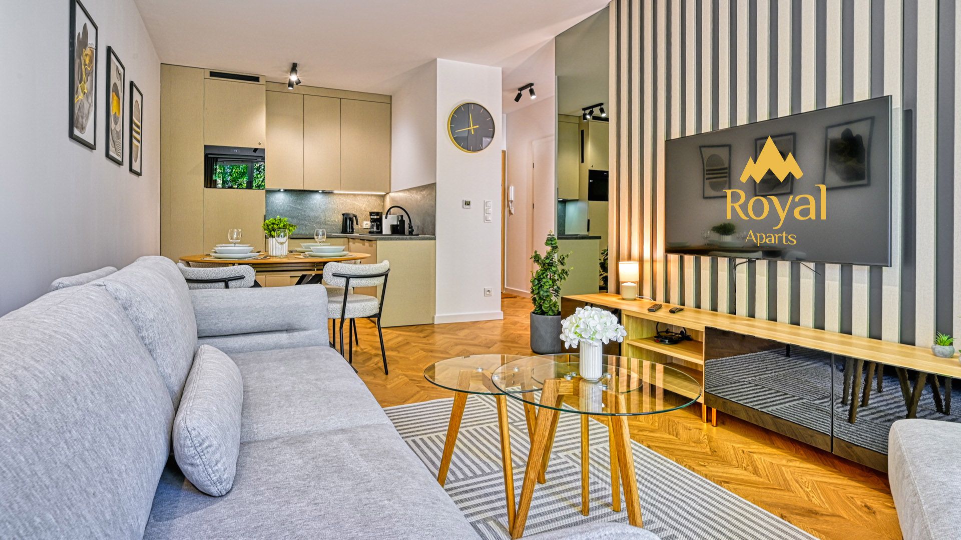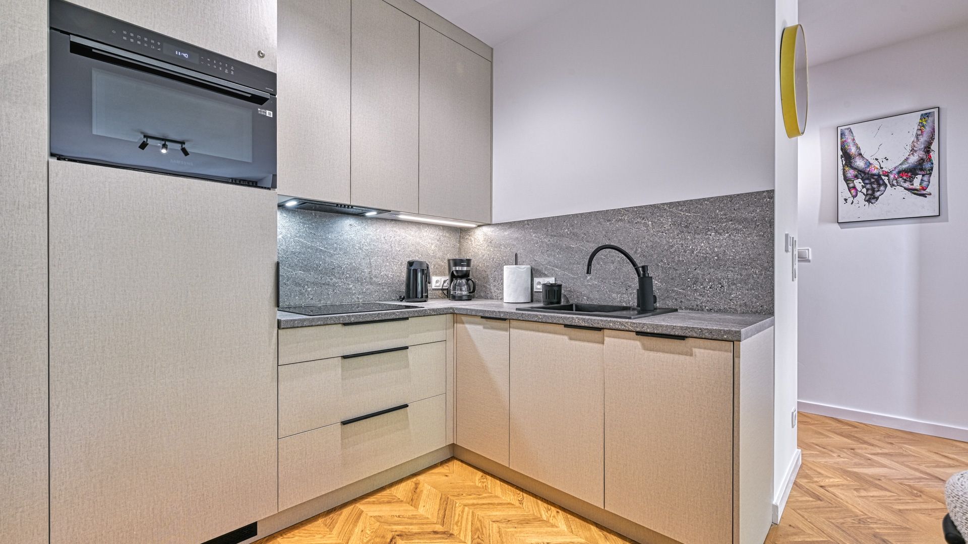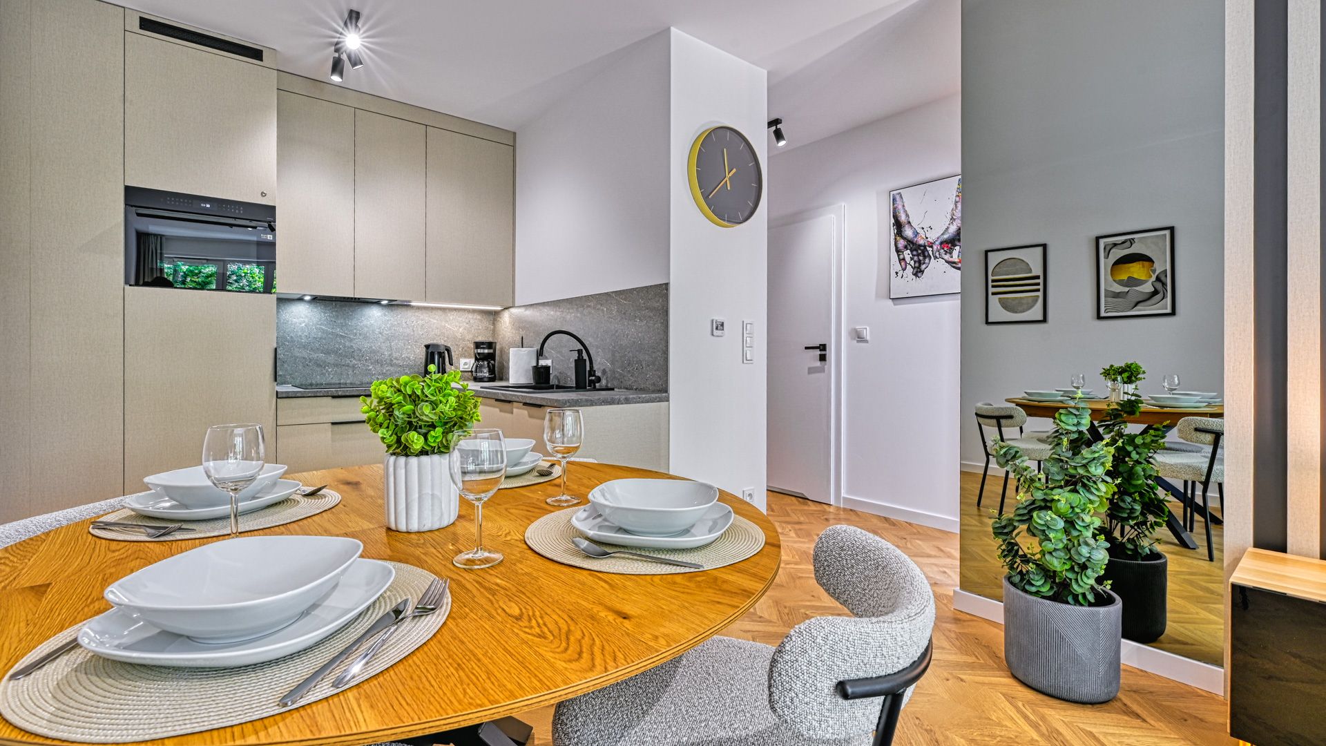 Na wyposażeniu znajduje się wszystko, co potrzebne do komfortowego pobytu: telewizor, bezpłatne Wi-Fi, ogrzewanie, pralka, suszarka do włosów, ręczniki oraz zestaw kosmetyków. Aneks kuchenny oferuje m.in. lodówkę, piekarnik, zmywarkę, ekspres do kawy, czajnik oraz komplet naczyń i sztućców. W budynku dostępna jest również winda, co zapewnia dodatkową wygodę.